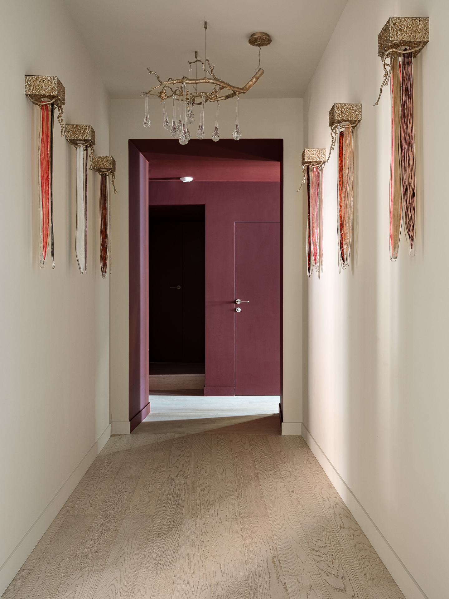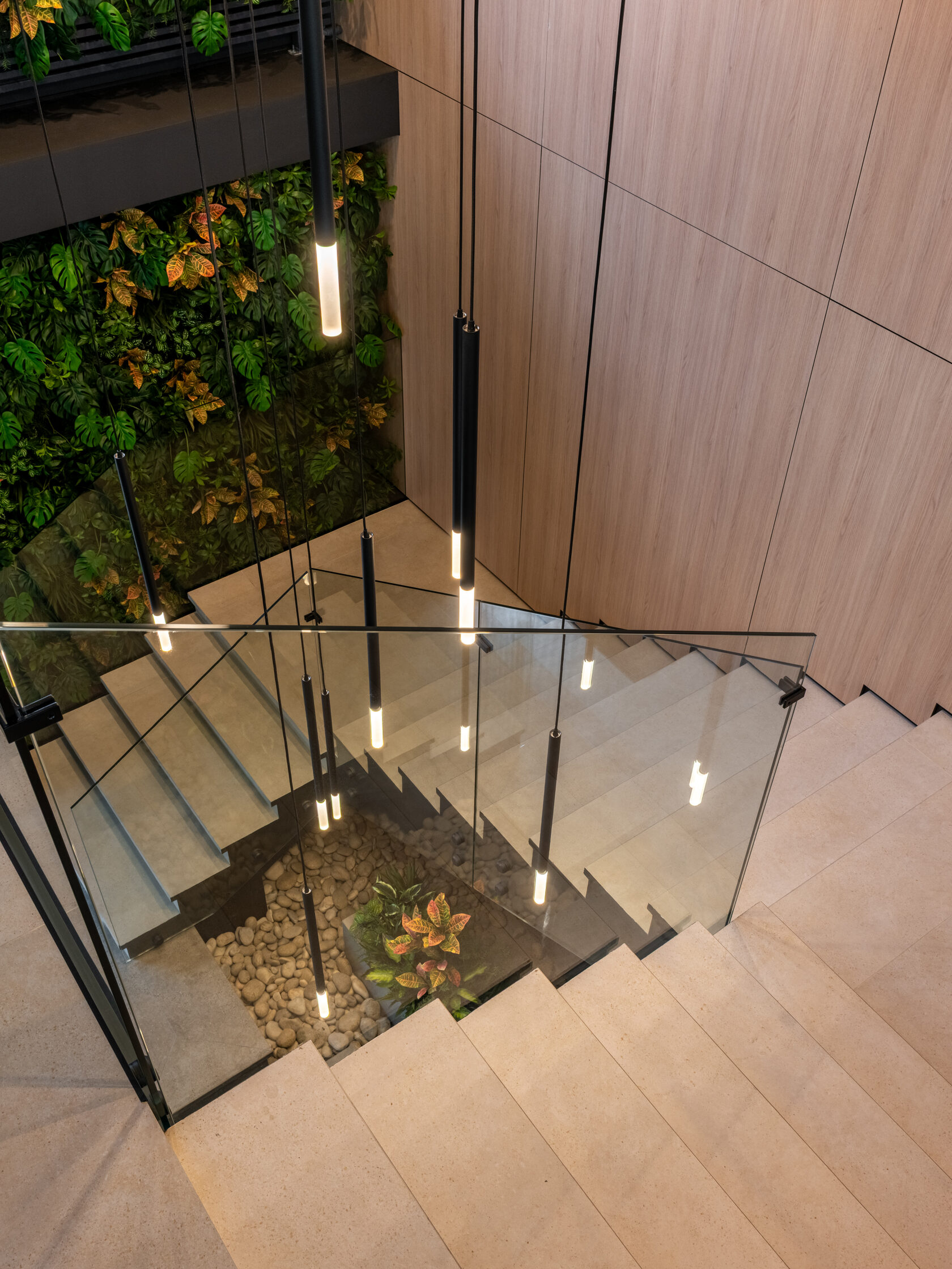 Технологии и тактильность Рабочие зоны оснащены умным освещением SWG с регулируемым спектром, а коридоры превращены в световые инсталляции благодаря ручным светильникам Serip. Стены покрыты красками Argile с эффектом живой текстуры — будто кожа вместо штукатурки.