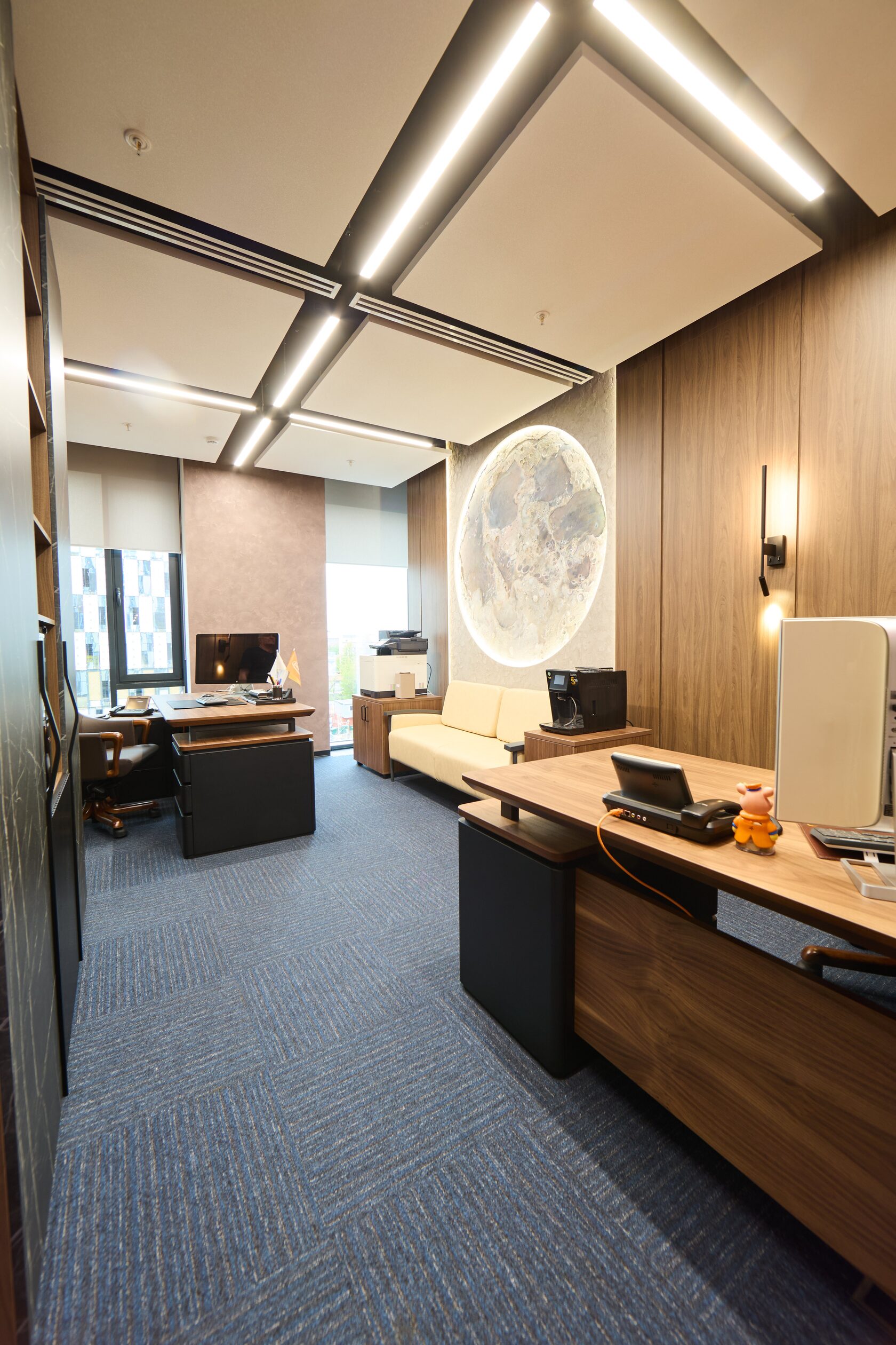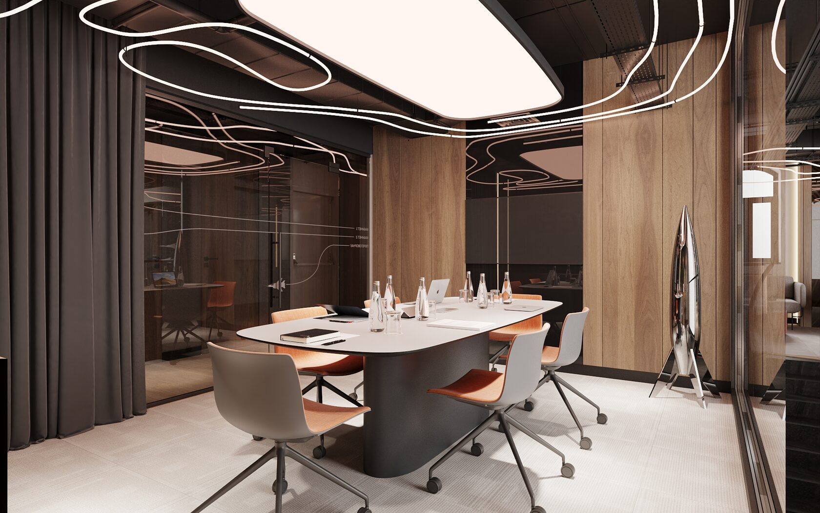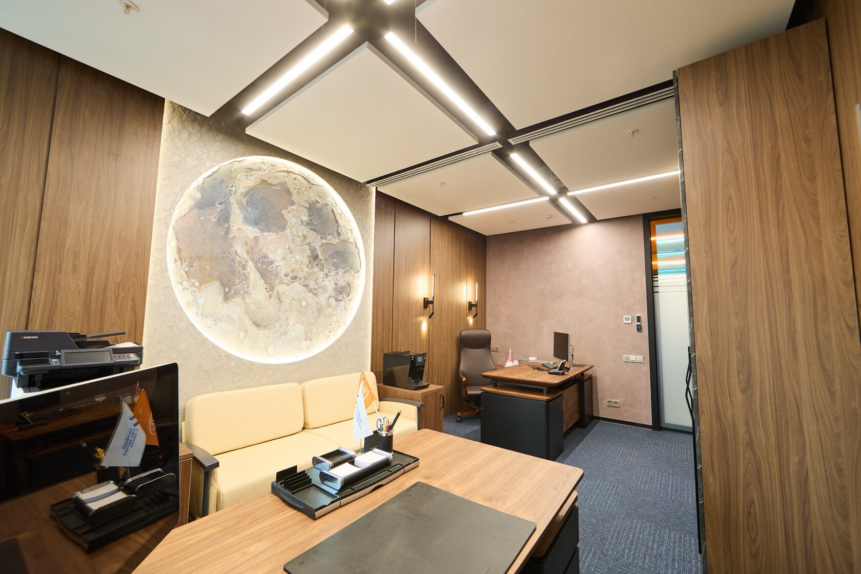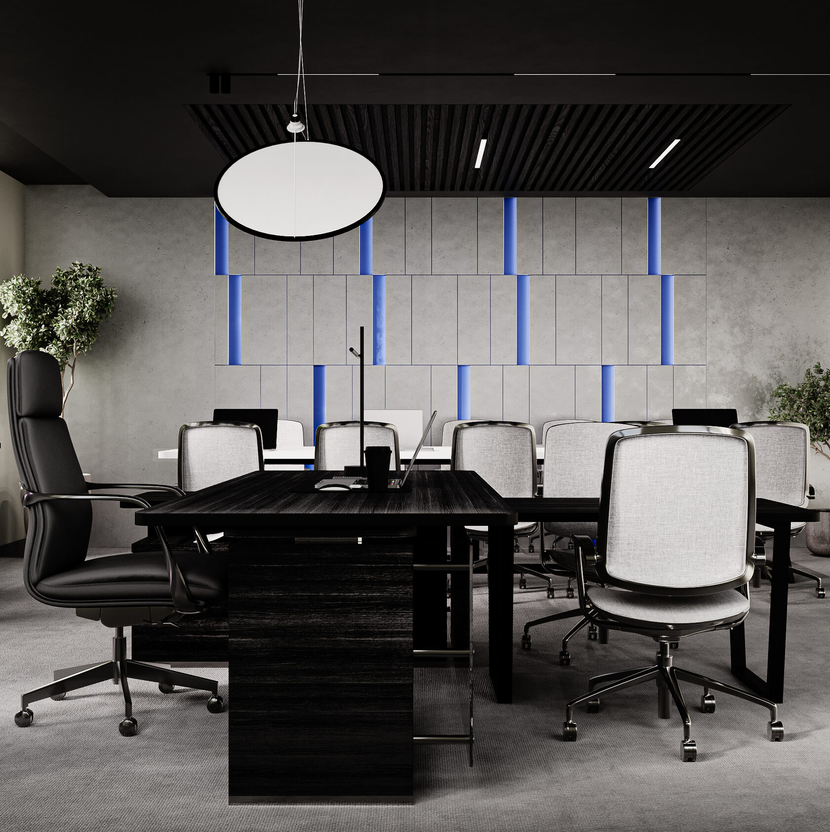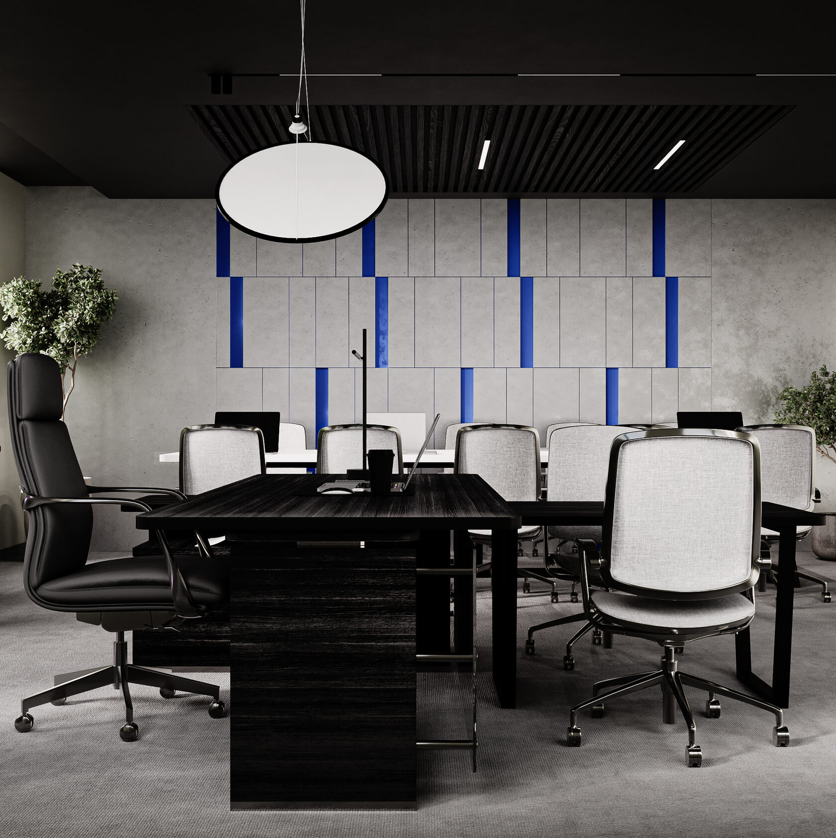 Концепция: Основная концепция — создание интерьера, безупречно отражающего инженерную направленность компании и обеспечивающего максимальный комфорт. Пространство было тщательно зонировано от приемной до архива и кухни, с учетом всех технических требований. В дизайн органично интегрированы продукты Заказчика, включая панели SUBU, что усилило визуальный образ и продемонстрировало их функциональность. Применены инновационные инженерные решения, такие как система фальшпола для гибкости коммуникаций и акустические потолочные баффлы для шумоподавления, обеспечивая технологичность и эргономику.