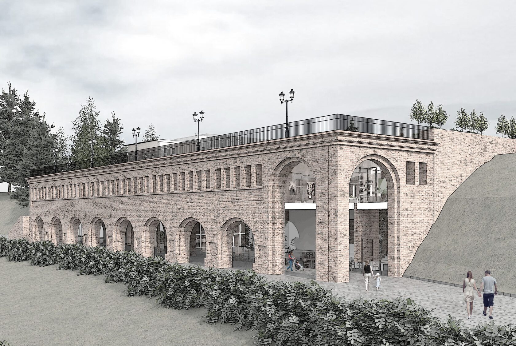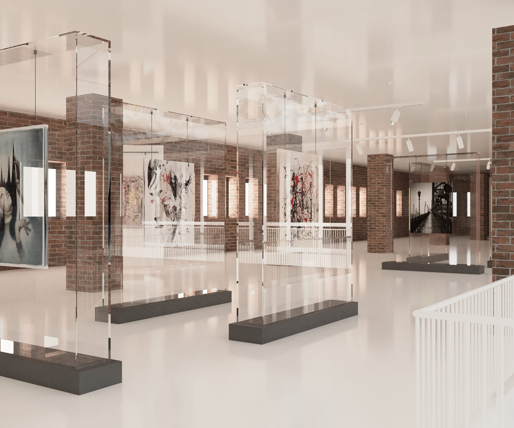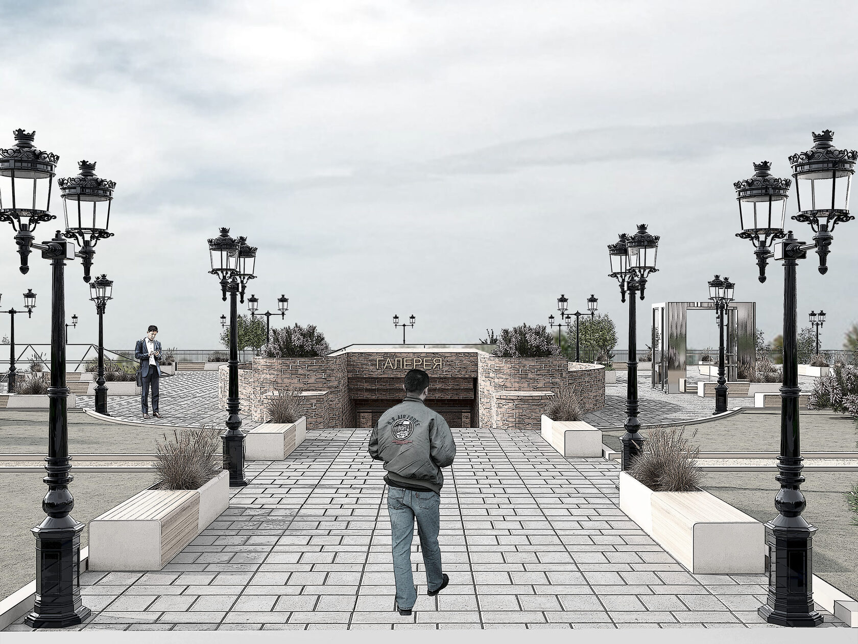 Проект представляет собой современный многофункциональный культурный центр, органично вписанный в историческую среду города. Здание сочетает строгую симметрию, ритм арочных окон и монументальный главный вход с современными архитектурными решениями и технологиями. Центральная ось задает направление движения посетителя через ключевые пространства: многофункциональный конференц-зал, библиотеку, сувенирный магазин и кофейню на первом этаже; главный выставочный зал на втором, с высокими потолками и естественным освещением. Фасад и композиция здания подчеркивают уважение к историческому контексту площади и рельефу города, а интеграция стеклянных фонарей и смотровой площадки создаёт уникальное взаимодействие с ландшафтом. Планировка обеспечивает удобство для различных категорий посетителей: жителей, туристов, художников, студентов и бизнес-сообщества.