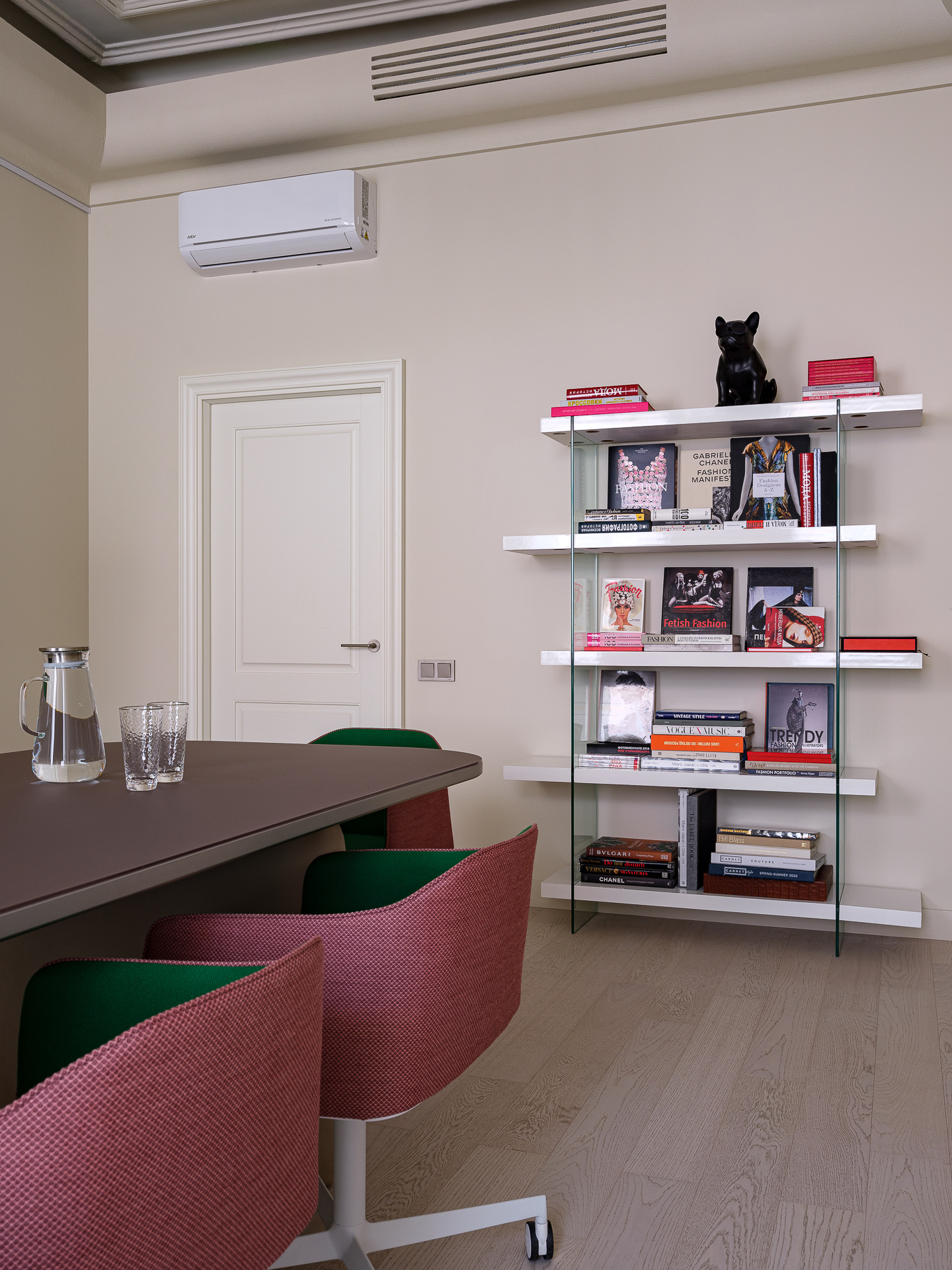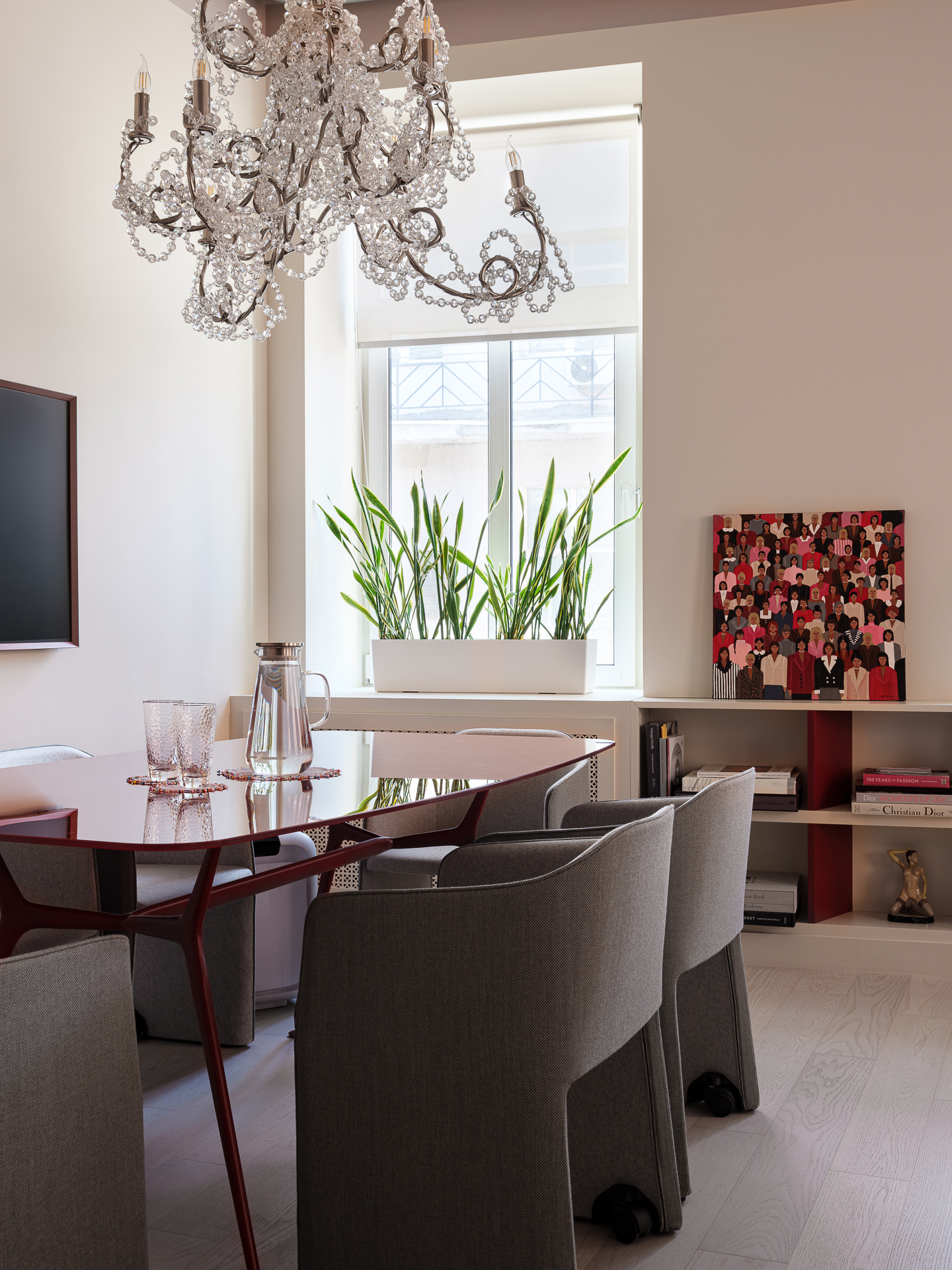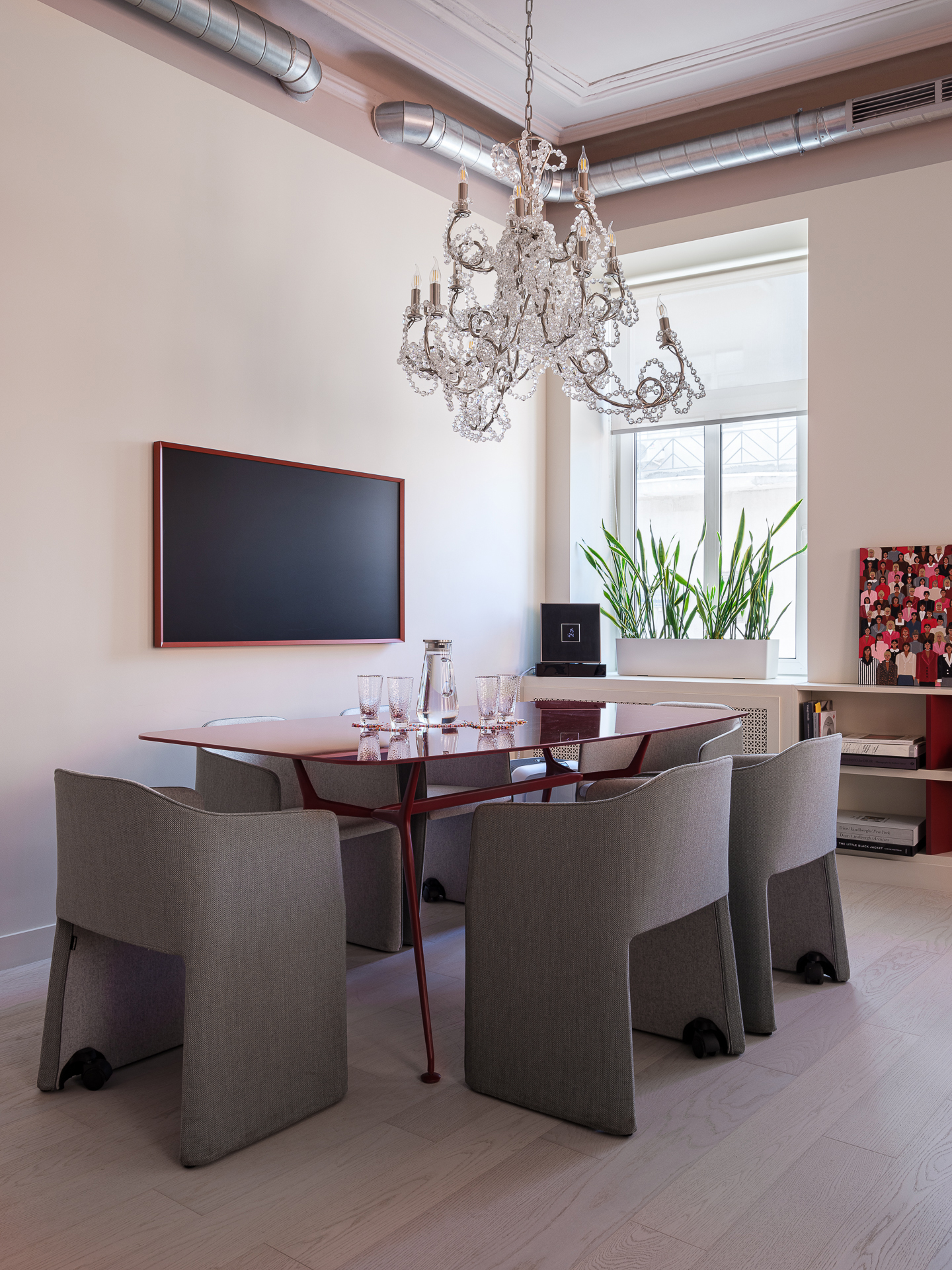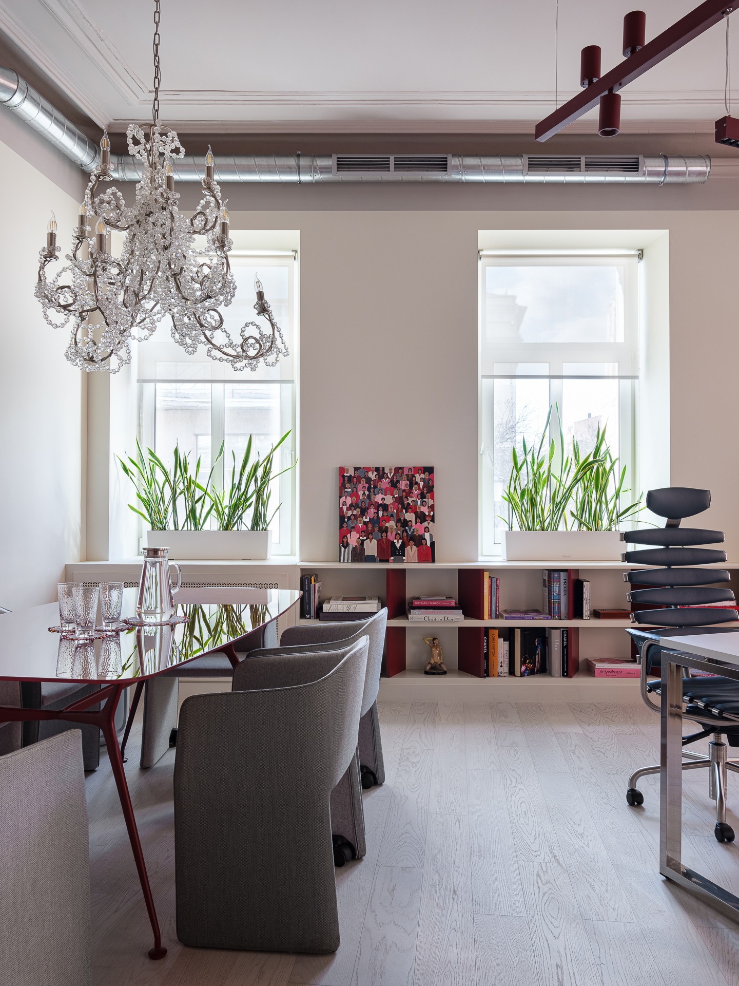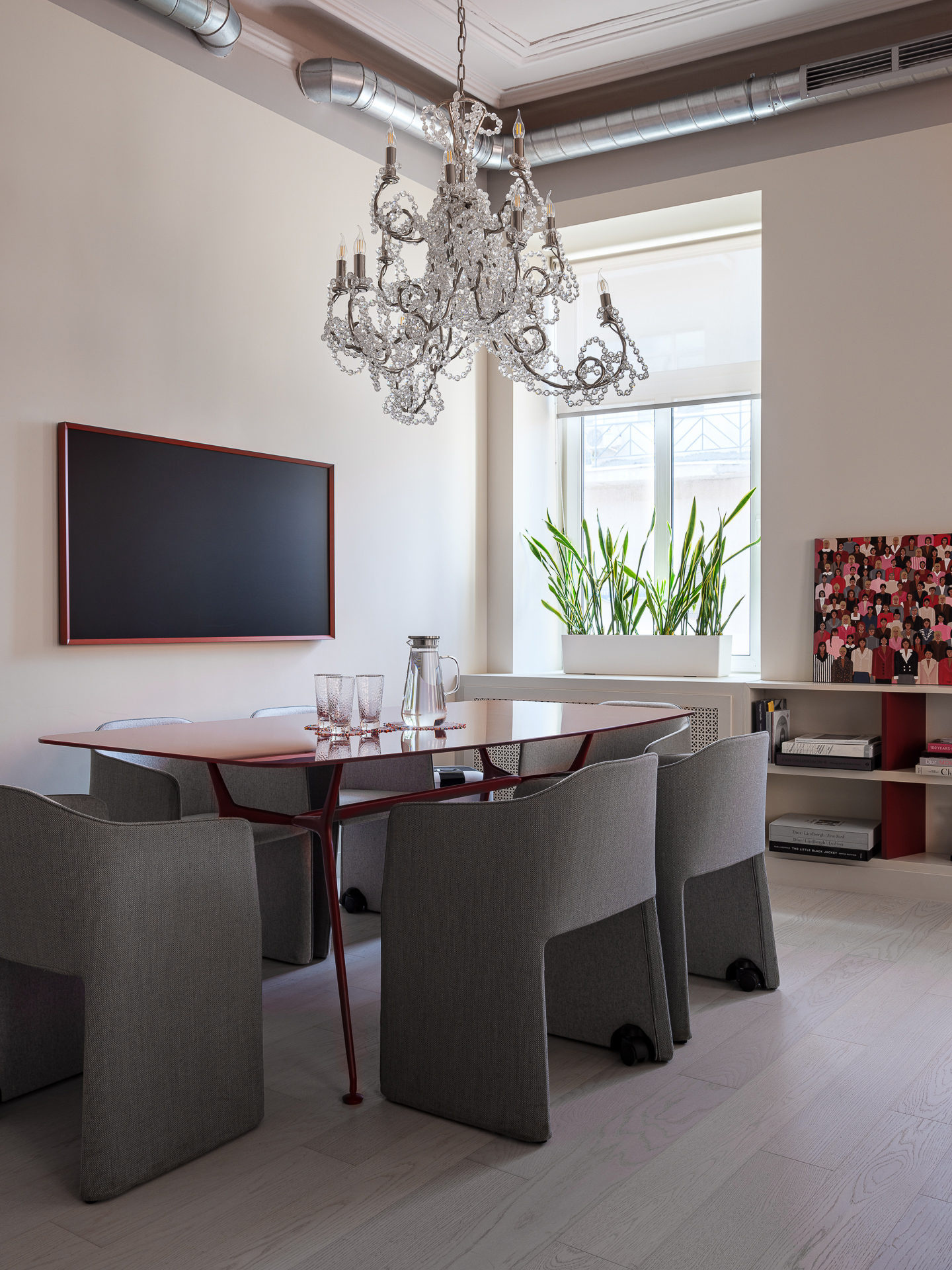 Особую атмосферу создают переговорные: «красная», «белая» и «стеклянная» комнаты наполнены иконами современного дизайна — от стульев Kartell до культовых светильников. Эти пространства служат не только функциональной, но и эстетической точкой контакта с клиентами.