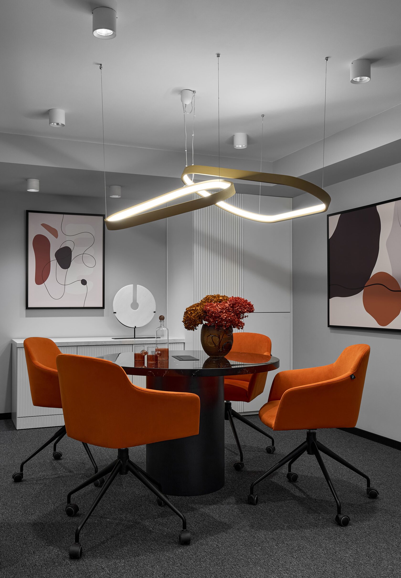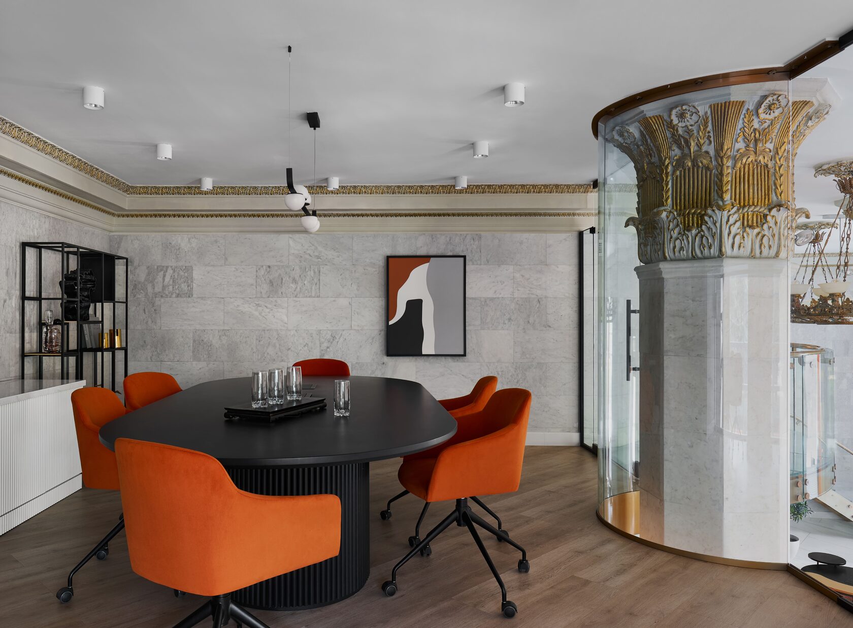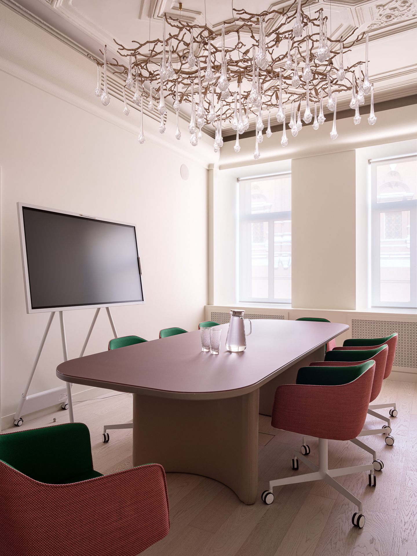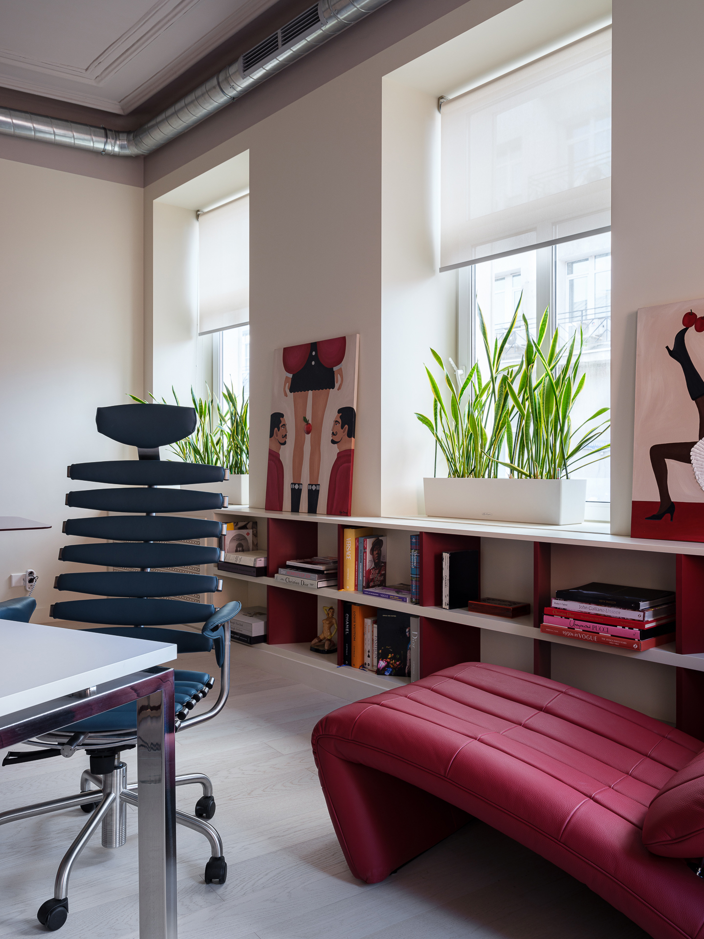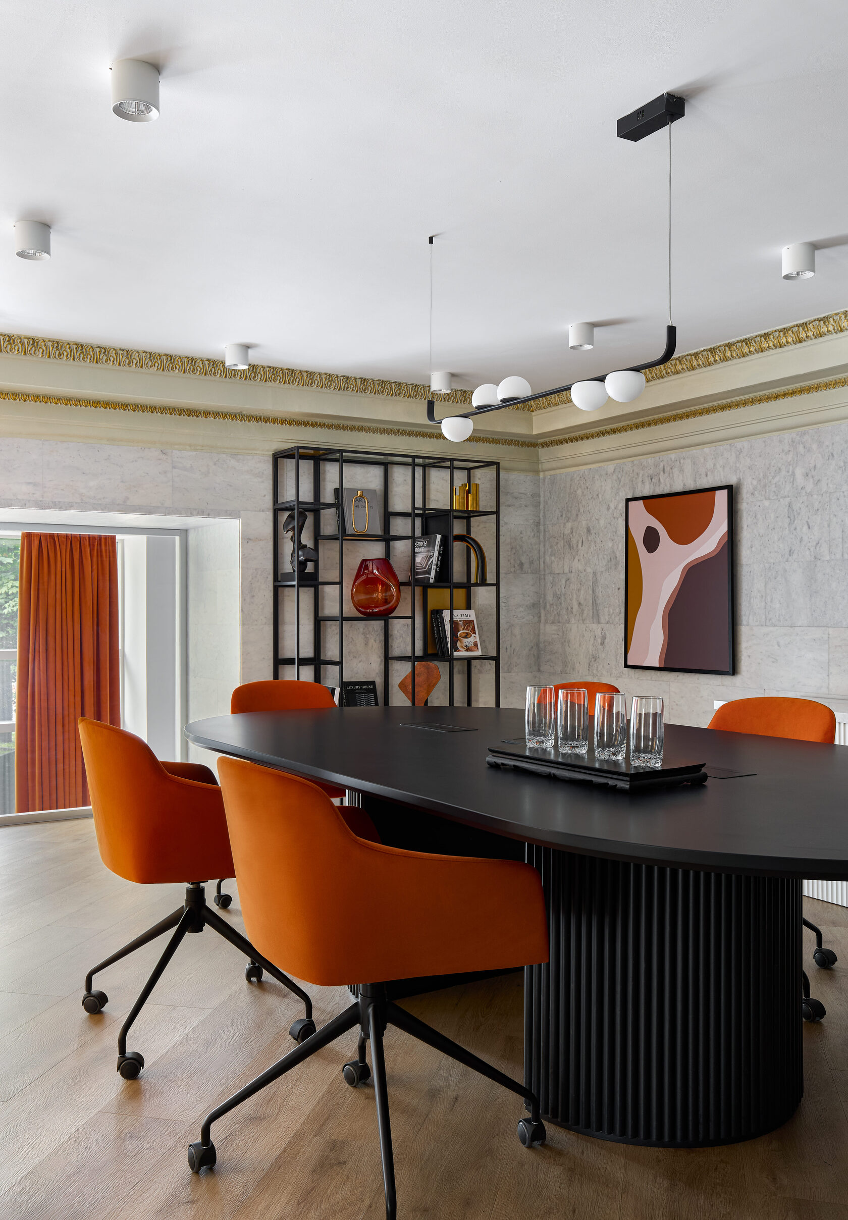 Особую атмосферу создают переговорные: «красная», «белая» и «стеклянная» комнаты наполнены иконами современного дизайна — от стульев Kartell до культовых светильников. Эти пространства служат не только функциональной, но и эстетической точкой контакта с клиентами.