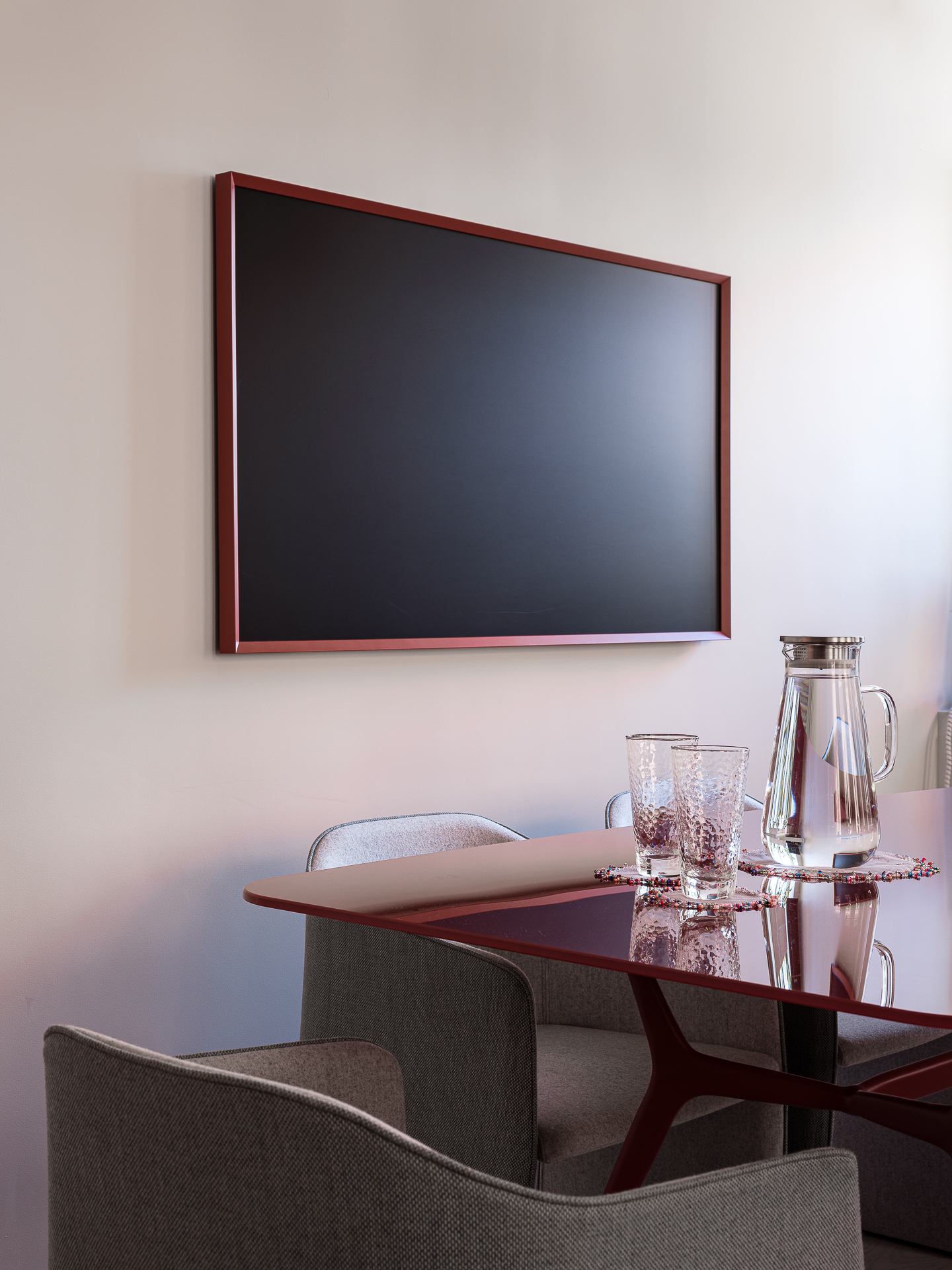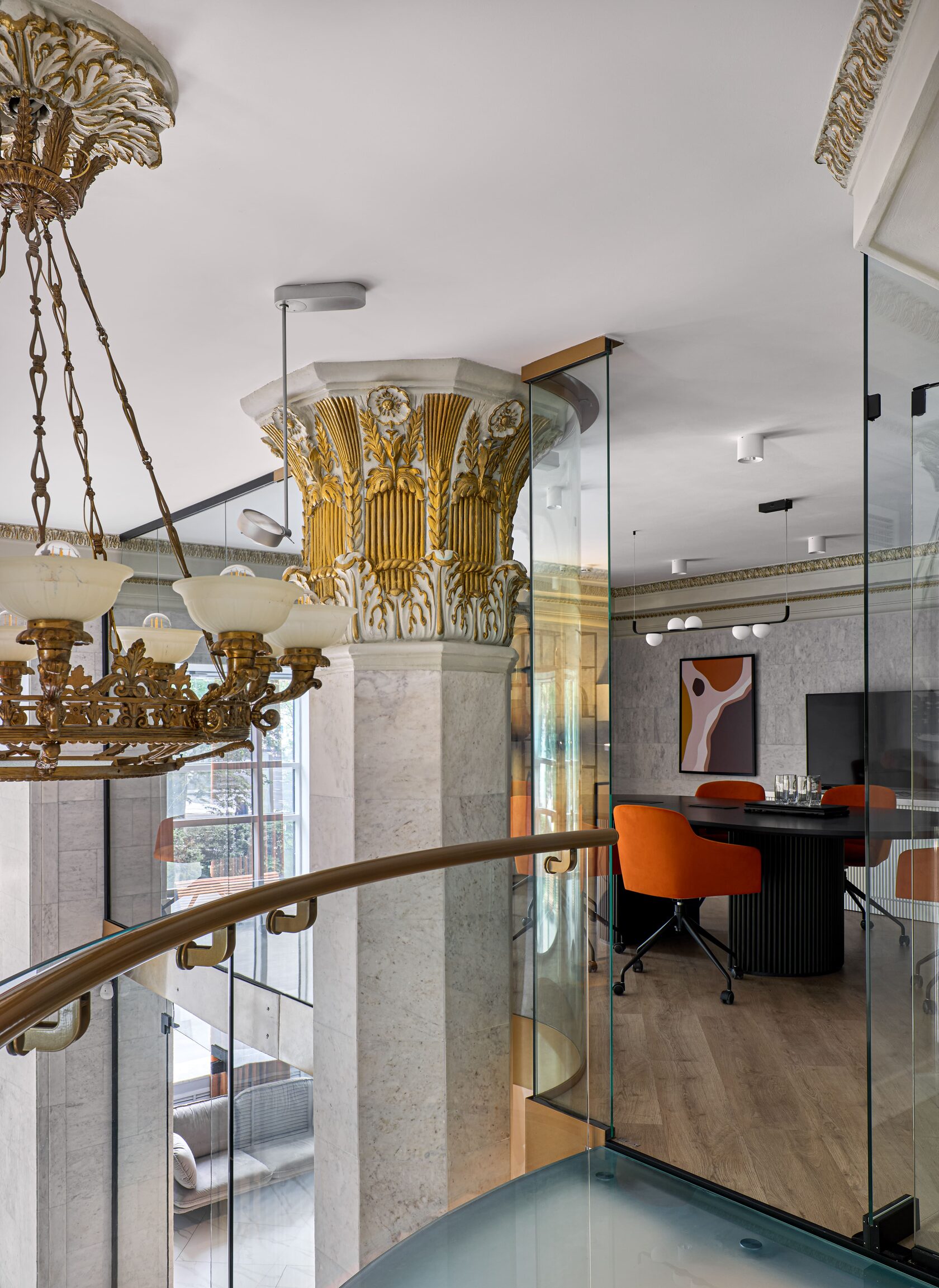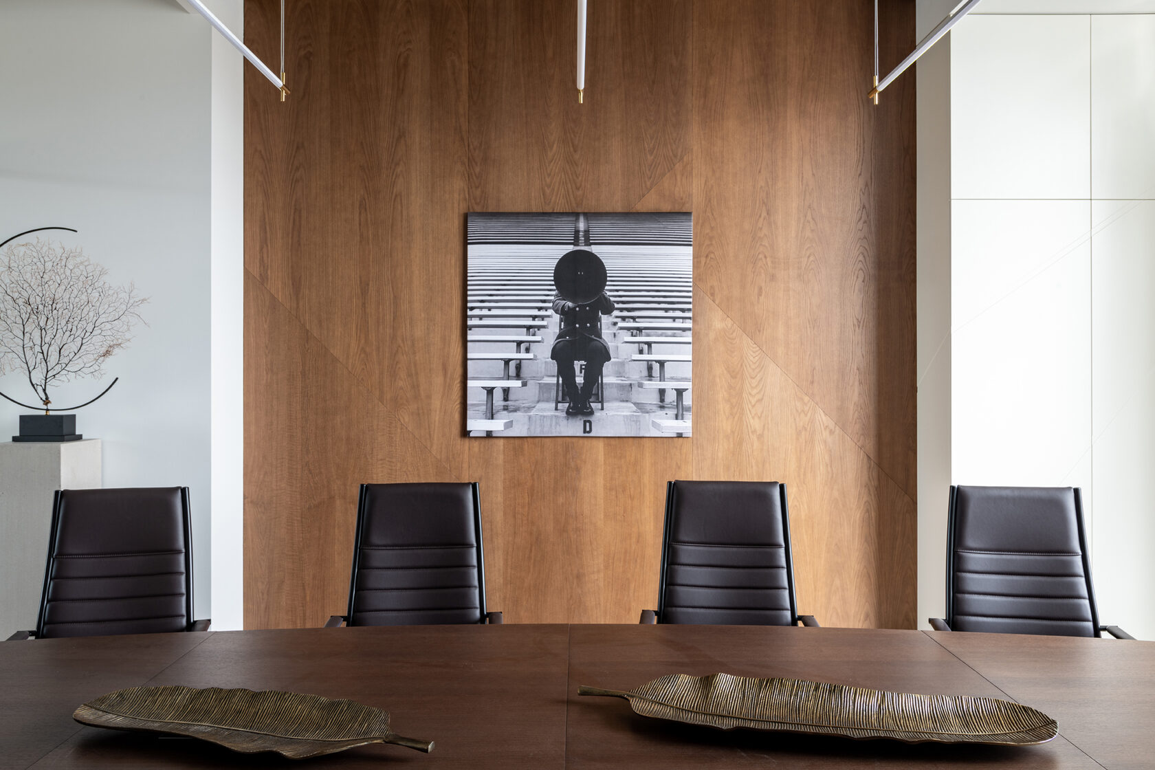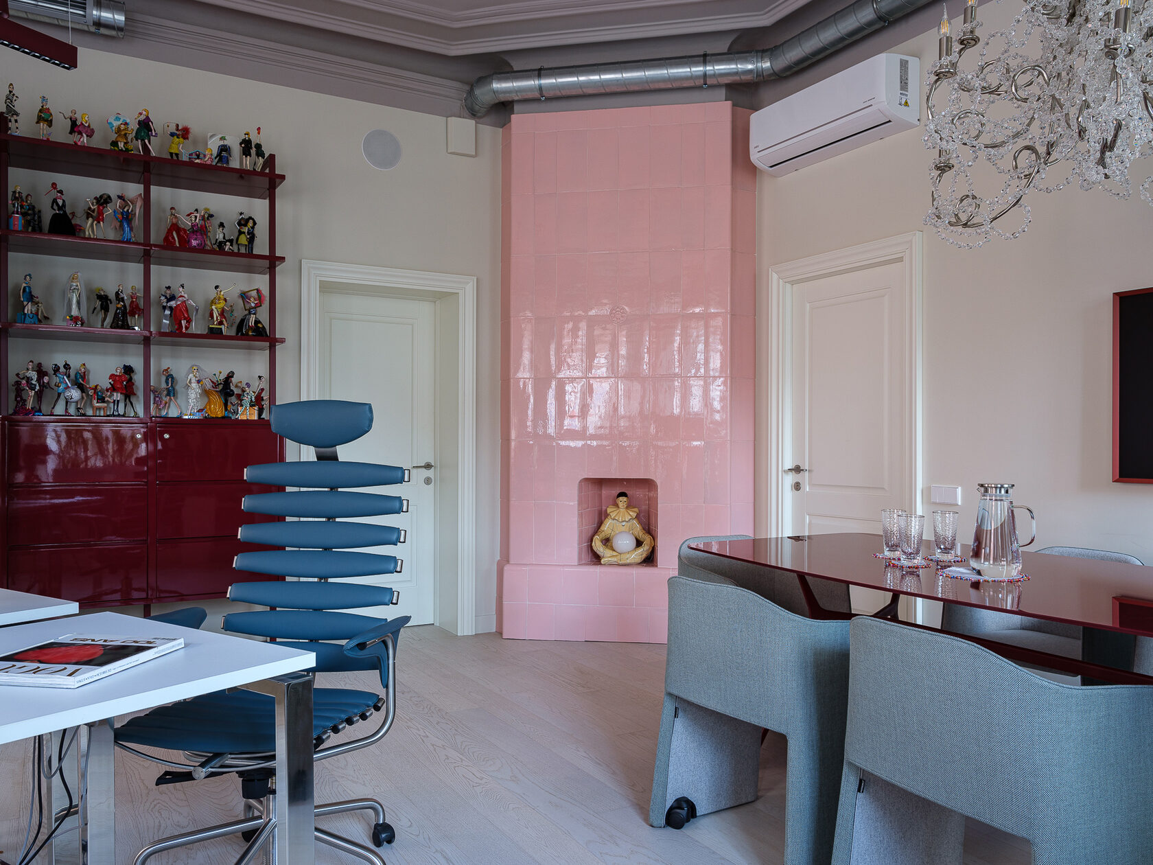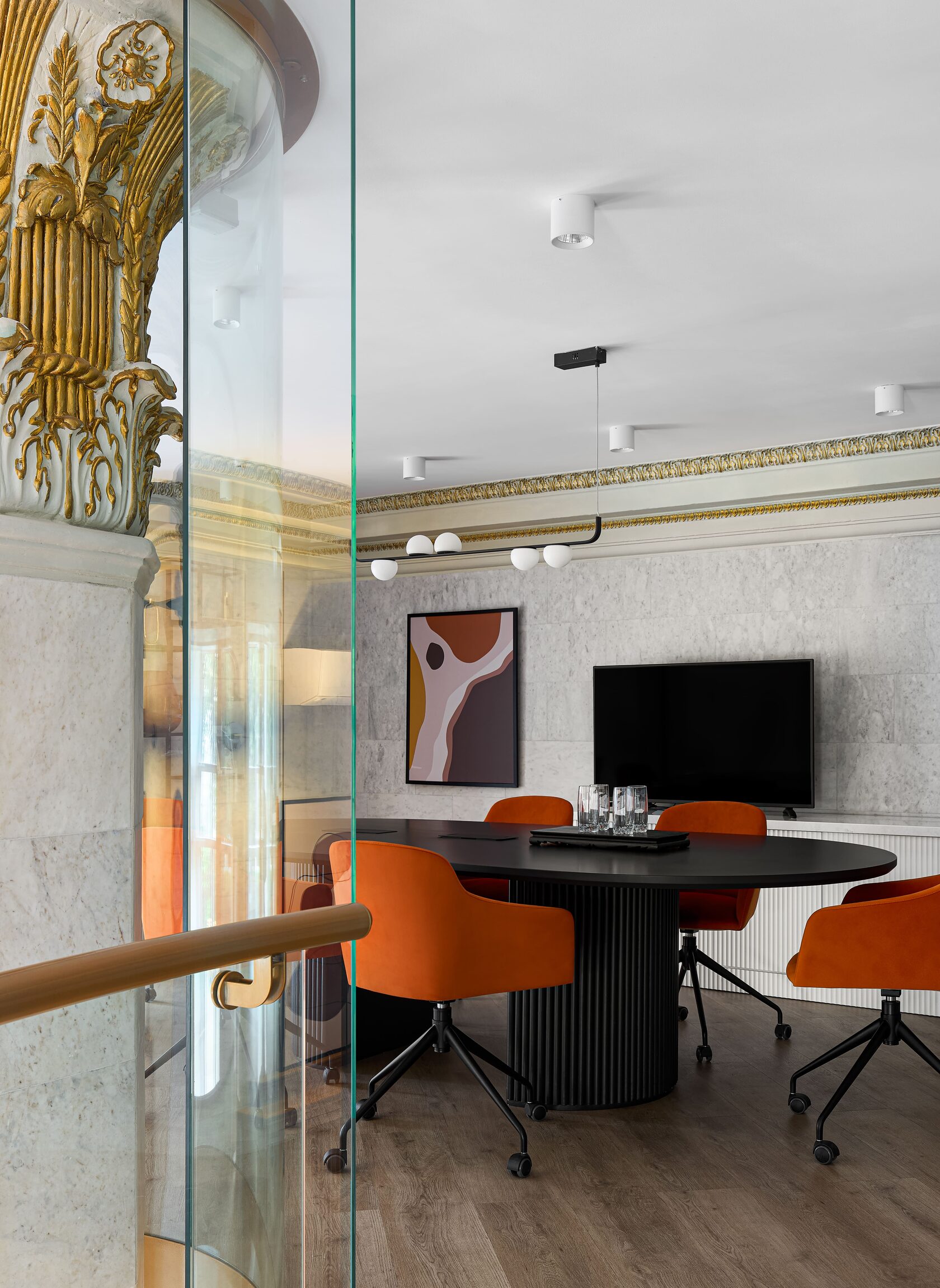 Особую атмосферу создают переговорные: «красная», «белая» и «стеклянная» комнаты наполнены иконами современного дизайна — от стульев Kartell до культовых светильников. Эти пространства служат не только функциональной, но и эстетической точкой контакта с клиентами.