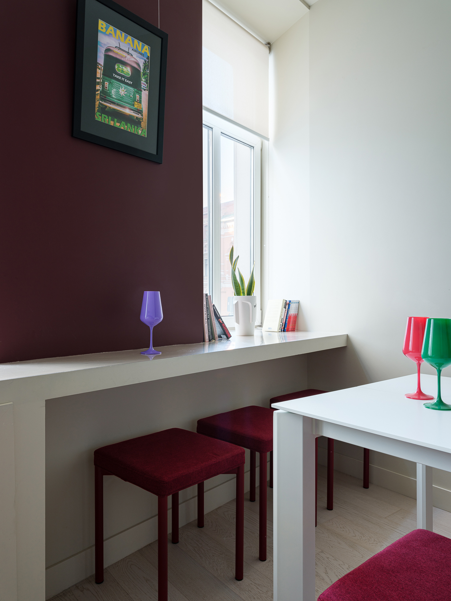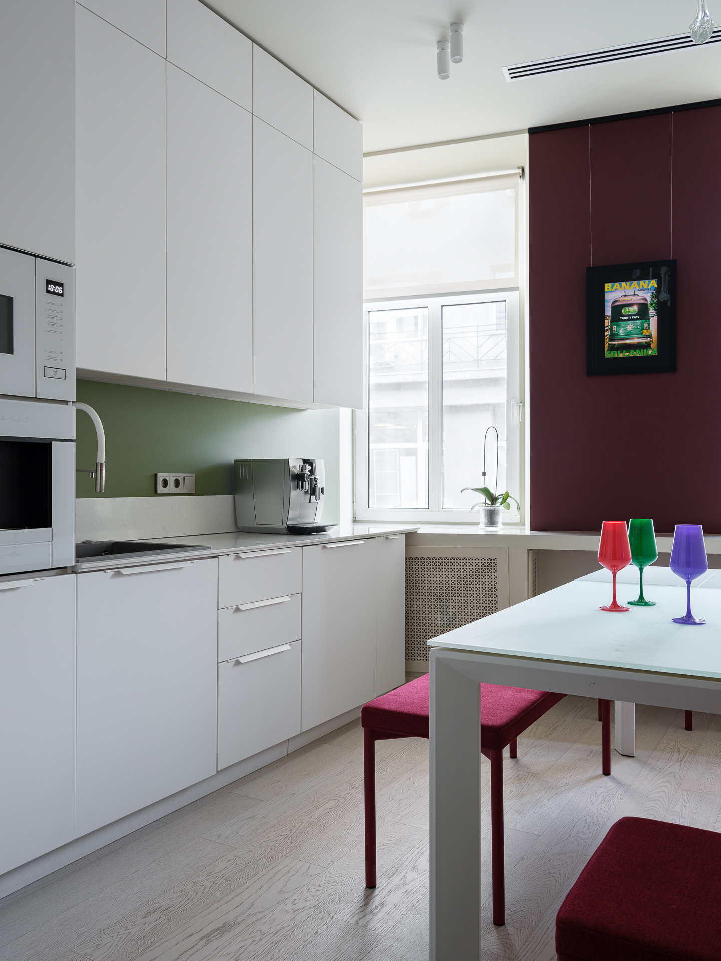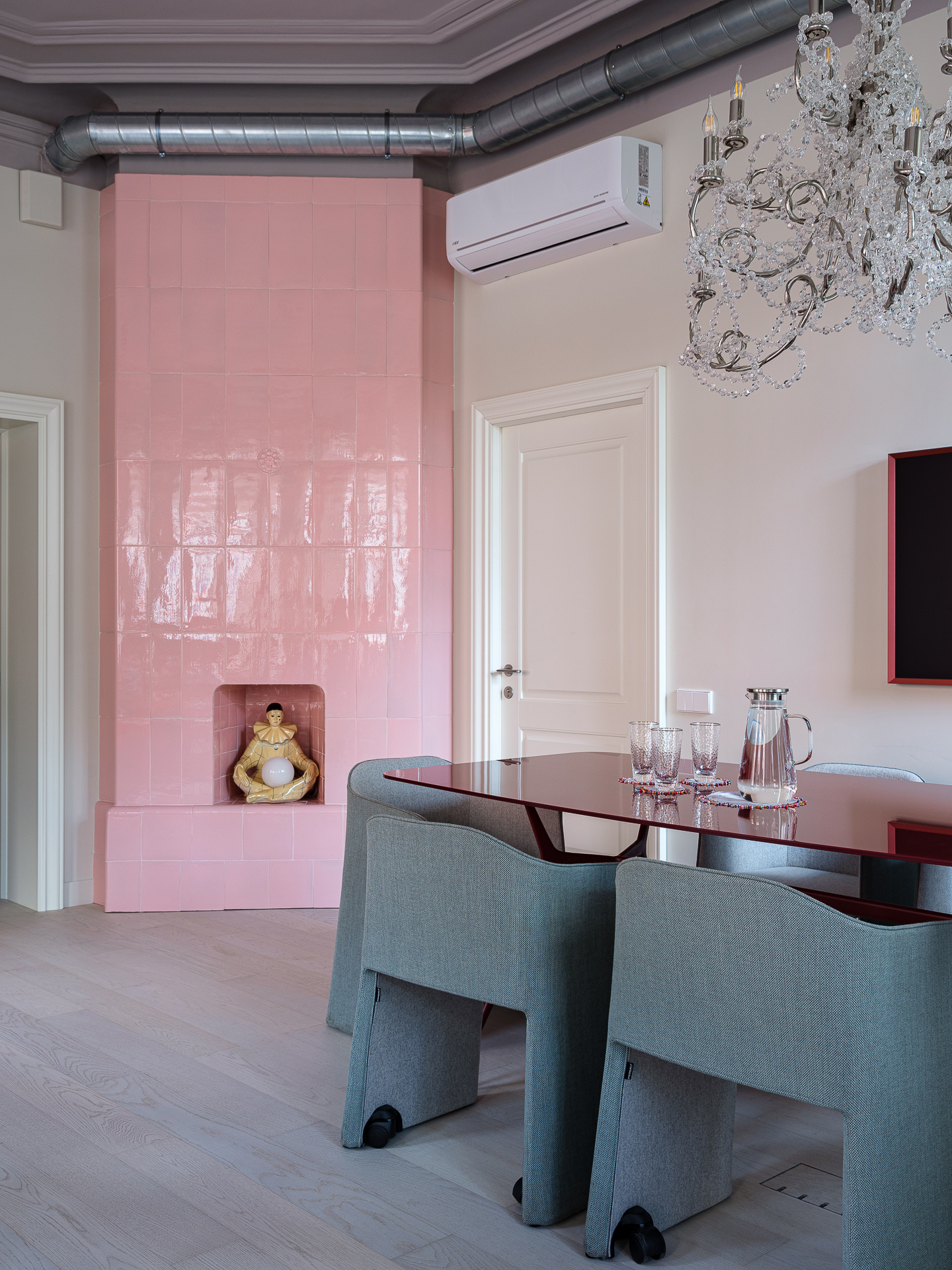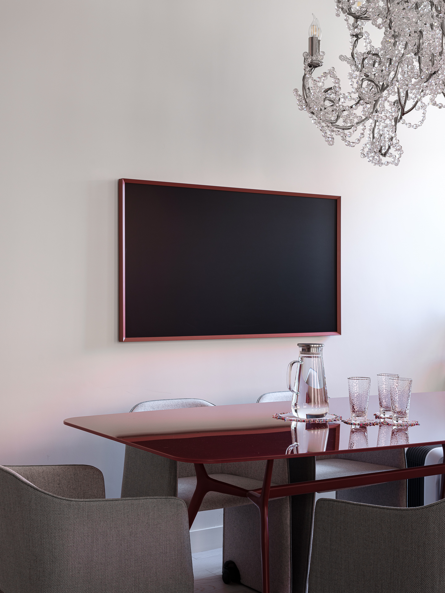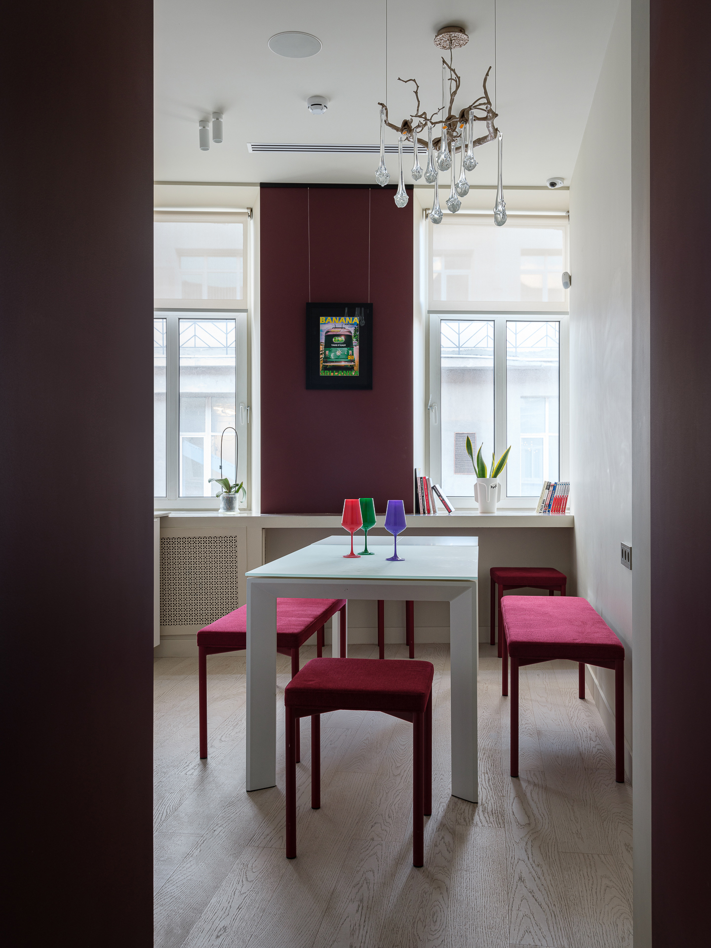 Особую атмосферу создают переговорные: «красная», «белая» и «стеклянная» комнаты наполнены иконами современного дизайна — от стульев Kartell до культовых светильников. Эти пространства служат не только функциональной, но и эстетической точкой контакта с клиентами.