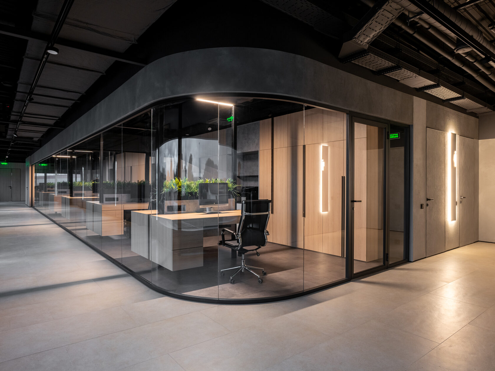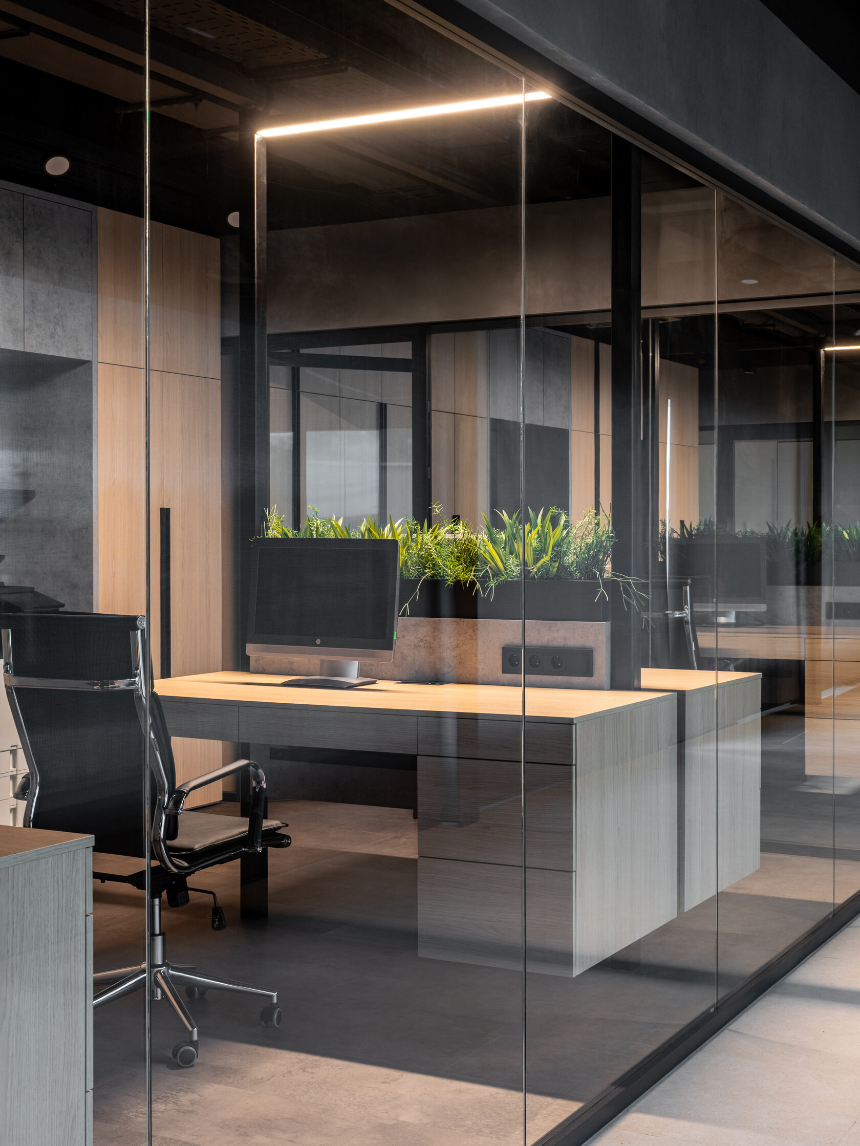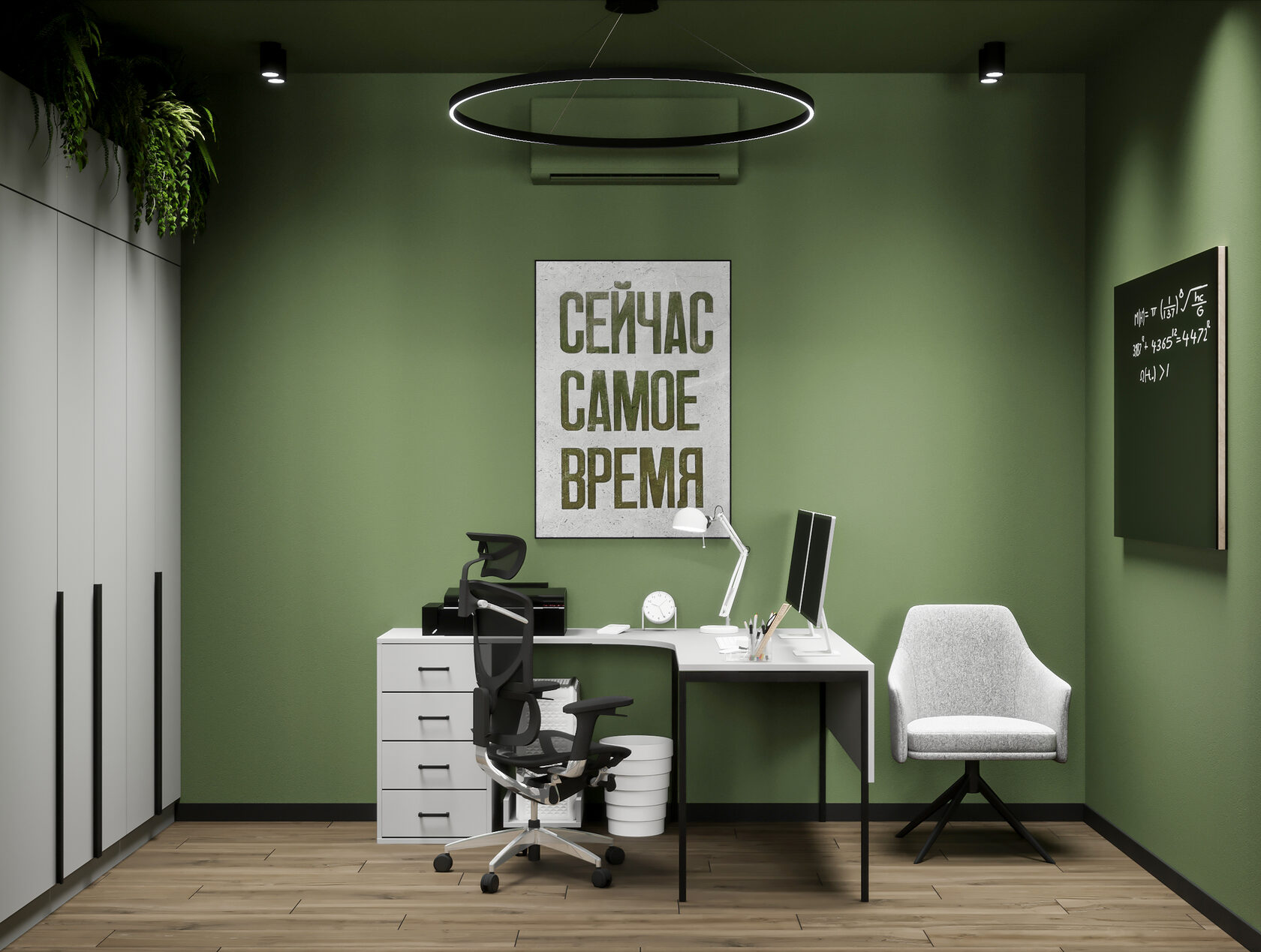 Проект офиса разработан для клиентов из сферы оборонно-промышленного комплекса. Интерьер сочетает в себе сдержанную цветовую гамму — глубокие тона зеленого, графитового и бронзы — создавая атмосферу надежности и стабильности. Особое внимание уделено освещению: гнутый светодиодный профиль формирует динамичный геометрический рисунок, добавляя пространству технологичности и индивидуальности.