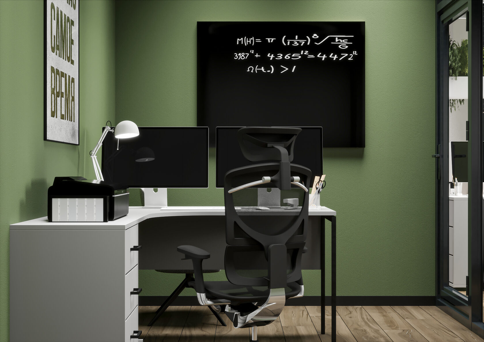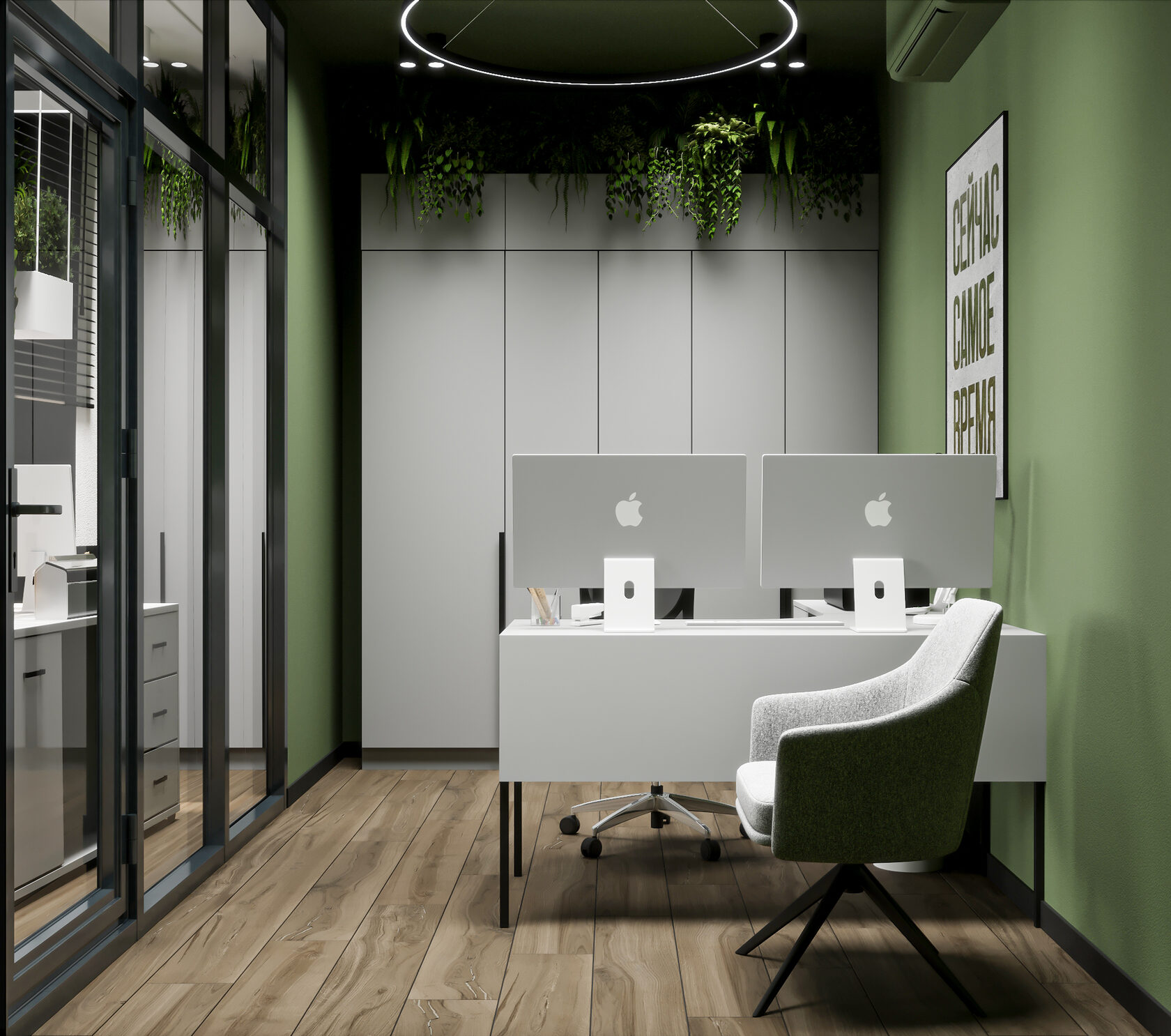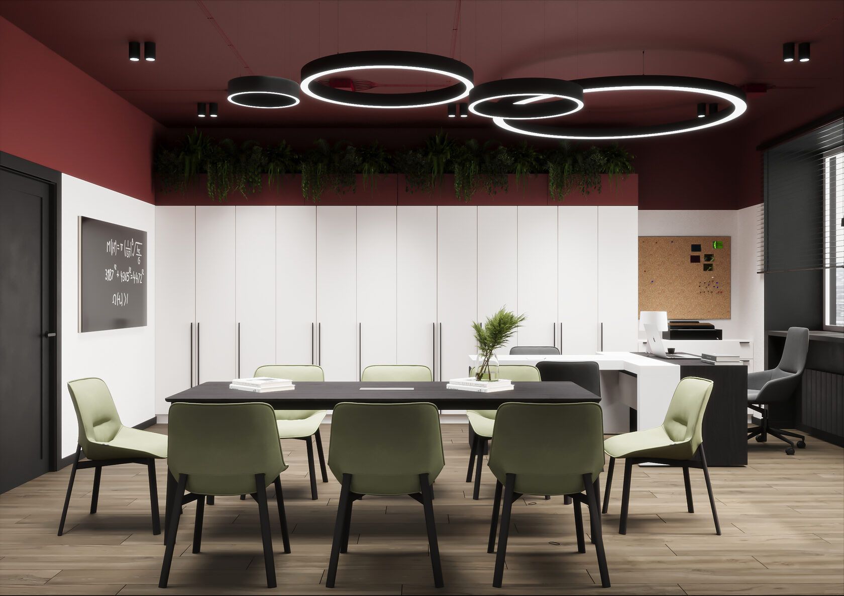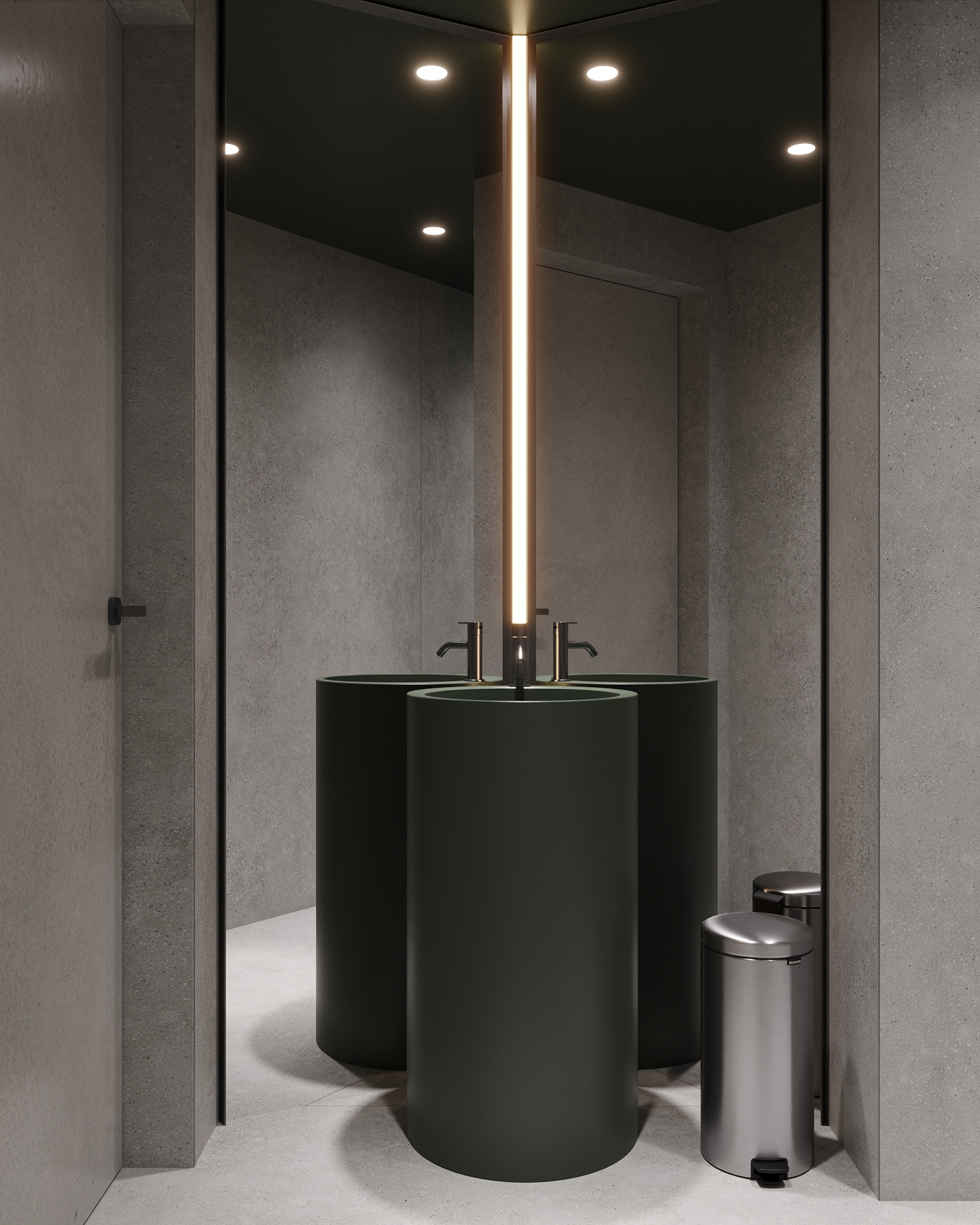 Проект офиса разработан для клиентов из сферы оборонно-промышленного комплекса. Интерьер сочетает в себе сдержанную цветовую гамму — глубокие тона зеленого, графитового и бронзы — создавая атмосферу надежности и стабильности. Особое внимание уделено освещению: гнутый светодиодный профиль формирует динамичный геометрический рисунок, добавляя пространству технологичности и индивидуальности.