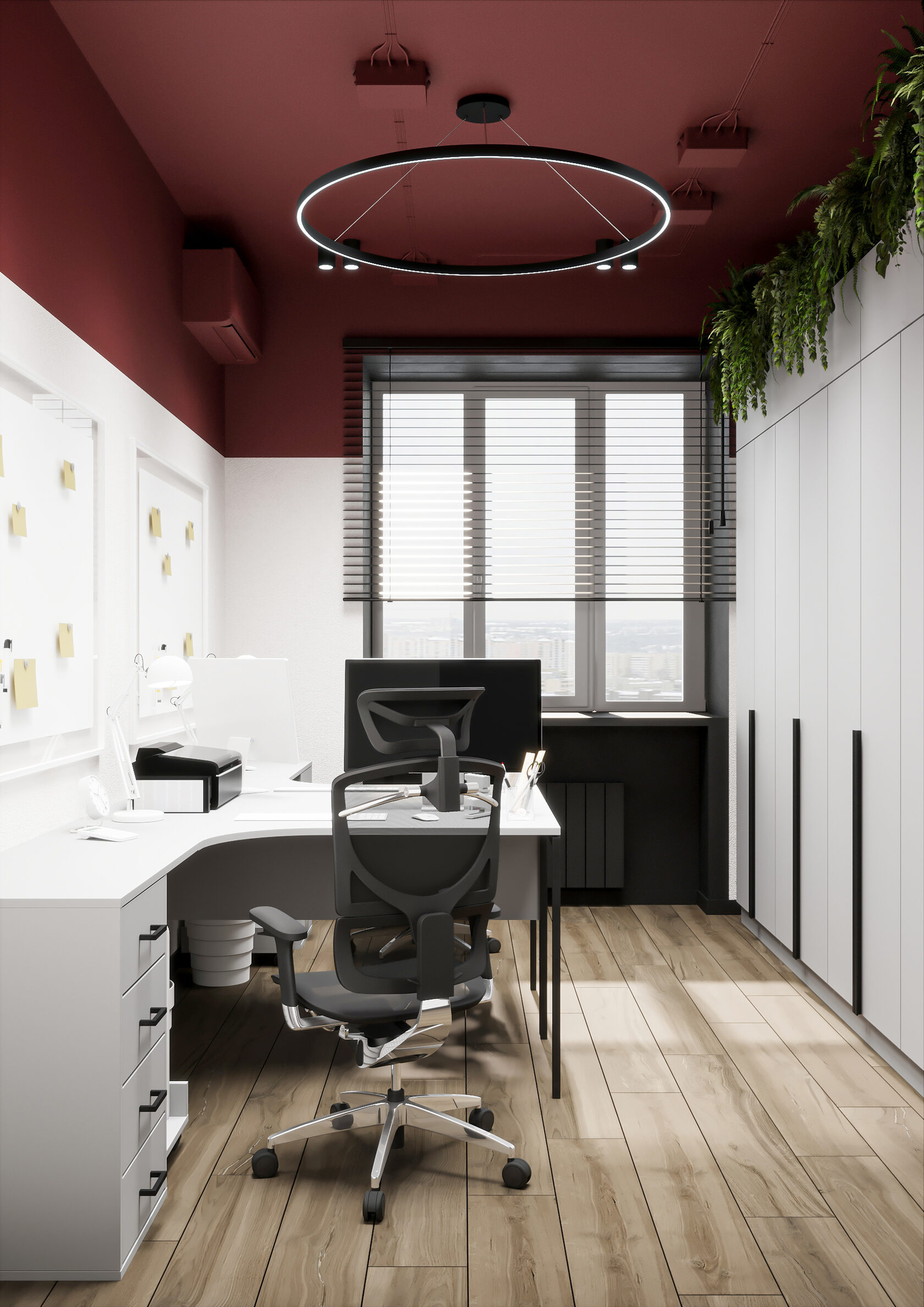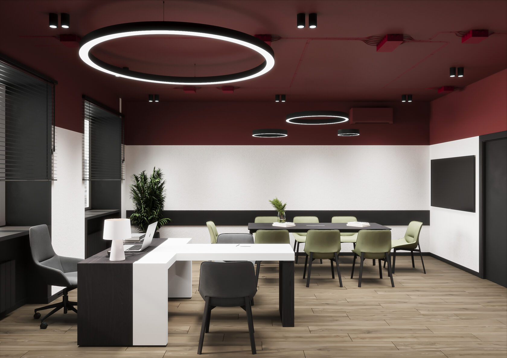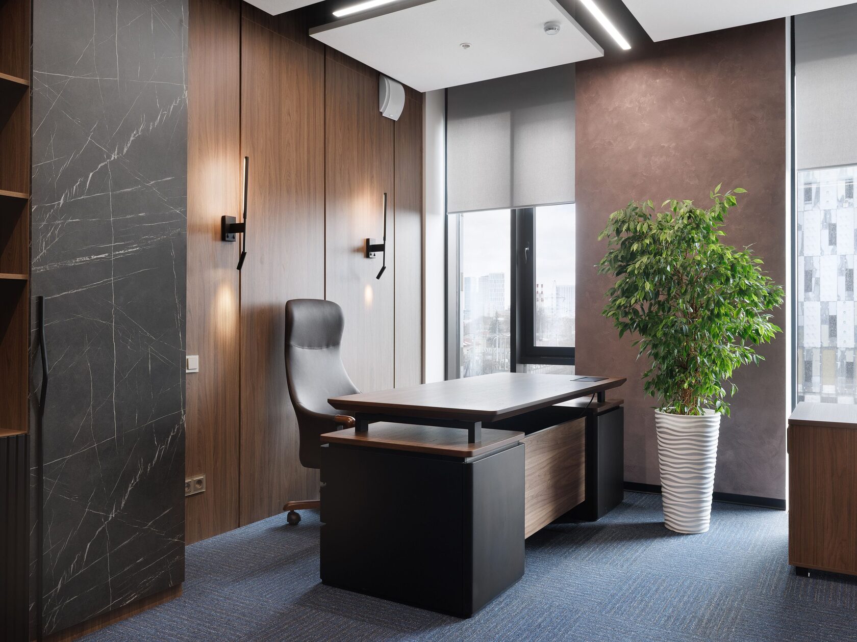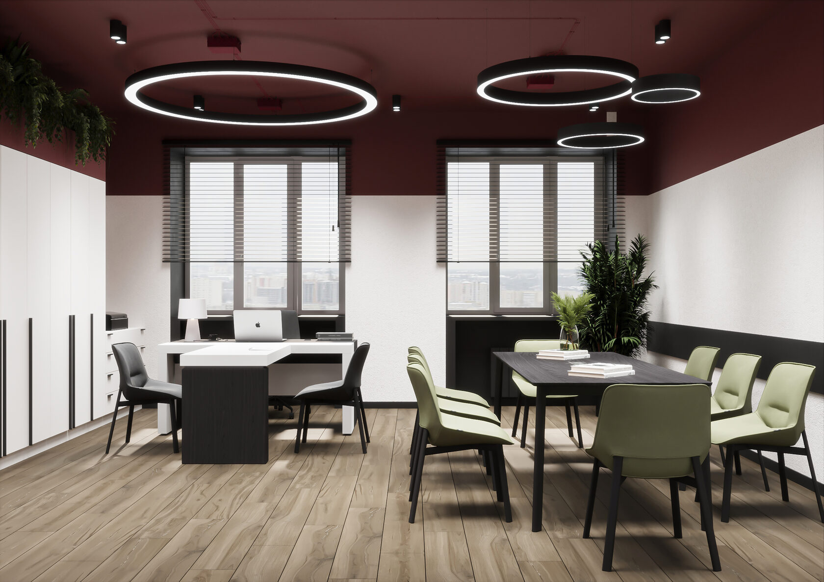 Этот проект посвящен созданию уникального рабочего пространства — VIP-офиса, разработанного специально для трех руководителей компании. В отличие от стандартных решений по максимальному размещению сотрудников, здесь акцент сделан на максимальном комфорте и функциональности в просторном помещении площадью 700 м². Пространство включает три индивидуальных кабинета, две переговорные комнаты (большую и малую), отдельный кабинет для помощников руководителей и представительную зону ресепшн. Особое внимание уделено деталям, влияющим на продуктивность и самочувствие: звукоизоляции и продуманным сценариям освещения в рабочих зонах.