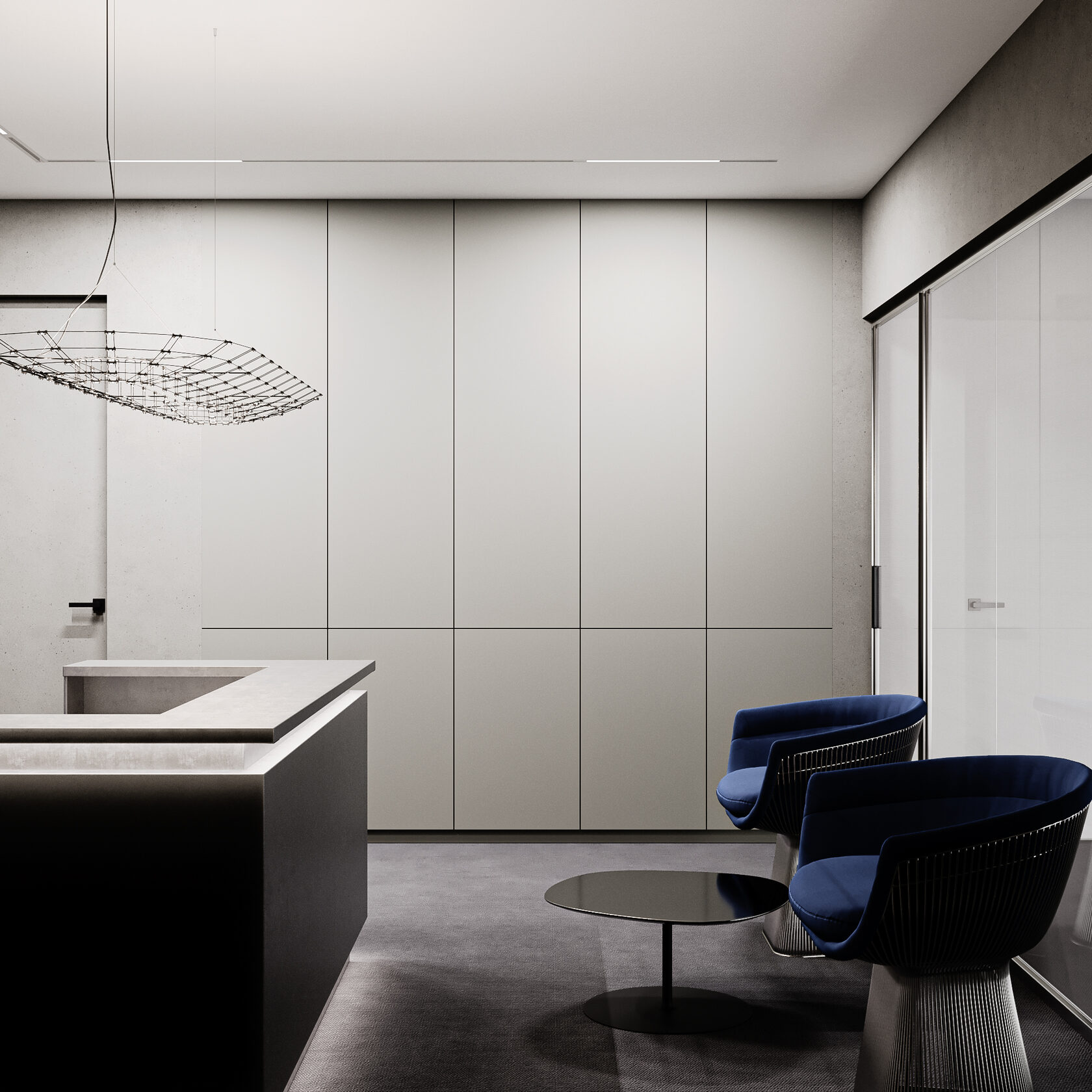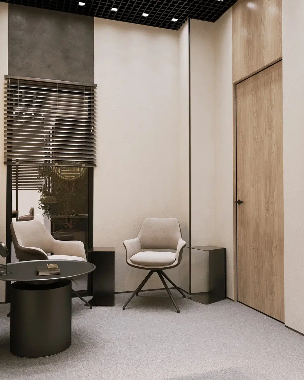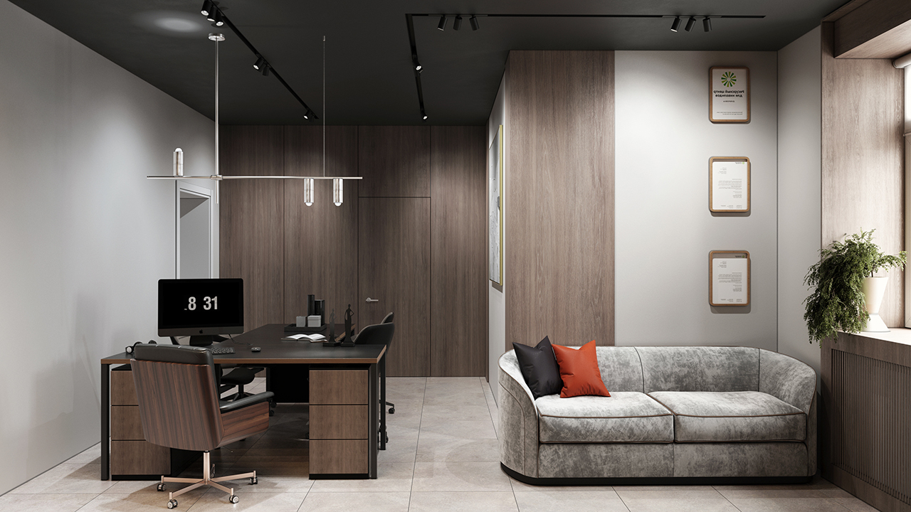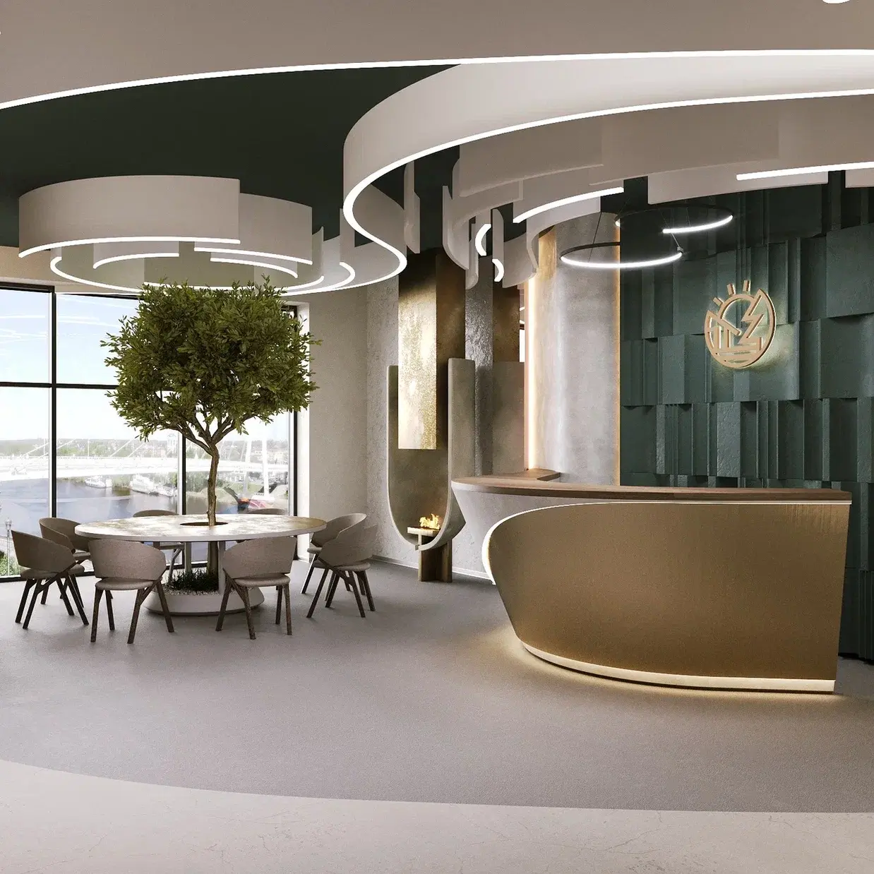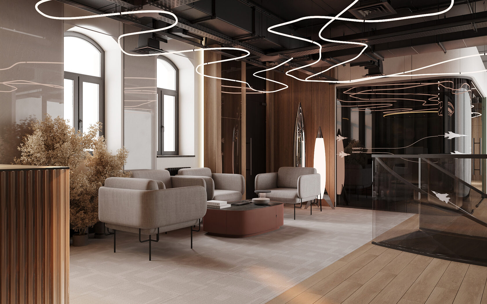 Концепция: Основная концепция дизайна направлена на создание атмосферы спокойствия и респектабельности. Интерьер построен на гармоничном сочетании приглушенных цветовых палитр и натуральных фактур, которые придают пространству изысканность. Яркие, но тщательно подобранные акценты в мебели и декоре оживляют интерьер, сохраняя при этом строгую деловую эстетику. Отличительной чертой является применение инновационных материалов, таких как каменный шпон, используемый в отделке мебели и стен, что подчеркивает уникальность и высокий статус проекта.