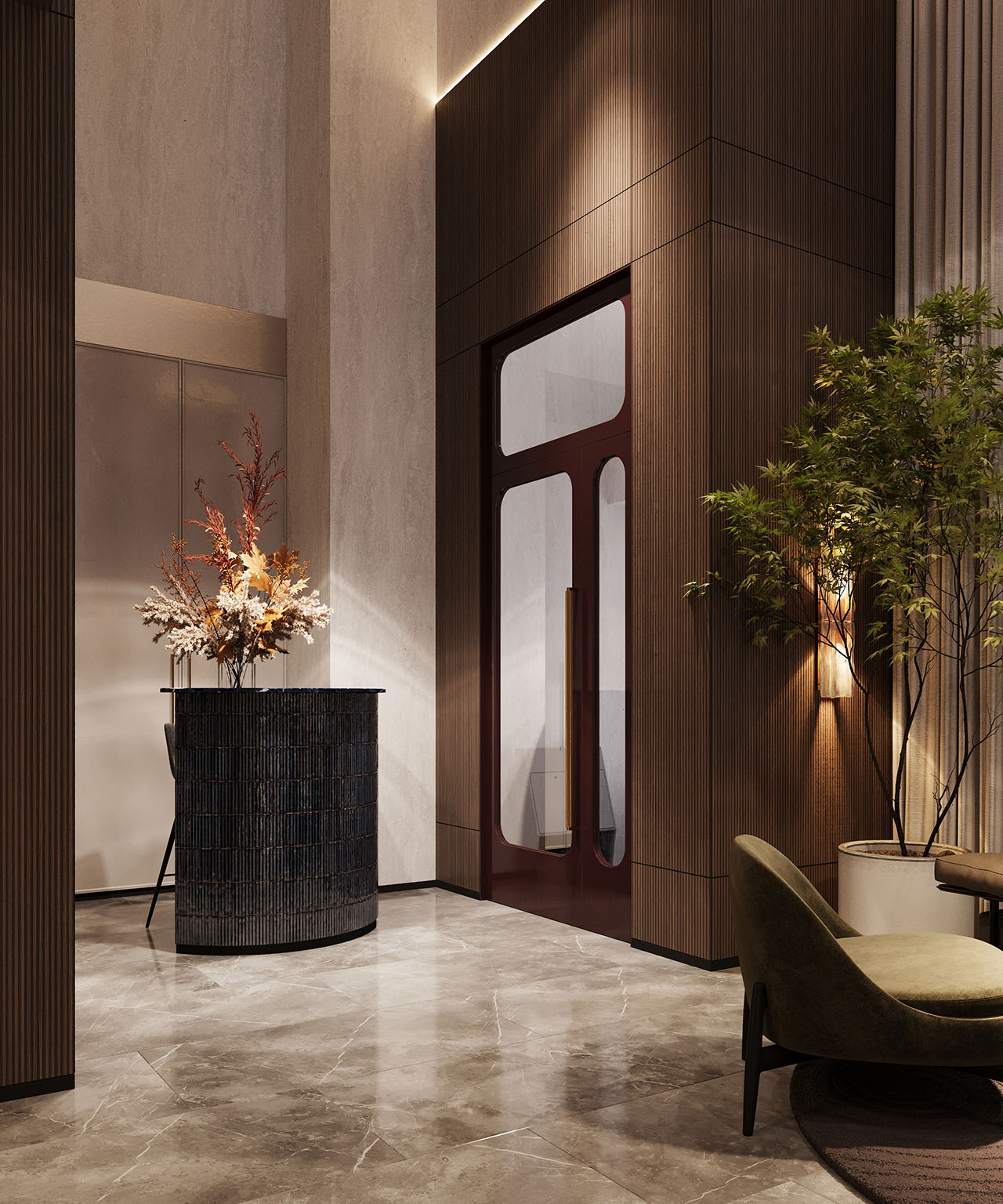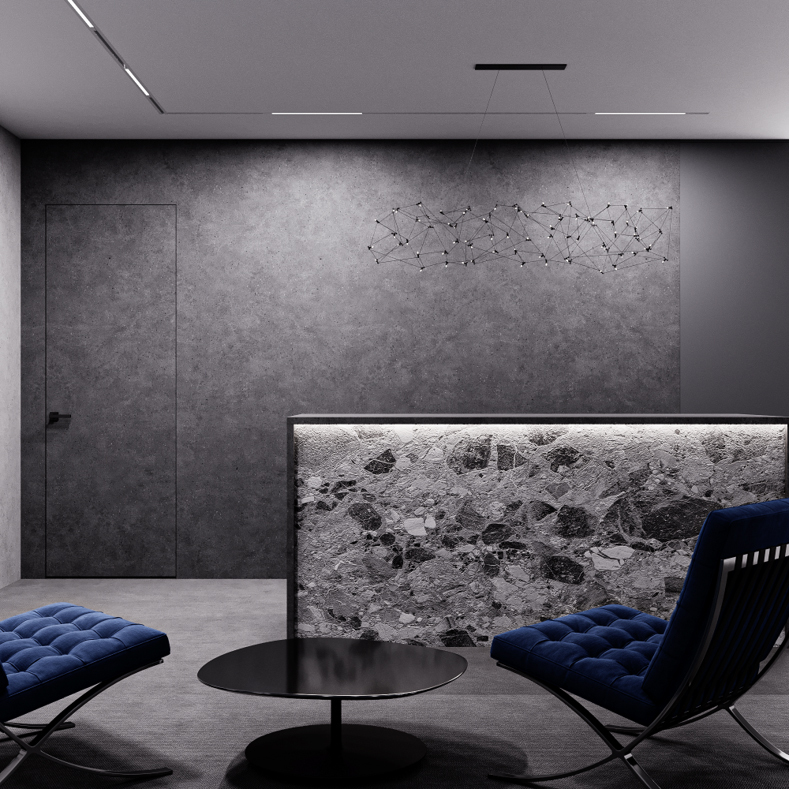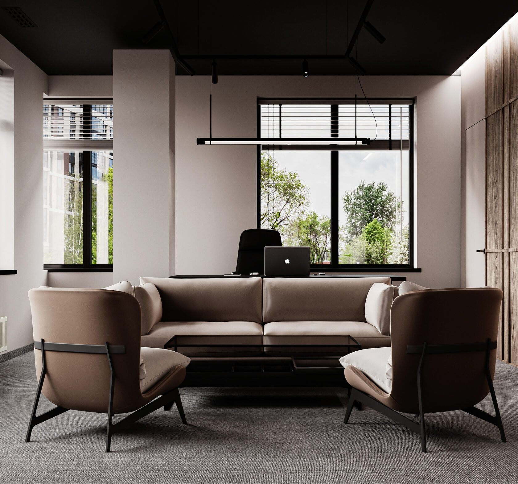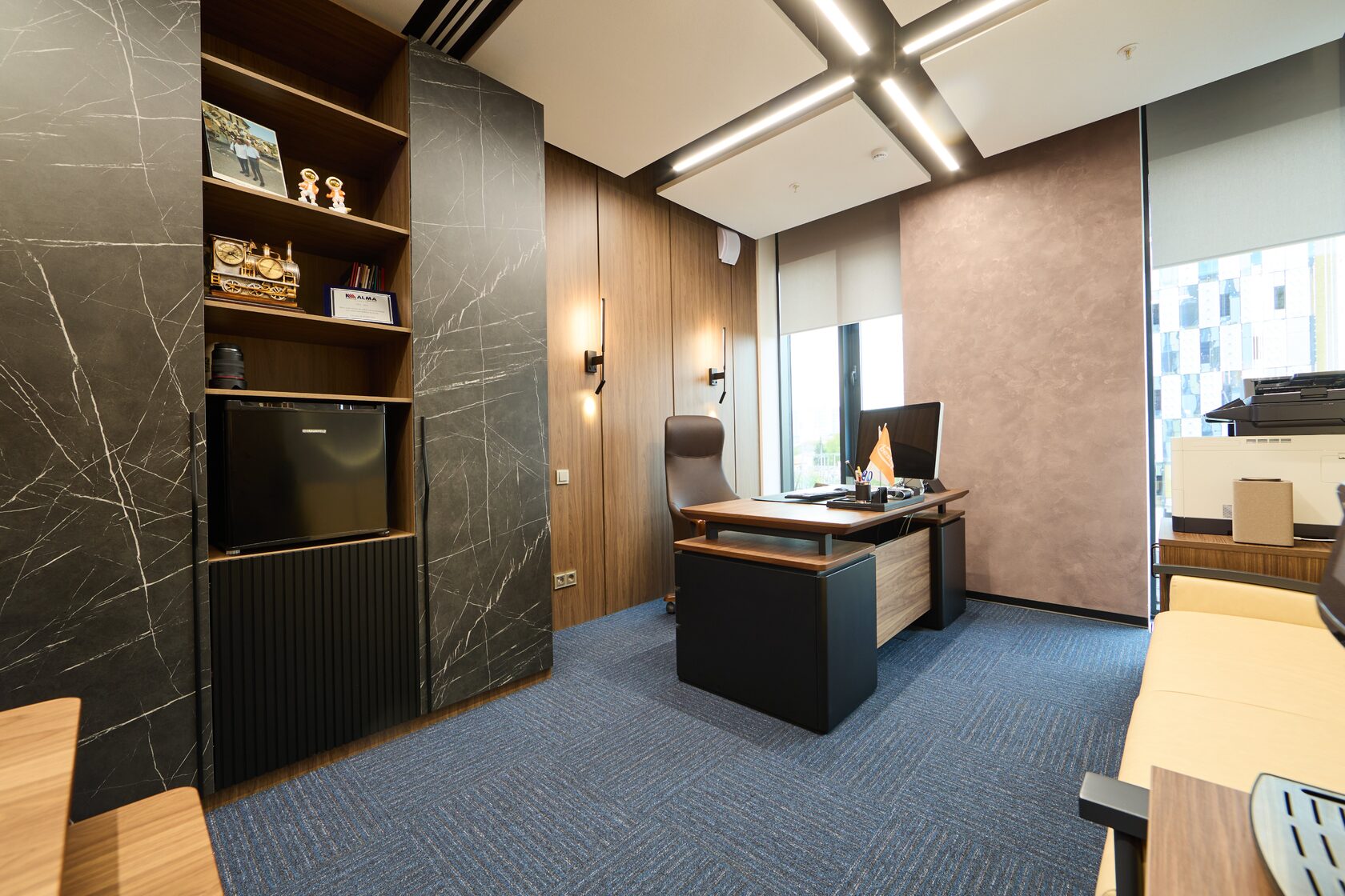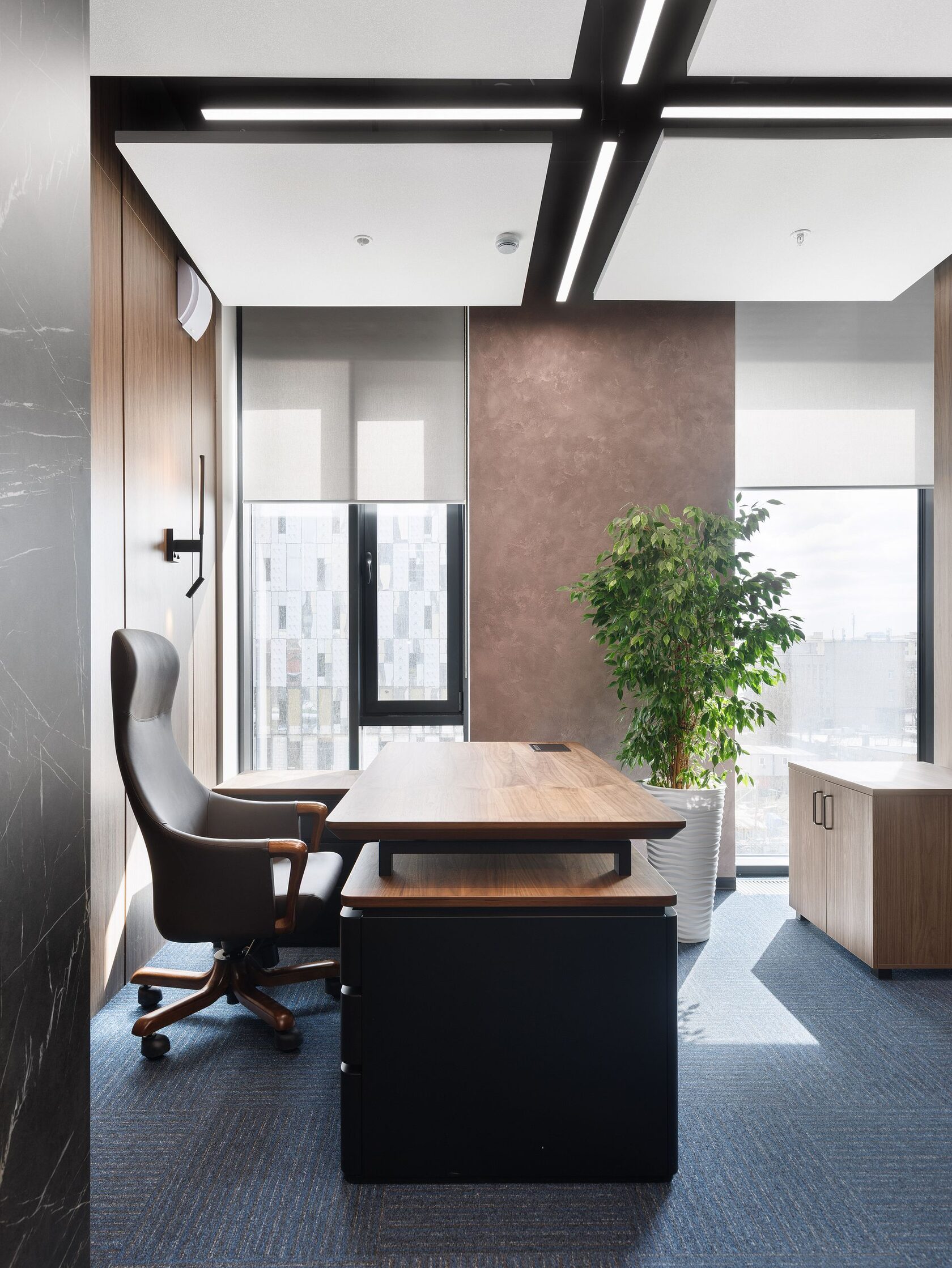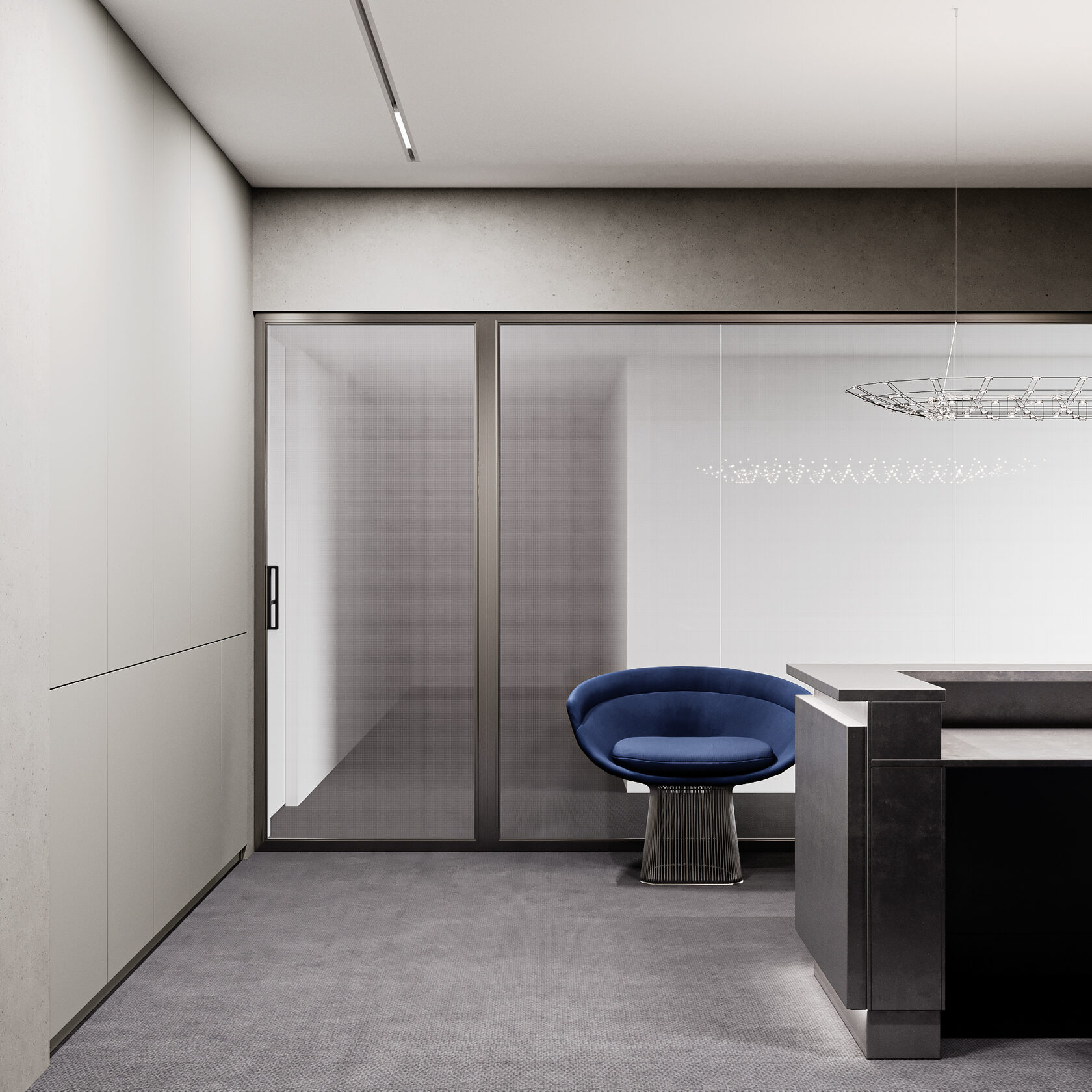 Концепция: Основная концепция дизайна направлена на создание атмосферы спокойствия и респектабельности. Интерьер построен на гармоничном сочетании приглушенных цветовых палитр и натуральных фактур, которые придают пространству изысканность. Яркие, но тщательно подобранные акценты в мебели и декоре оживляют интерьер, сохраняя при этом строгую деловую эстетику. Отличительной чертой является применение инновационных материалов, таких как каменный шпон, используемый в отделке мебели и стен, что подчеркивает уникальность и высокий статус проекта.