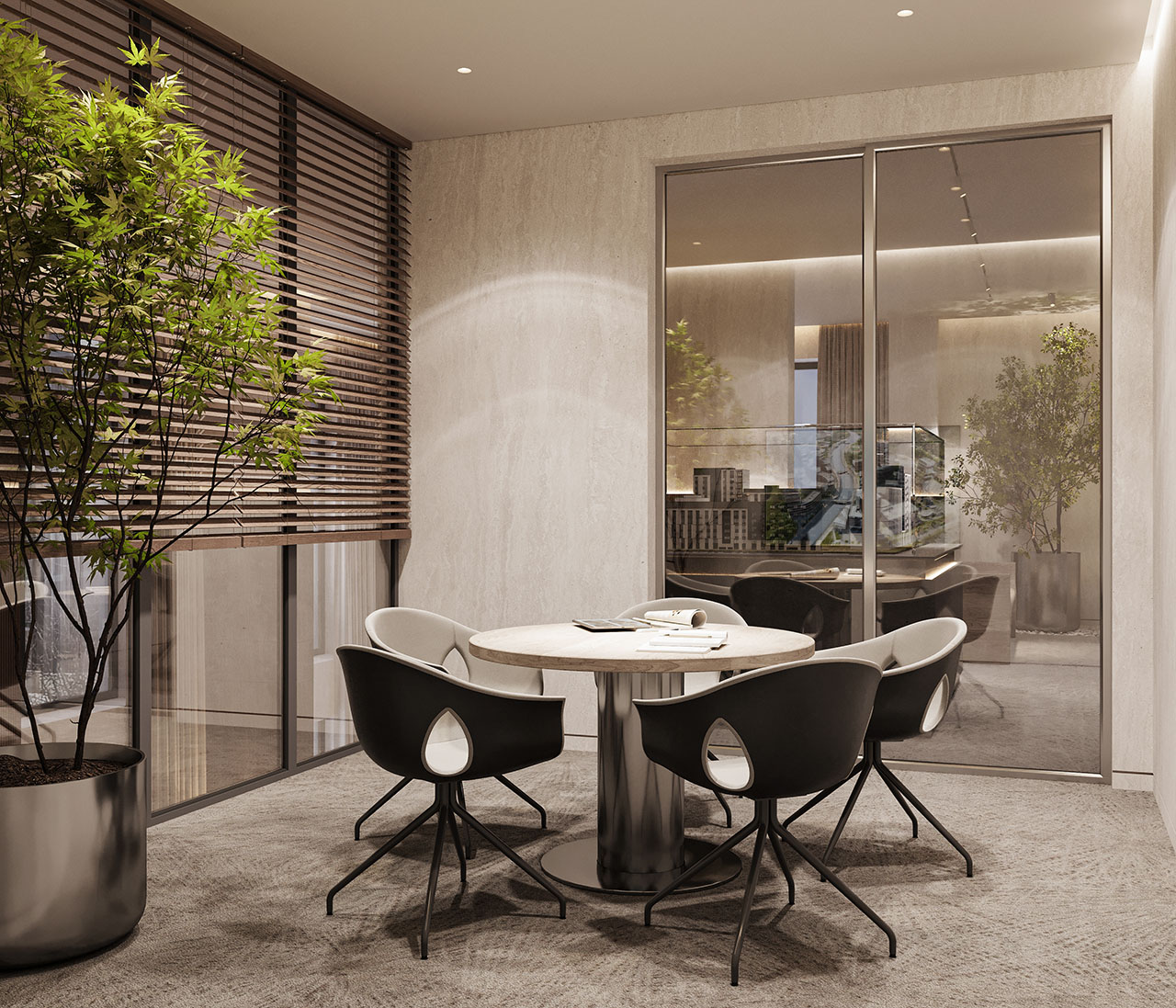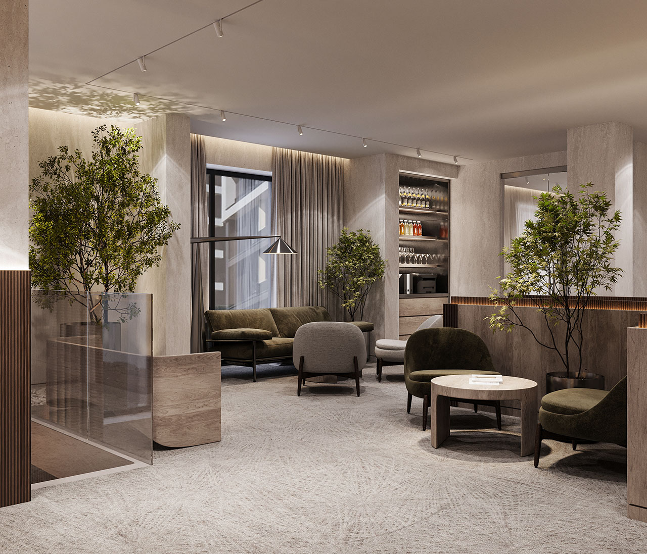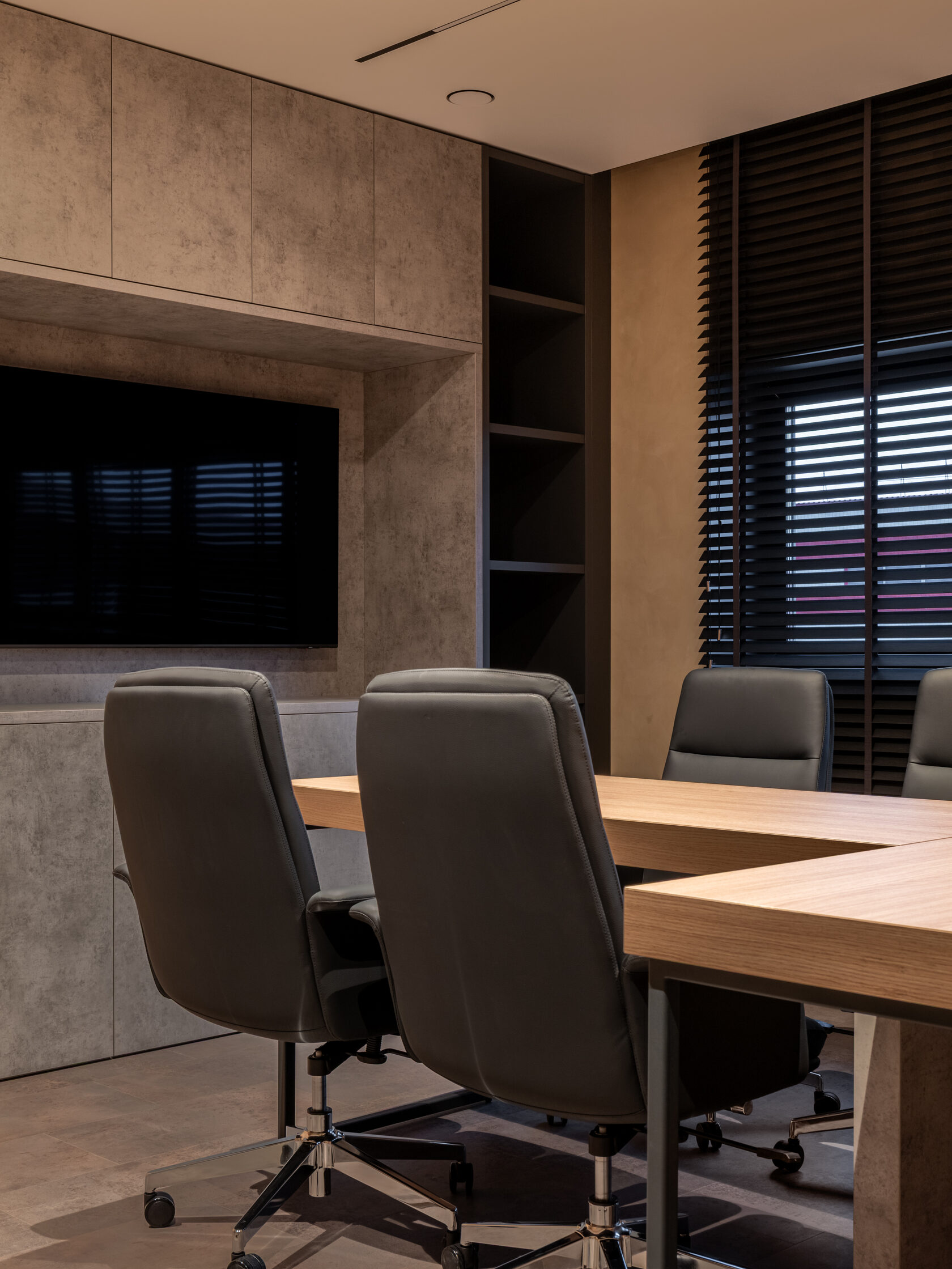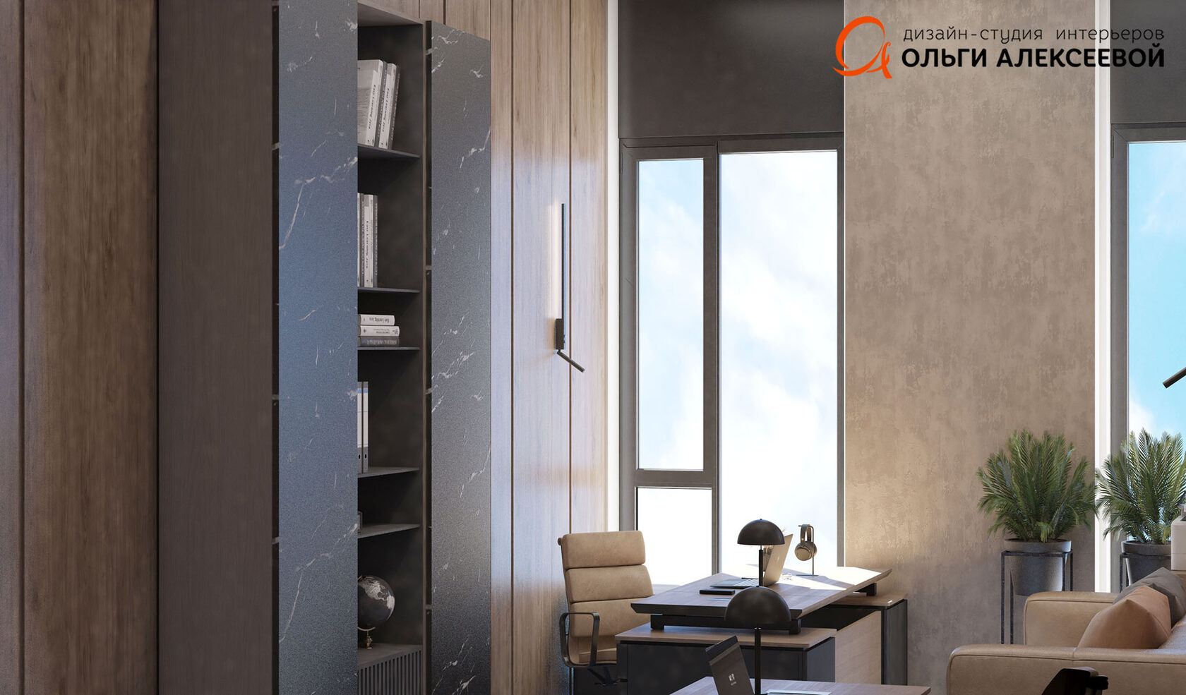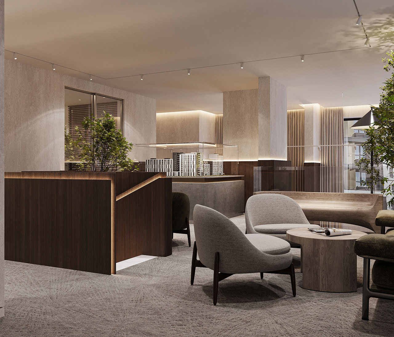 Концепция: Основная концепция дизайна направлена на создание атмосферы спокойствия и респектабельности. Интерьер построен на гармоничном сочетании приглушенных цветовых палитр и натуральных фактур, которые придают пространству изысканность. Яркие, но тщательно подобранные акценты в мебели и декоре оживляют интерьер, сохраняя при этом строгую деловую эстетику. Отличительной чертой является применение инновационных материалов, таких как каменный шпон, используемый в отделке мебели и стен, что подчеркивает уникальность и высокий статус проекта.