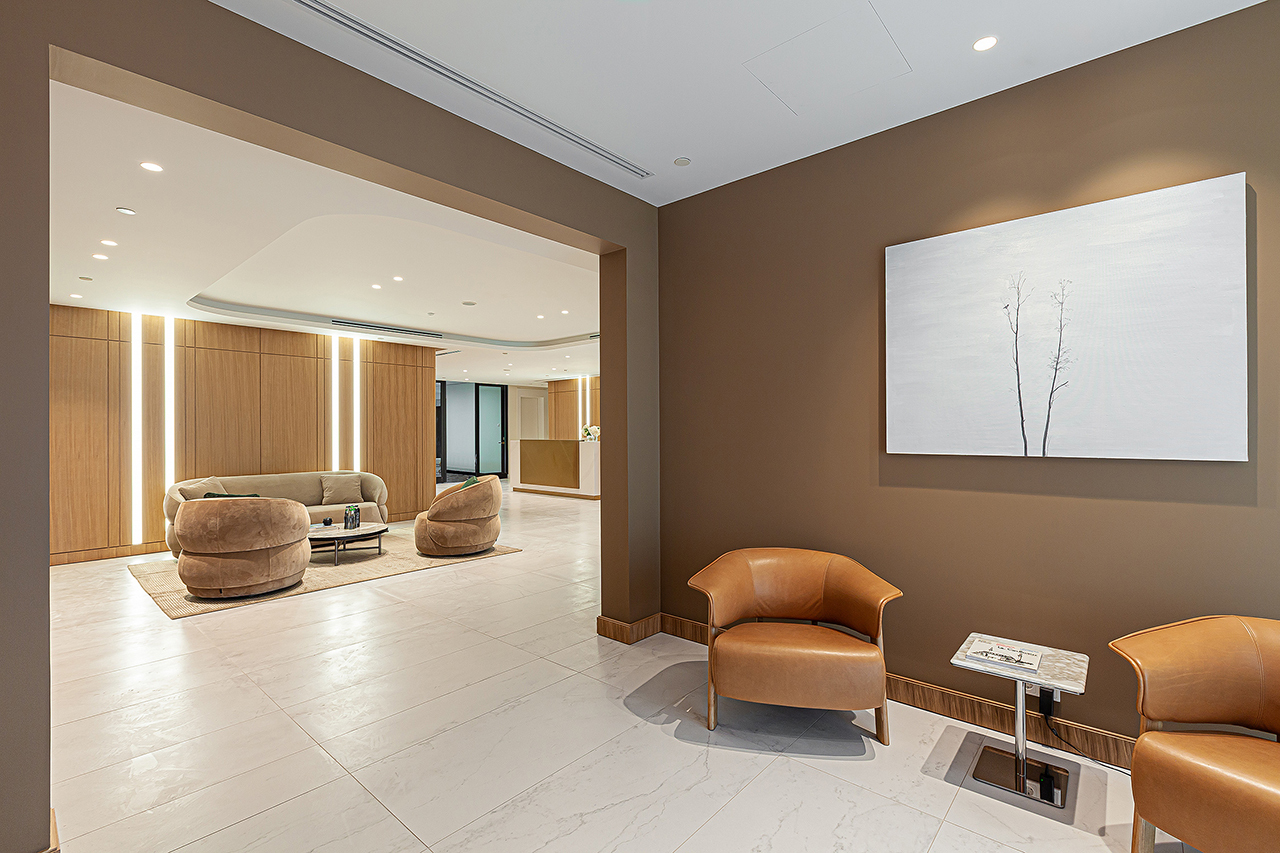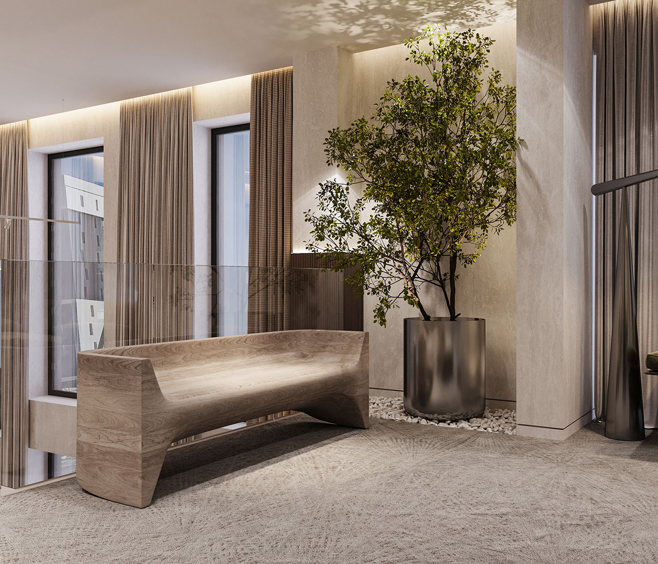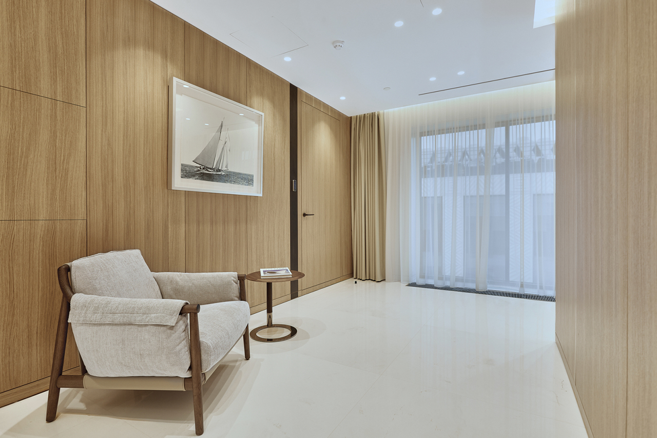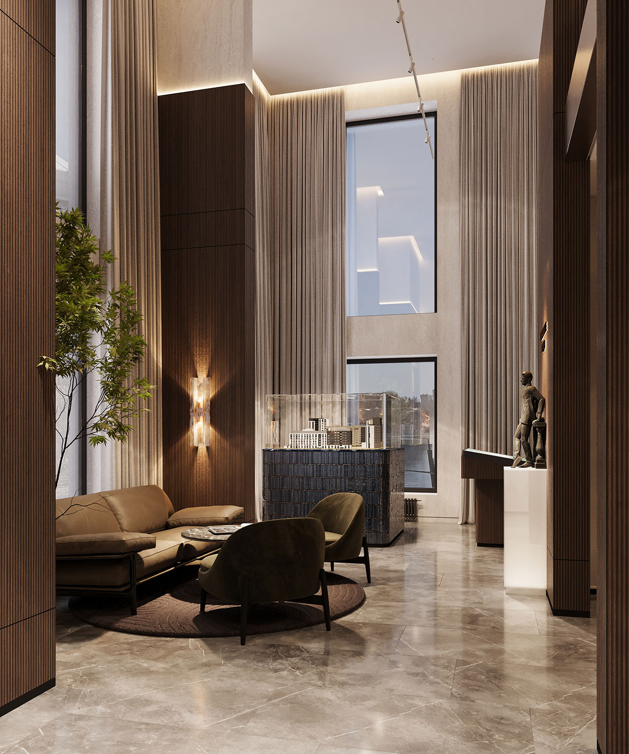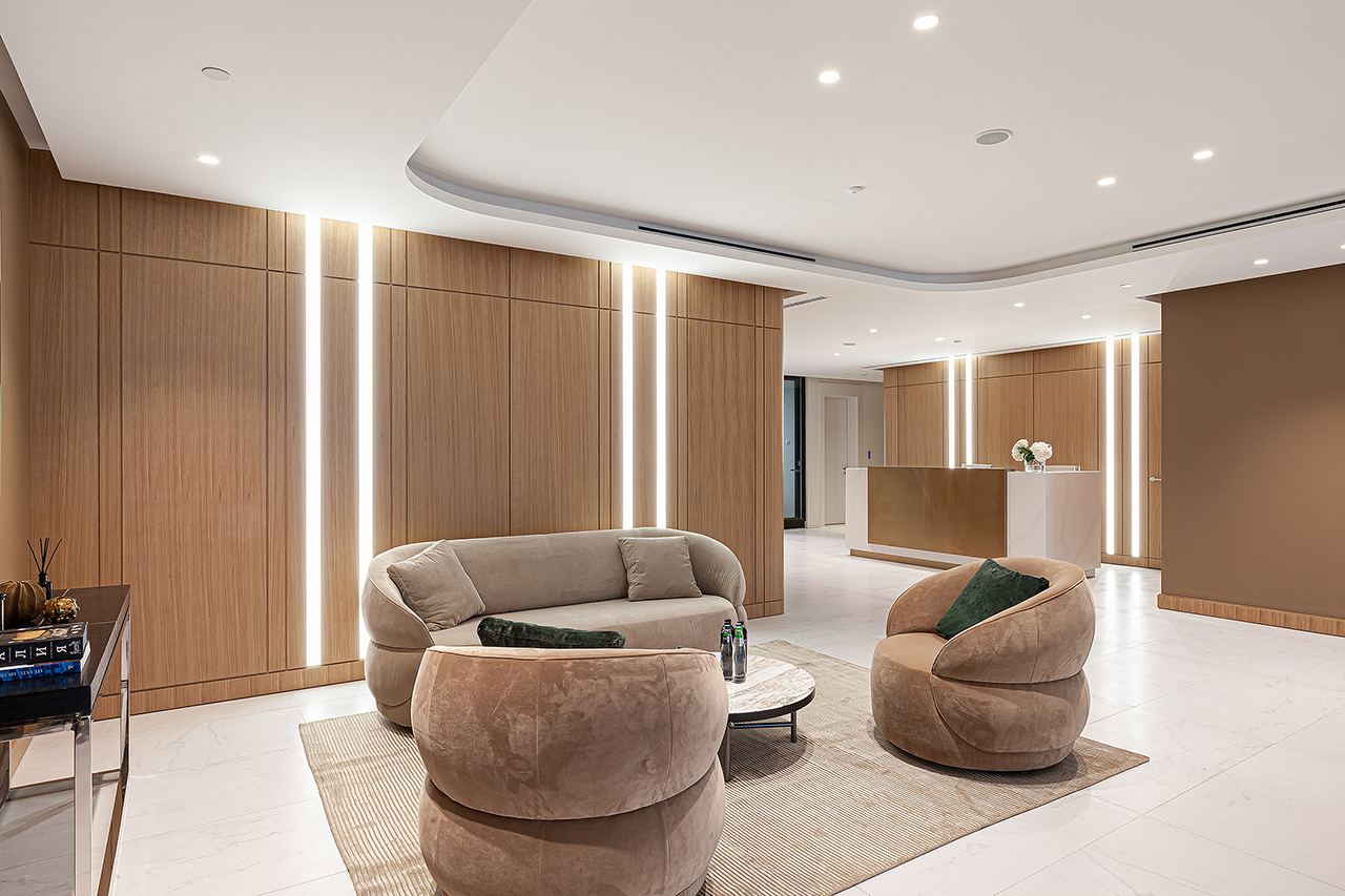 Концепция: Основная концепция дизайна направлена на создание атмосферы спокойствия и респектабельности. Интерьер построен на гармоничном сочетании приглушенных цветовых палитр и натуральных фактур, которые придают пространству изысканность. Яркие, но тщательно подобранные акценты в мебели и декоре оживляют интерьер, сохраняя при этом строгую деловую эстетику. Отличительной чертой является применение инновационных материалов, таких как каменный шпон, используемый в отделке мебели и стен, что подчеркивает уникальность и высокий статус проекта.