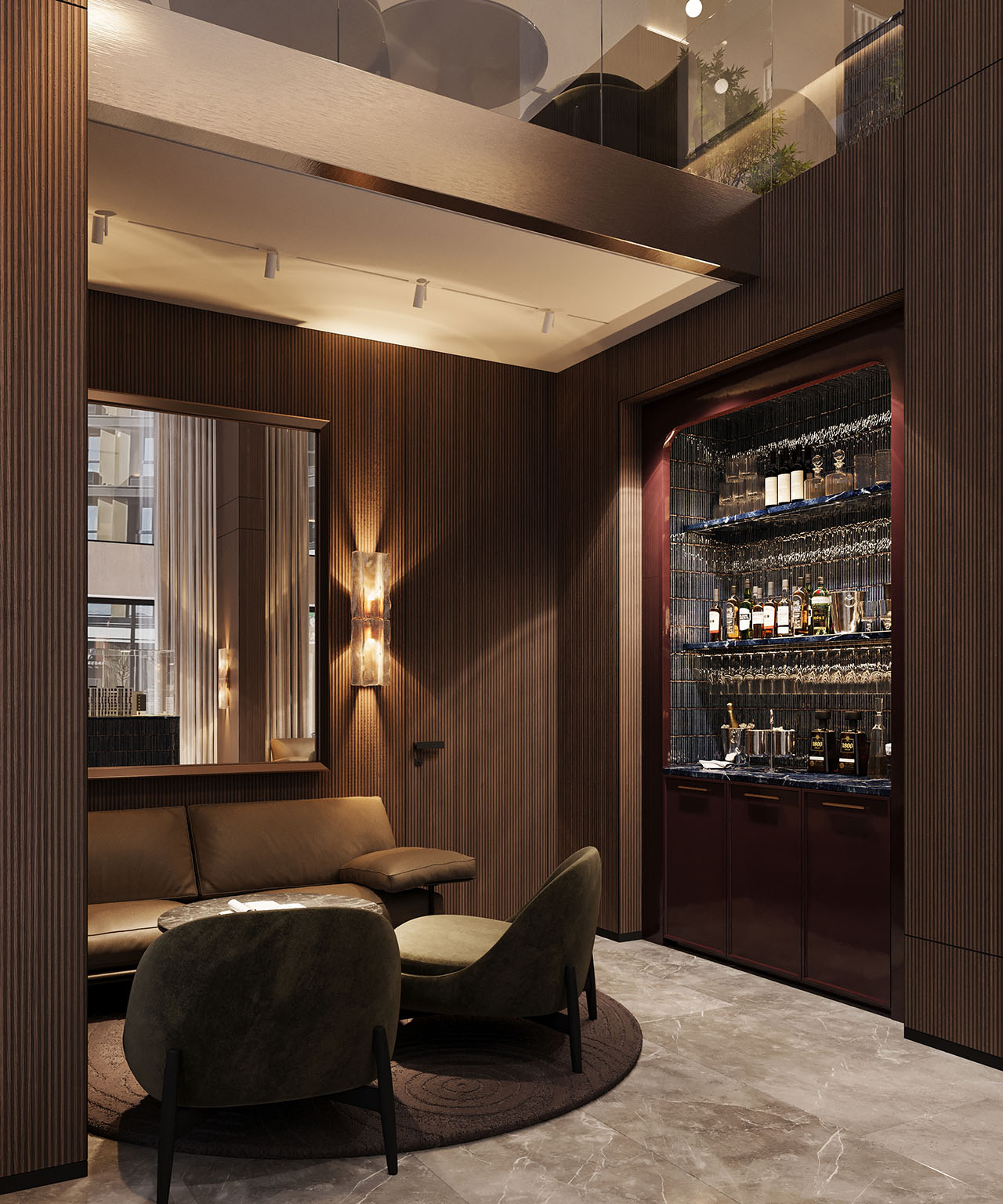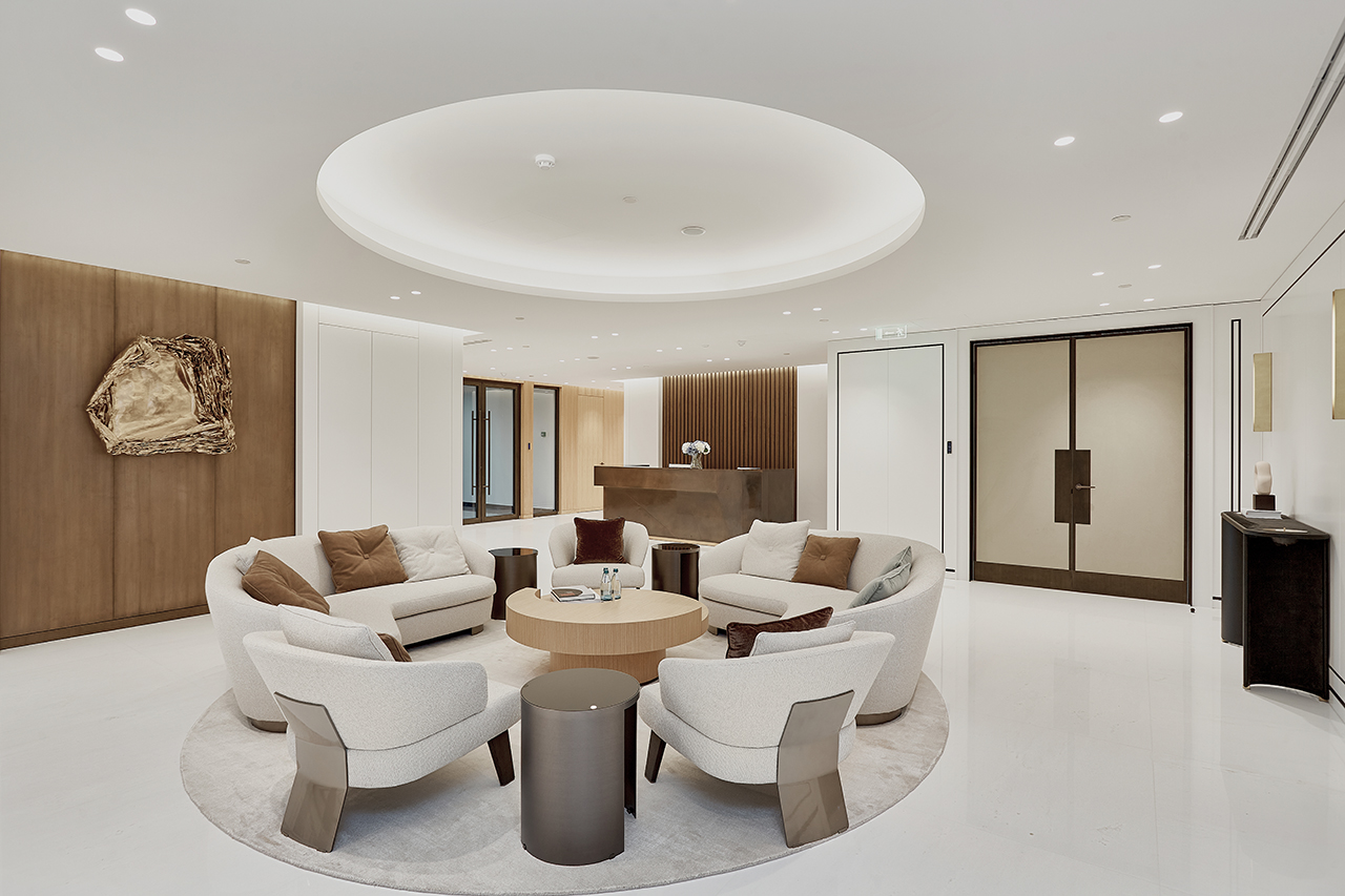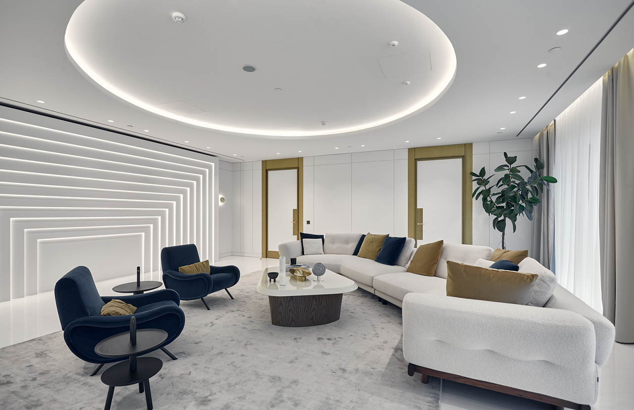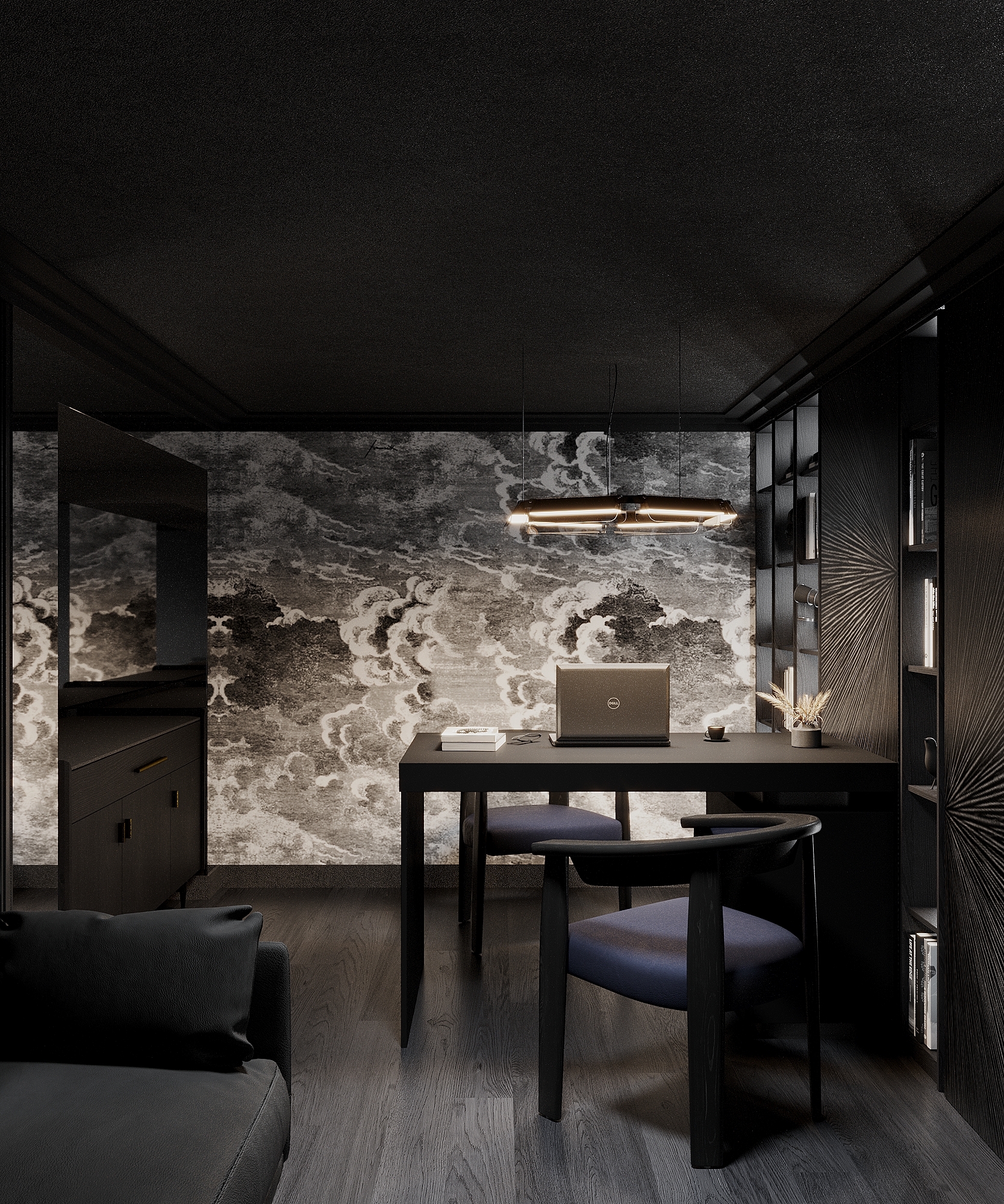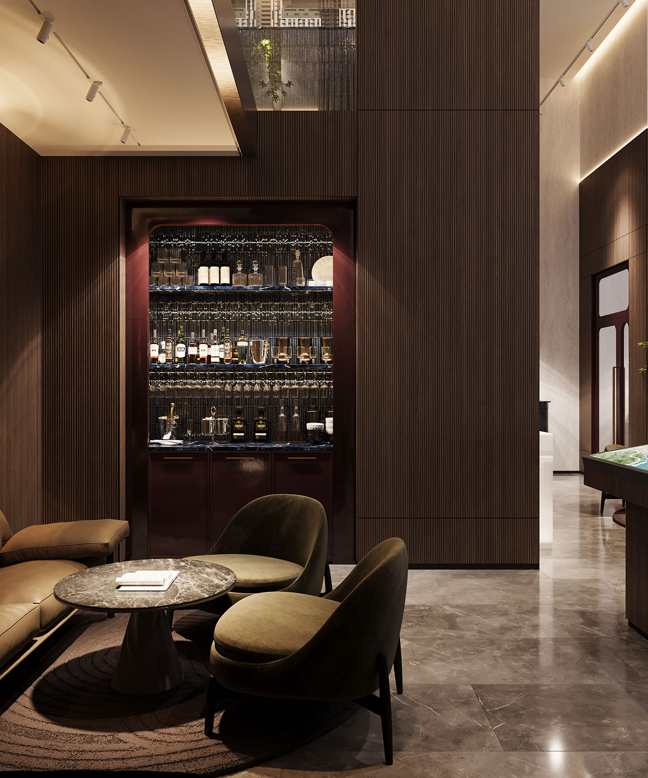 Концепция: Основная концепция дизайна направлена на создание атмосферы спокойствия и респектабельности. Интерьер построен на гармоничном сочетании приглушенных цветовых палитр и натуральных фактур, которые придают пространству изысканность. Яркие, но тщательно подобранные акценты в мебели и декоре оживляют интерьер, сохраняя при этом строгую деловую эстетику. Отличительной чертой является применение инновационных материалов, таких как каменный шпон, используемый в отделке мебели и стен, что подчеркивает уникальность и высокий статус проекта.