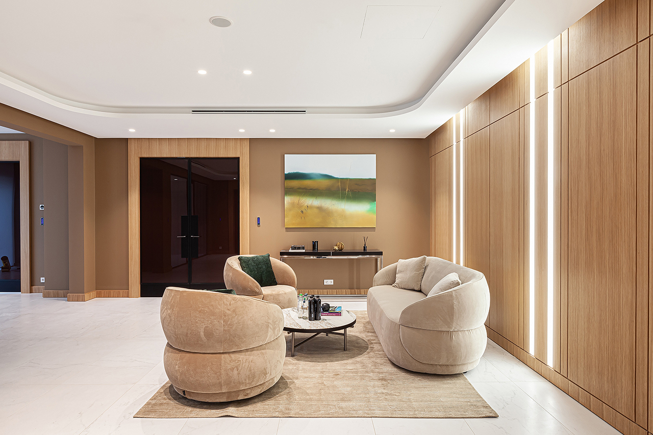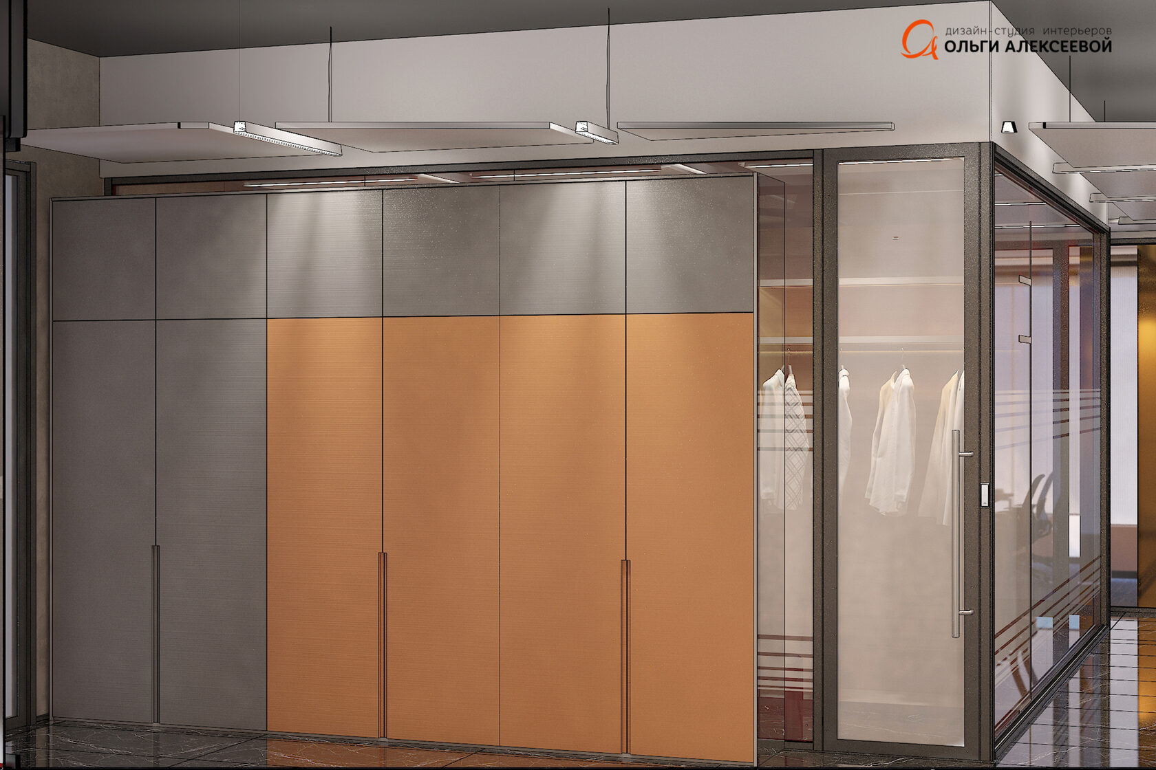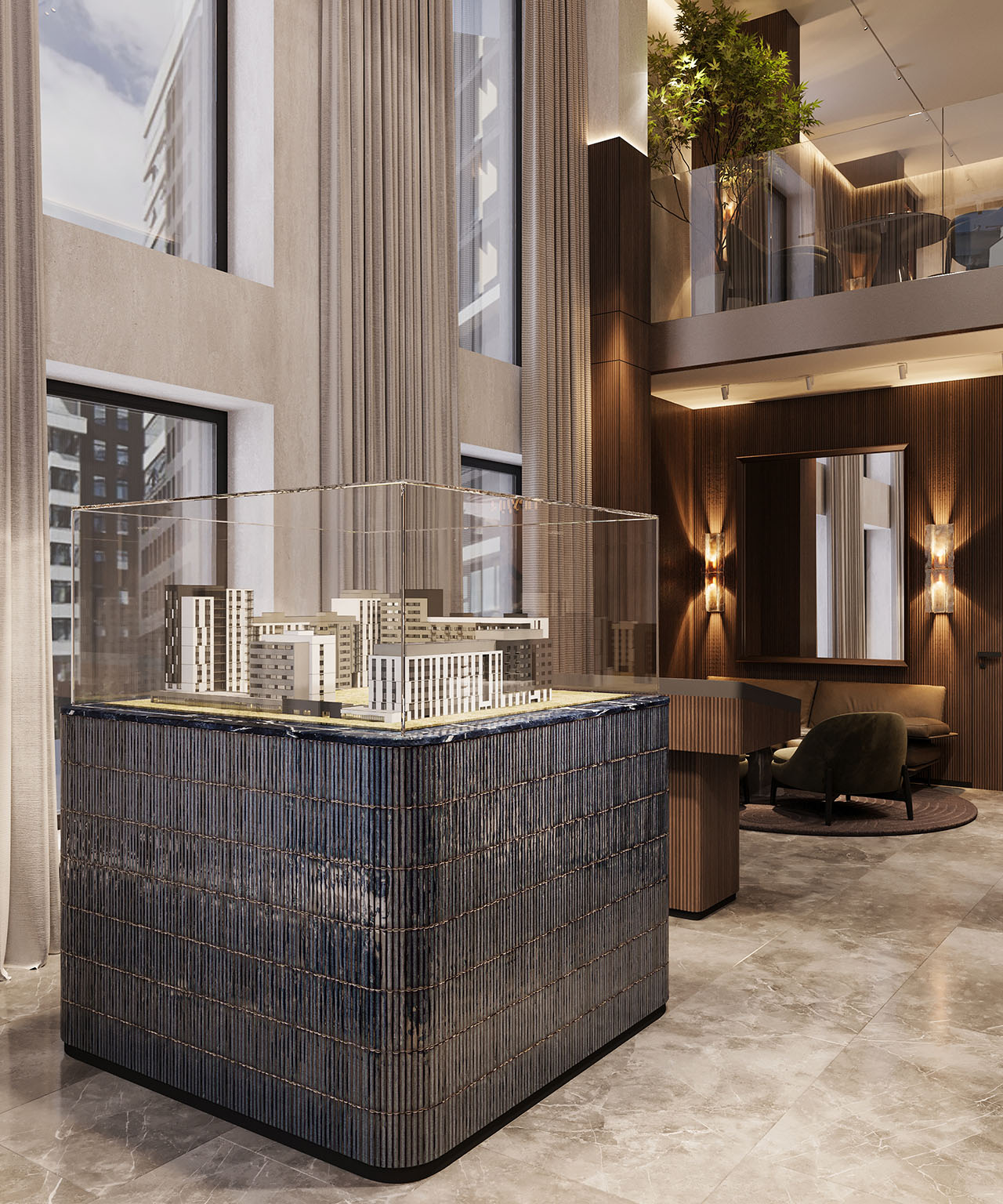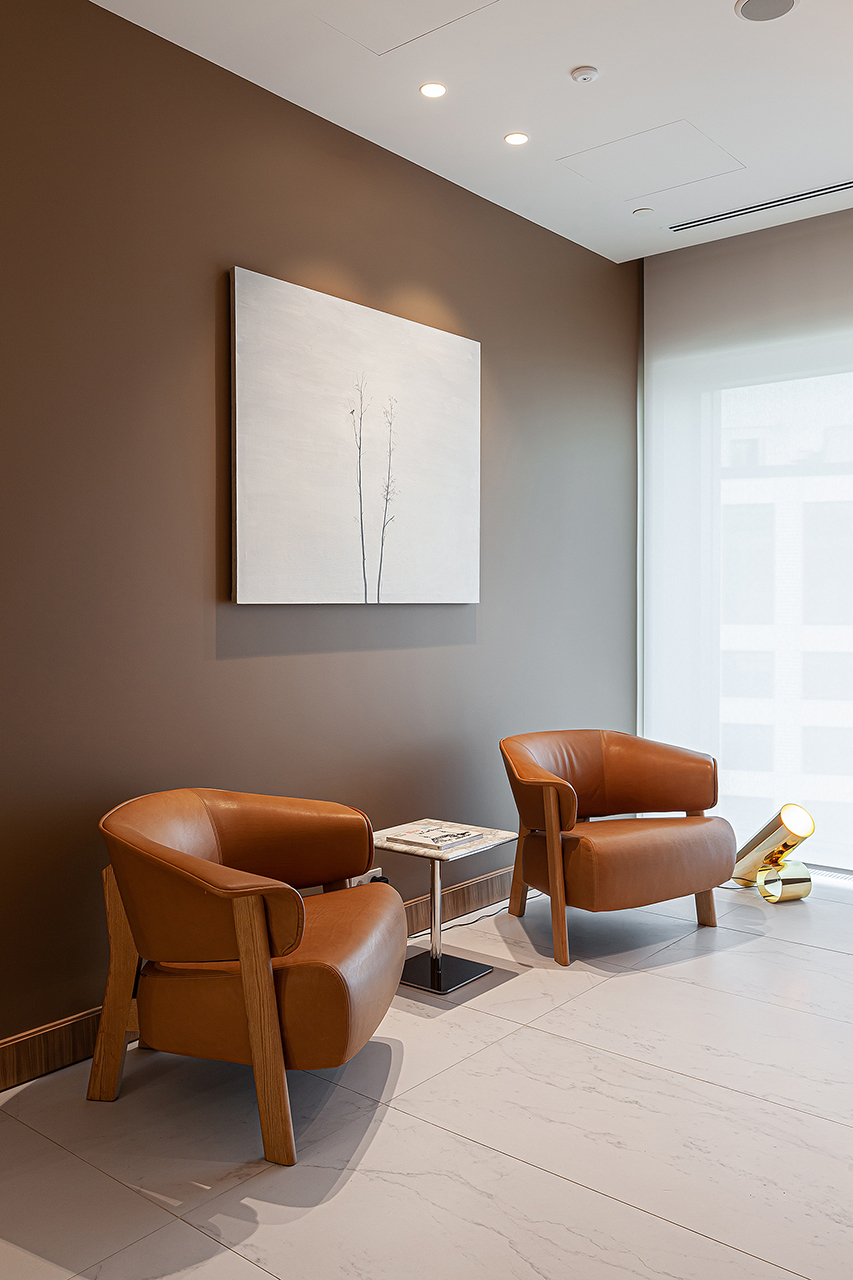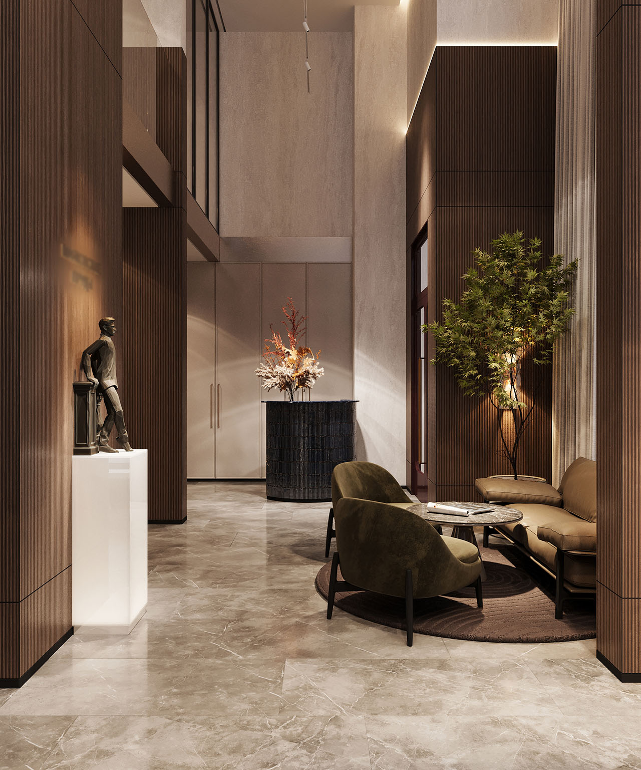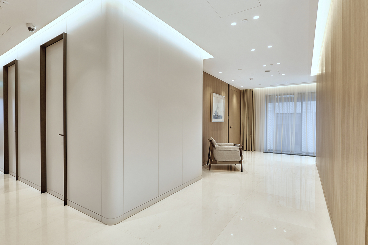 Концепция: Основная концепция дизайна направлена на создание атмосферы спокойствия и респектабельности. Интерьер построен на гармоничном сочетании приглушенных цветовых палитр и натуральных фактур, которые придают пространству изысканность. Яркие, но тщательно подобранные акценты в мебели и декоре оживляют интерьер, сохраняя при этом строгую деловую эстетику. Отличительной чертой является применение инновационных материалов, таких как каменный шпон, используемый в отделке мебели и стен, что подчеркивает уникальность и высокий статус проекта.
