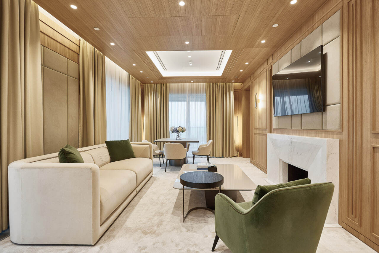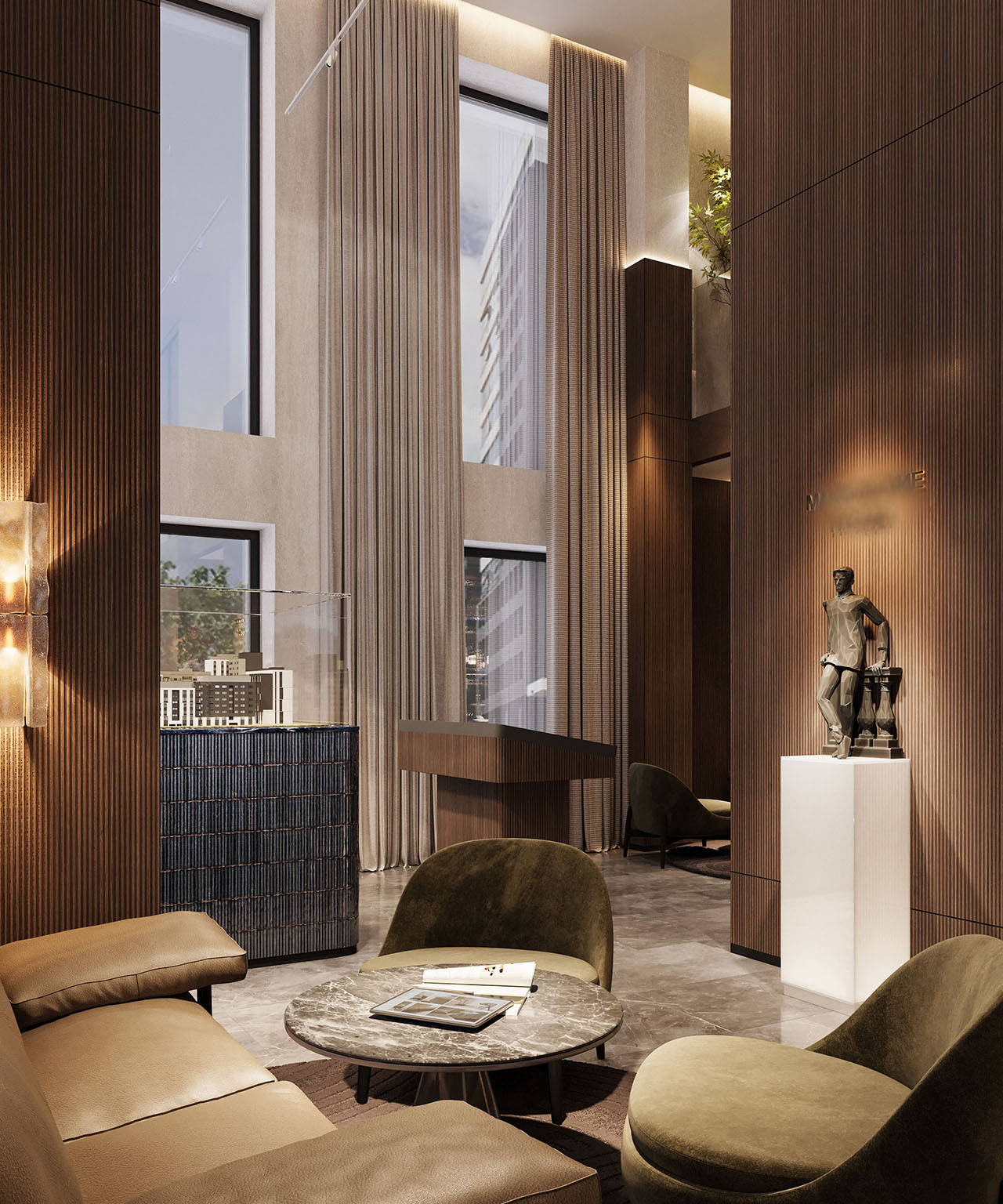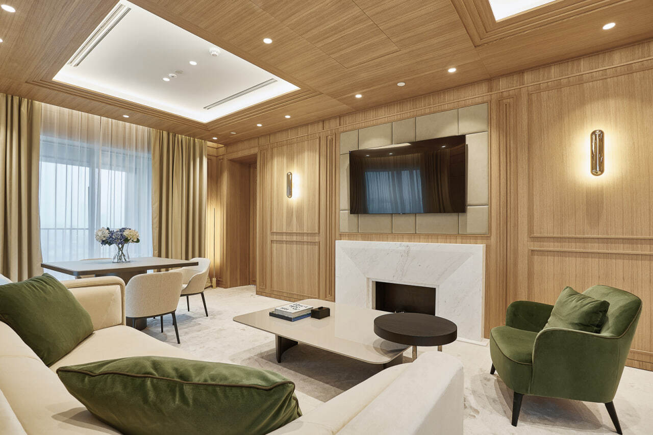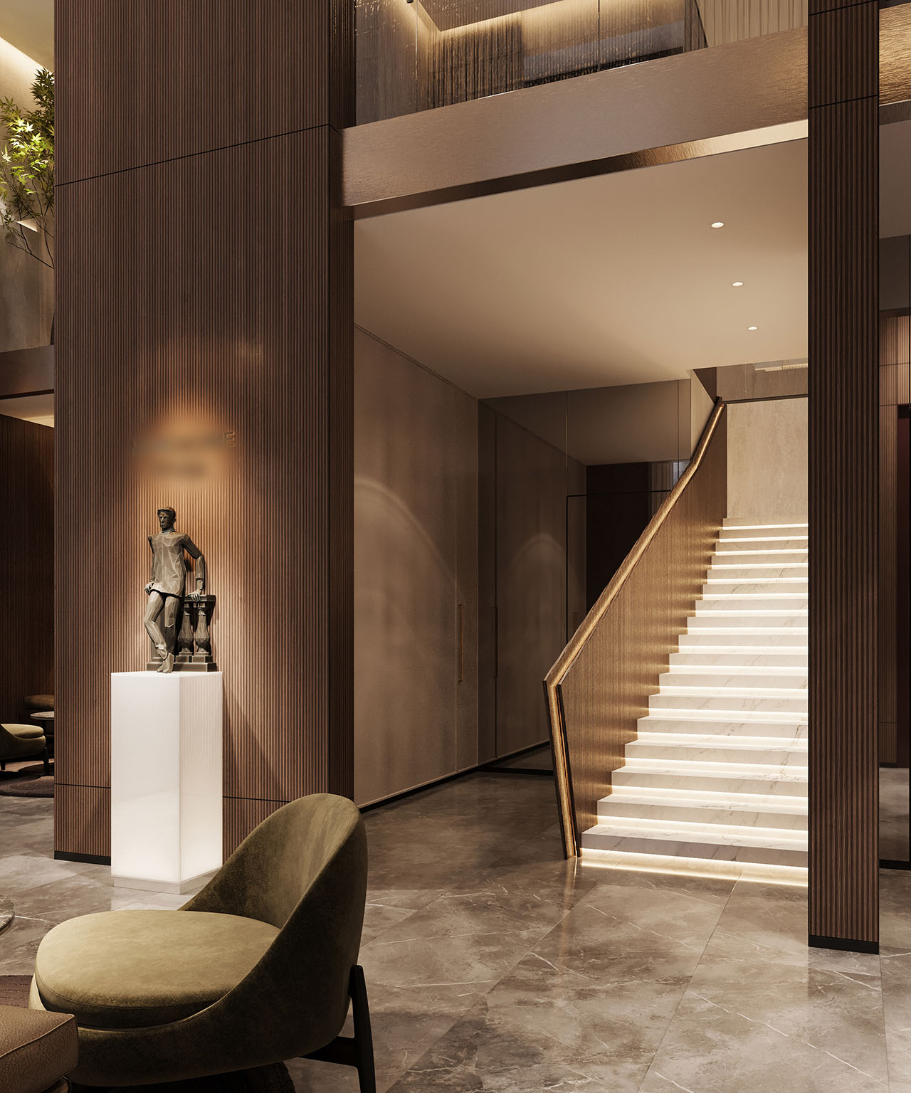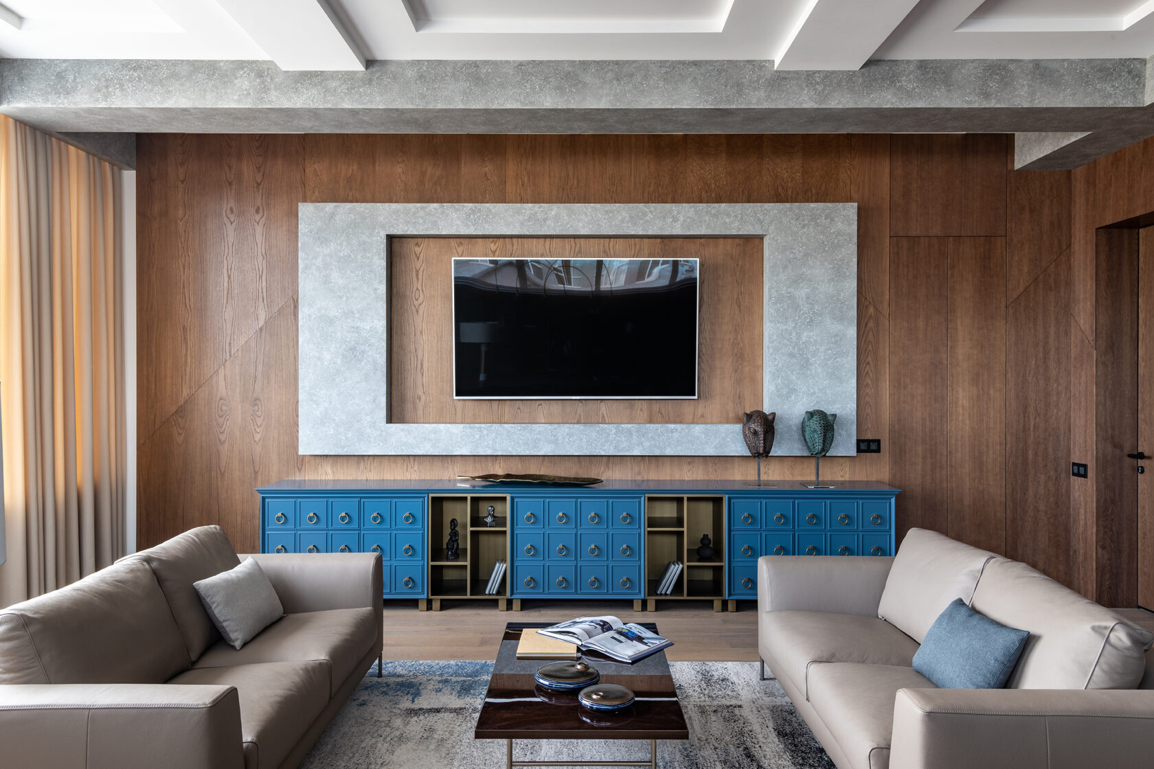 Концепция: Основная концепция дизайна направлена на создание атмосферы спокойствия и респектабельности. Интерьер построен на гармоничном сочетании приглушенных цветовых палитр и натуральных фактур, которые придают пространству изысканность. Яркие, но тщательно подобранные акценты в мебели и декоре оживляют интерьер, сохраняя при этом строгую деловую эстетику. Отличительной чертой является применение инновационных материалов, таких как каменный шпон, используемый в отделке мебели и стен, что подчеркивает уникальность и высокий статус проекта.