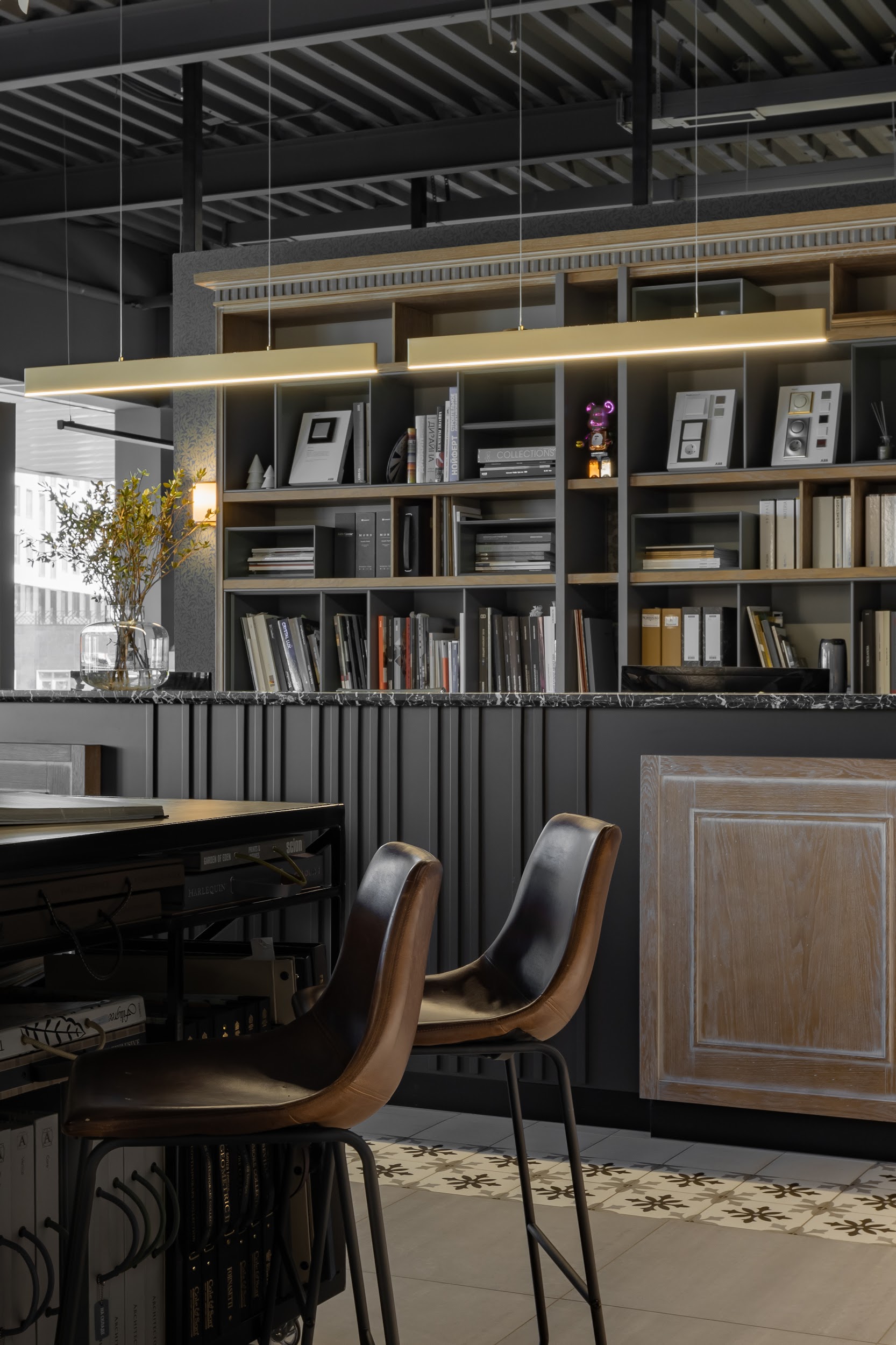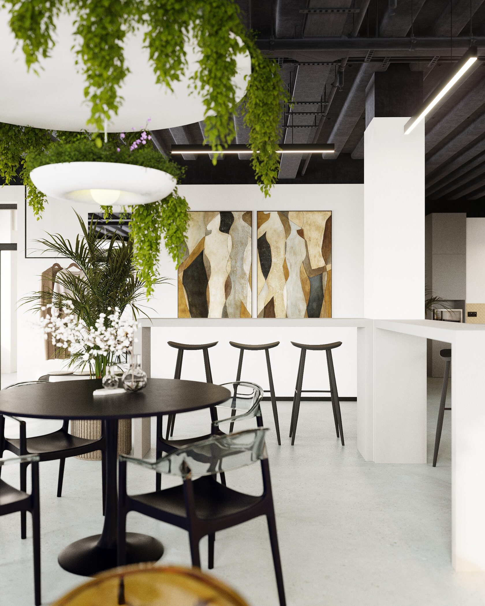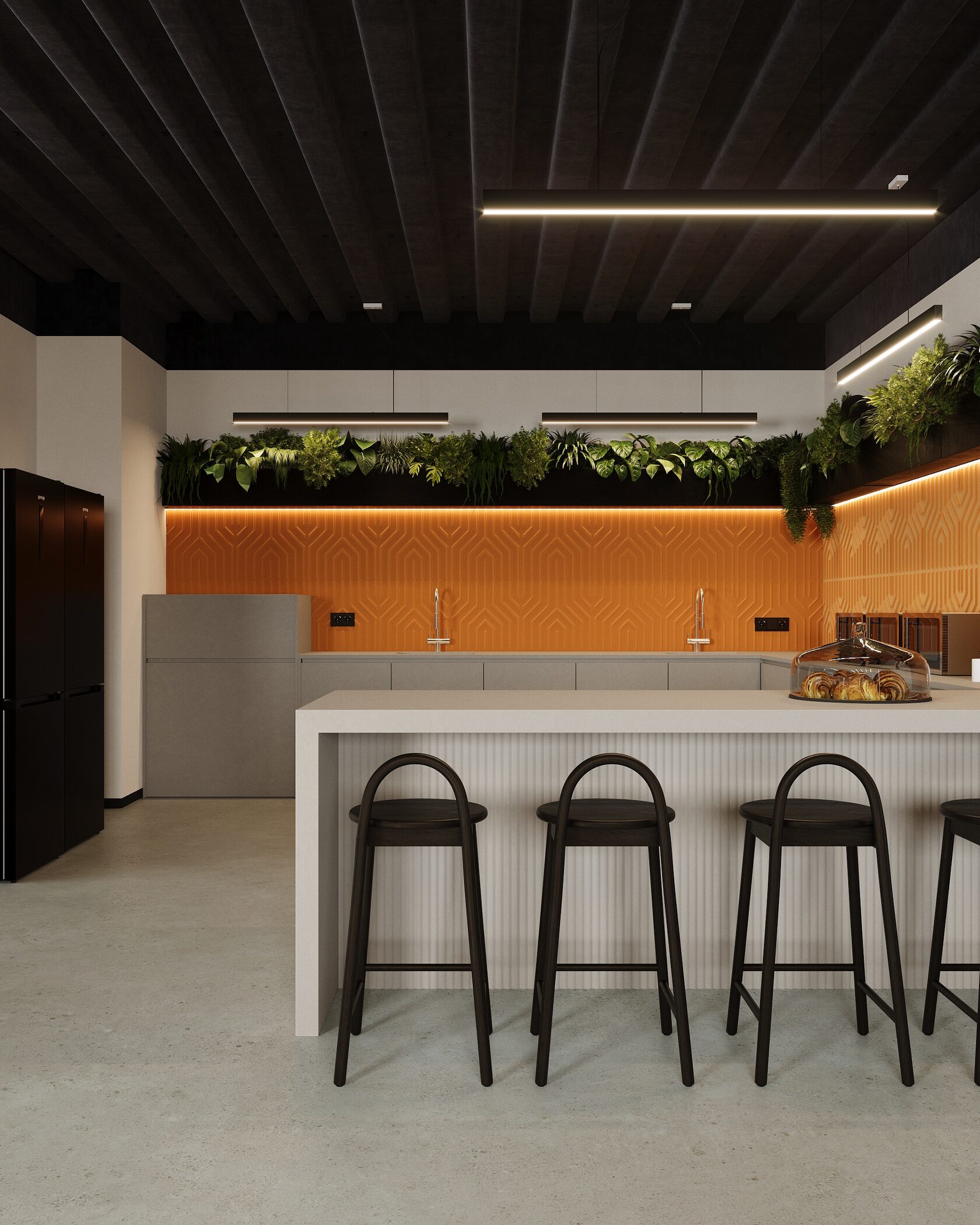 Функциональность усилили мобильные перегородки между рабочей зоной, переговорной и кухней. За счет стеклянных секций их можно объединять, создавая трансформируемое пространство. В кухне, оформленной в индустриальном стиле, визуальный центр — волнообразная система светильников. Стены и потолки здесь окрашены в глубокий черный, что подчеркнуло мебельные акценты и добавило уюта.