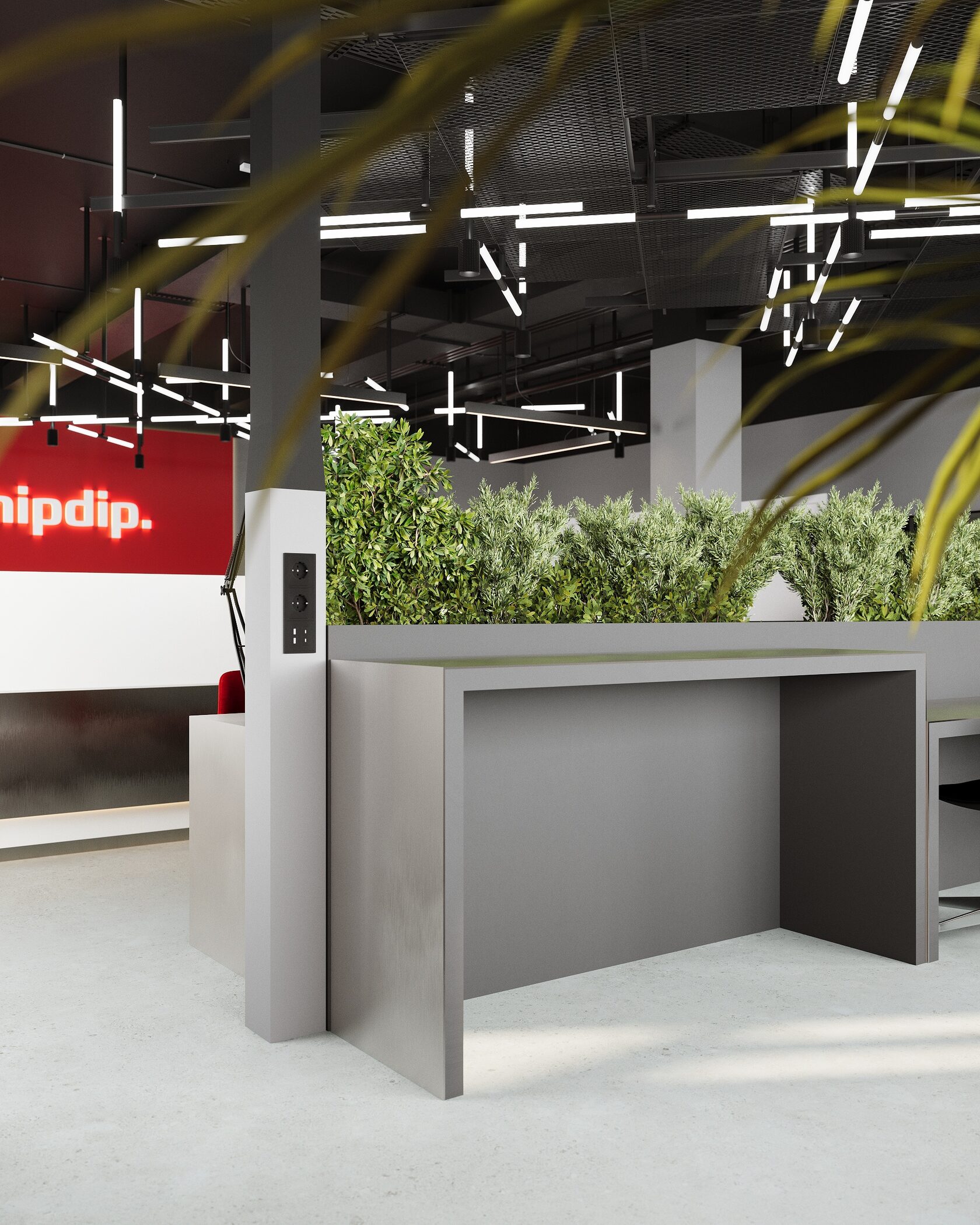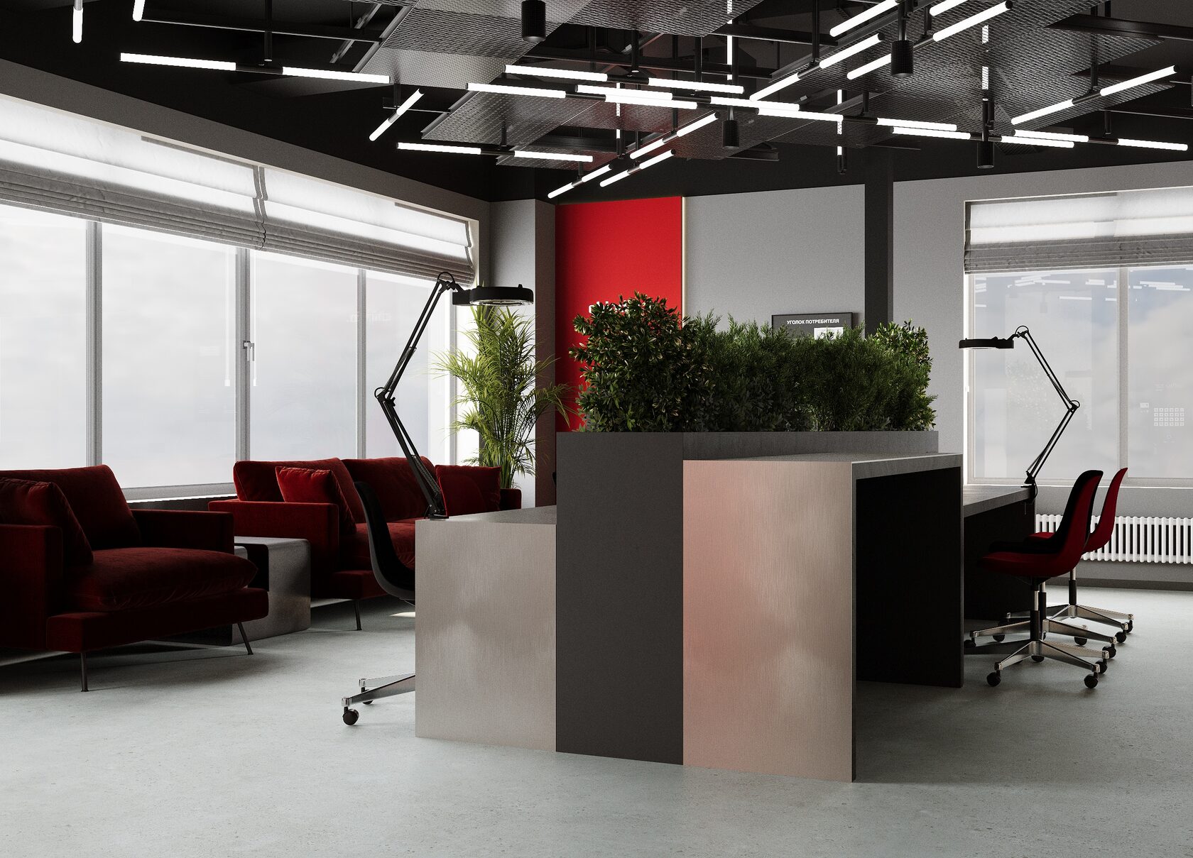 Для создания ощущения простора и легкости я использовала зеркальные перегородки в переговорной, что визуально расширило помещение. Отдел продаж зонирован металлической конструкцией с живыми растениями, добавляющими живой, «мягкий» акцент в брутальное индустриальное пространство. Рабочие места: