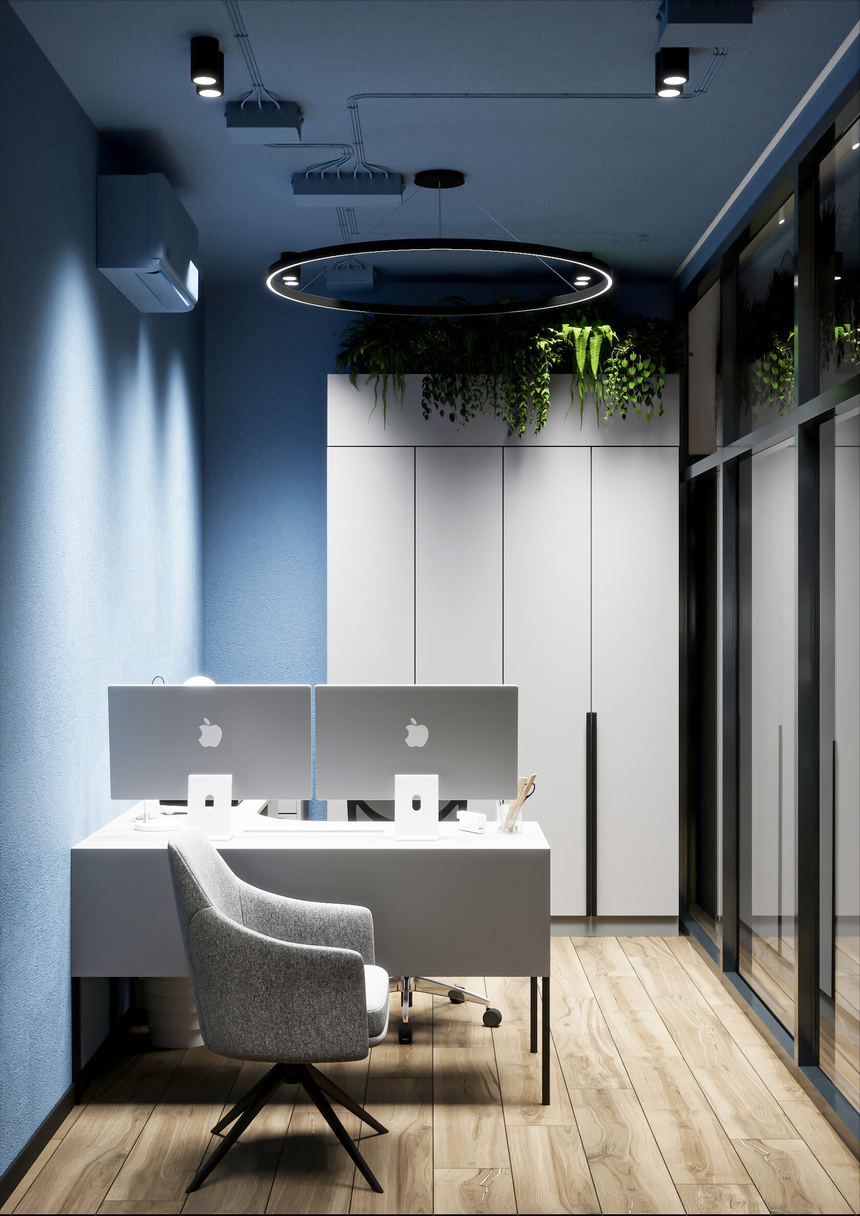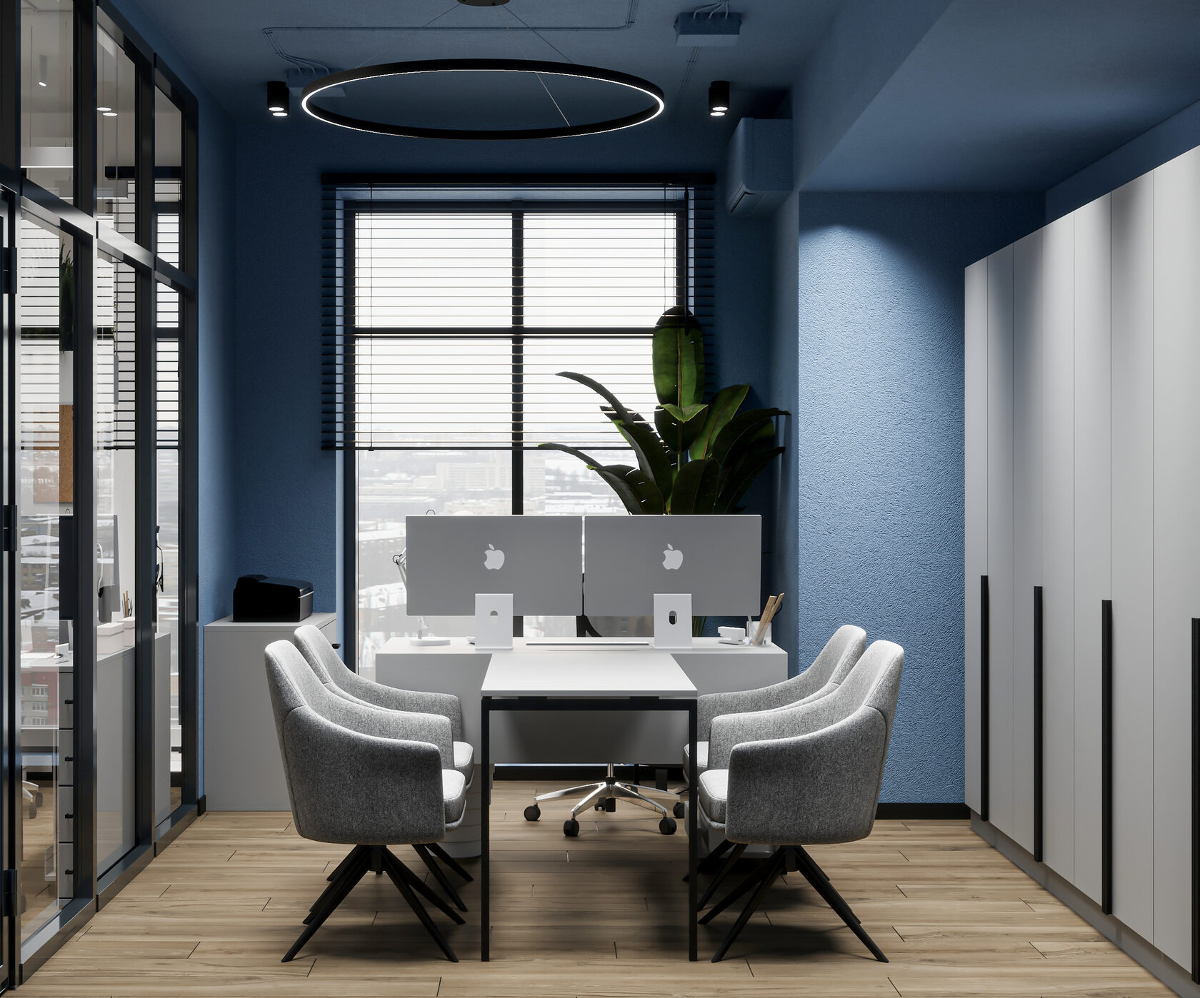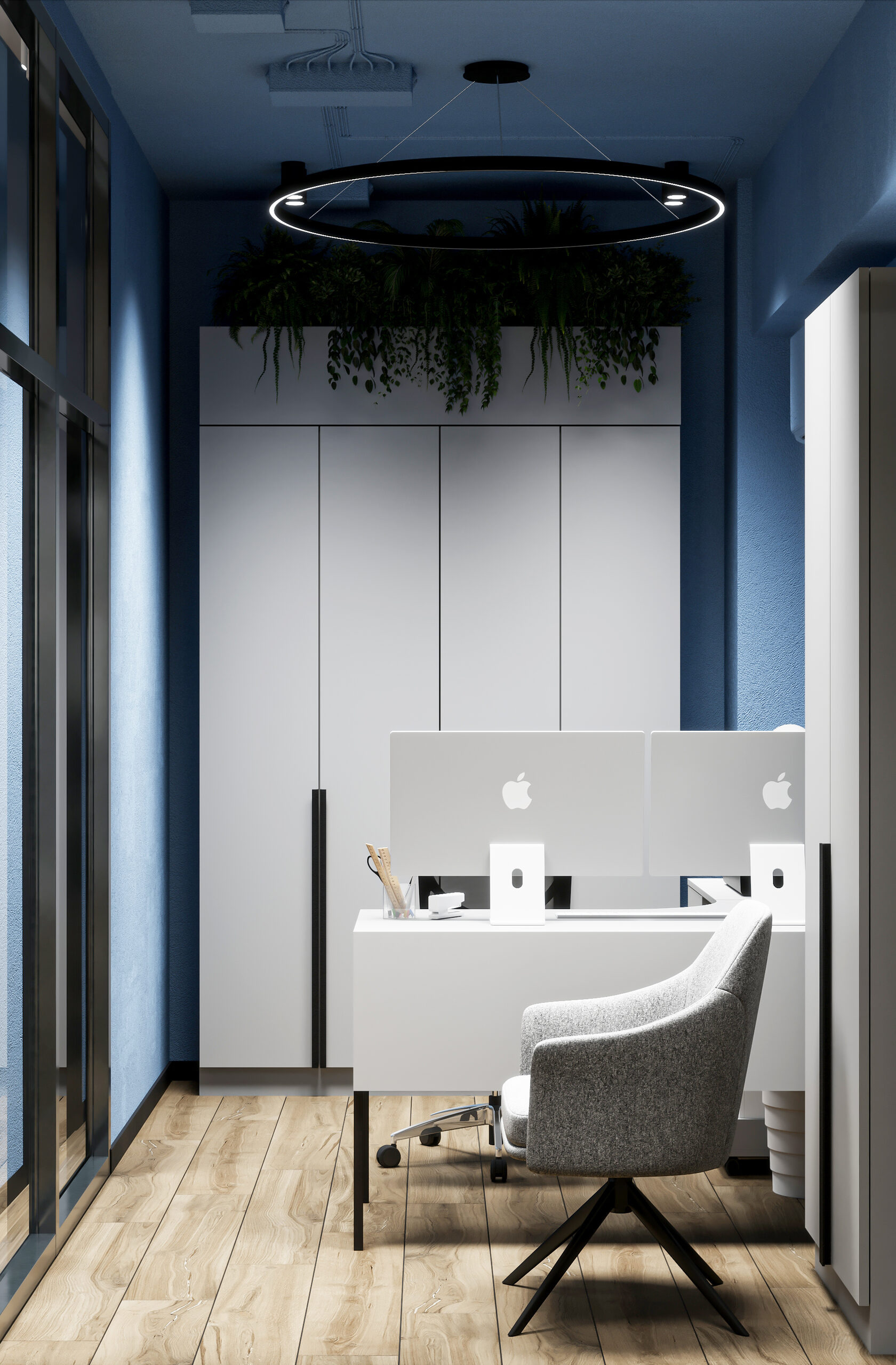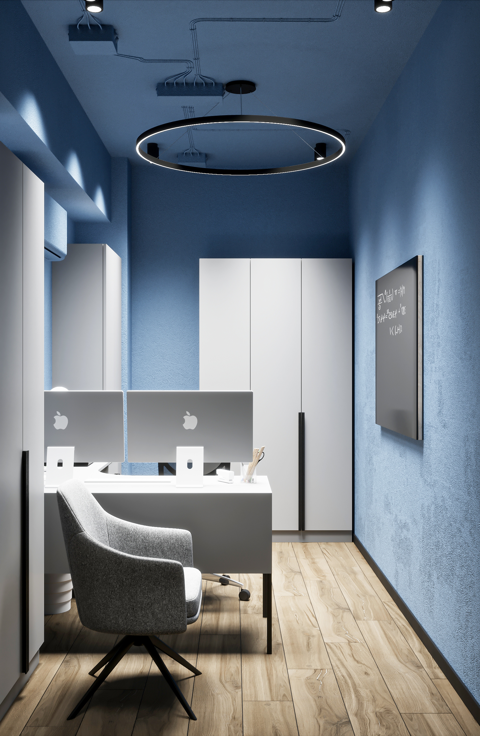 Цветовая гамма: доминирующий холодный оттенок синего создает фокусирующее пространство, пробуждая креативность и добавляя ощущение свободы. Этот цвет органично сочетается с холодным блеском металла, который используется в каркасах мебели, светильниках и декоративных элементах.