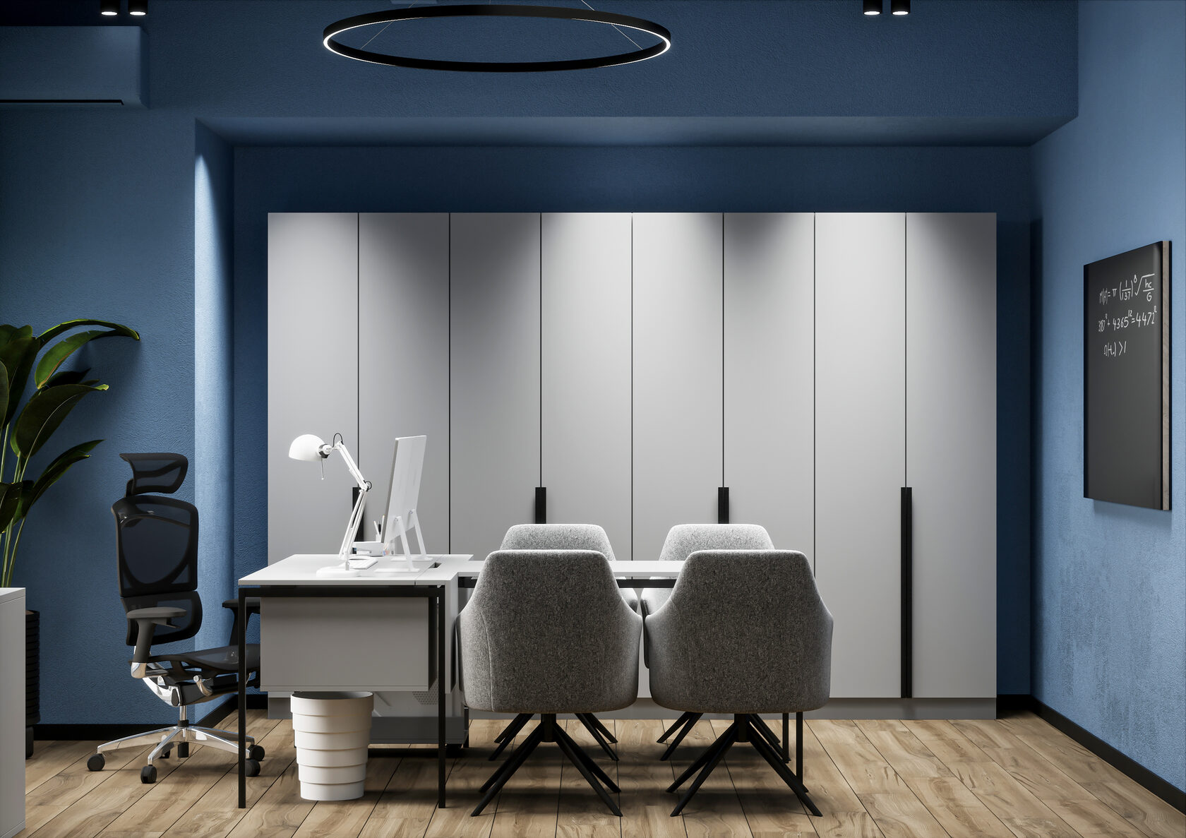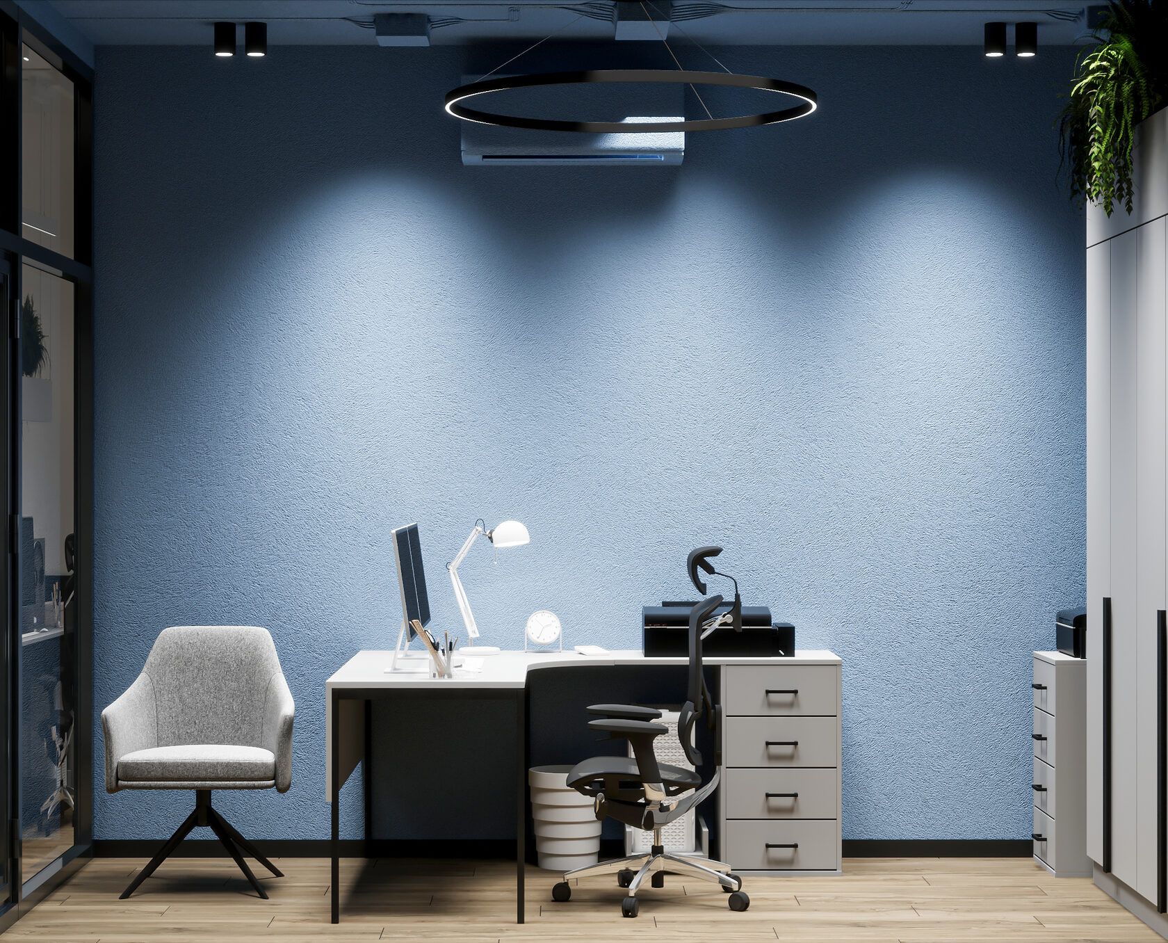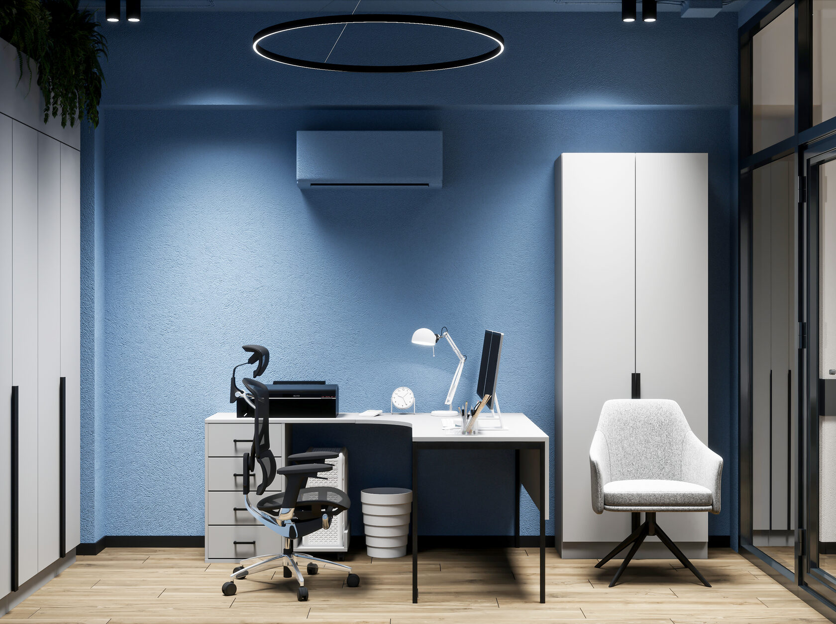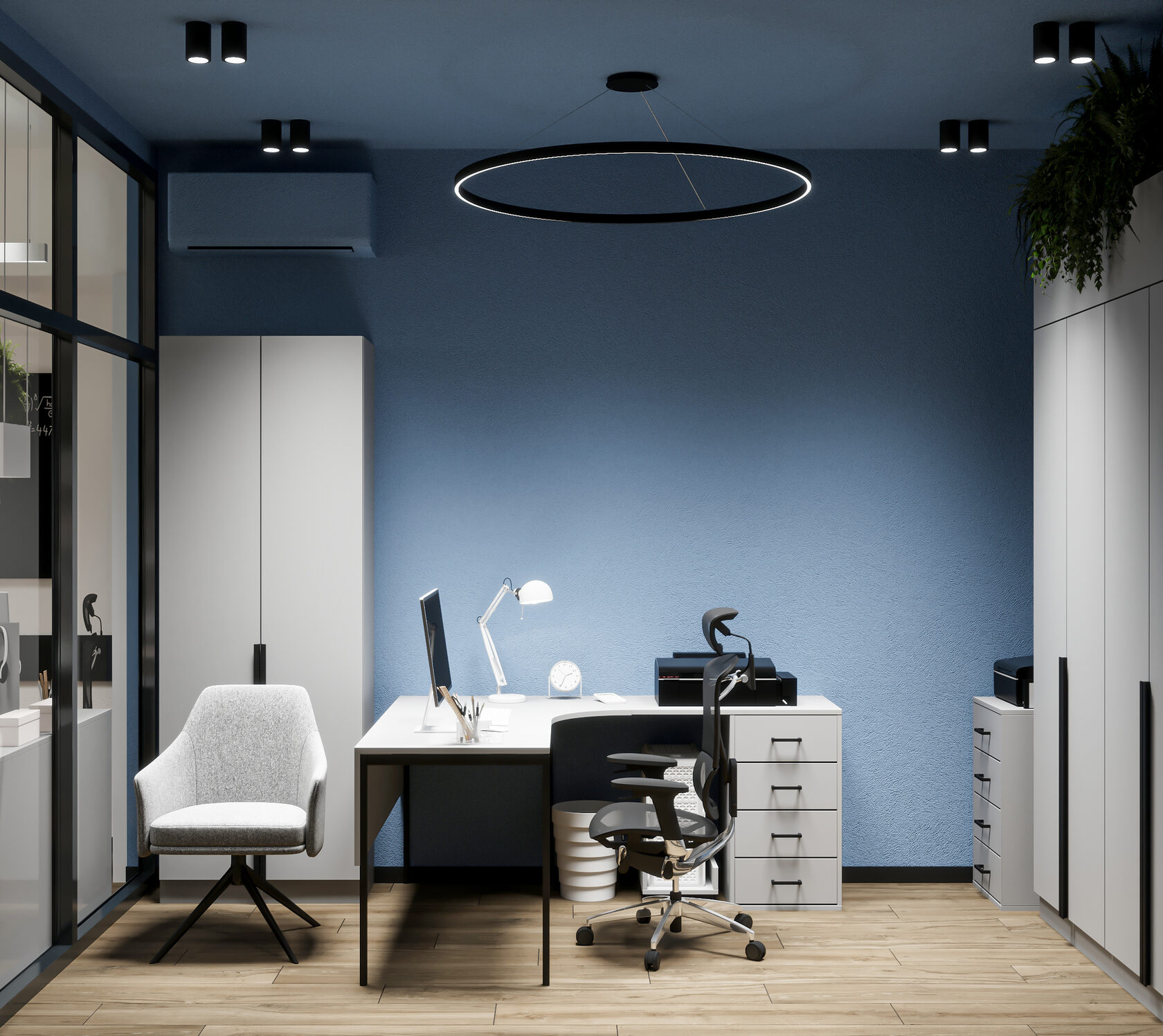 Цветовая гамма: доминирующий холодный оттенок синего создает фокусирующее пространство, пробуждая креативность и добавляя ощущение свободы. Этот цвет органично сочетается с холодным блеском металла, который используется в каркасах мебели, светильниках и декоративных элементах.