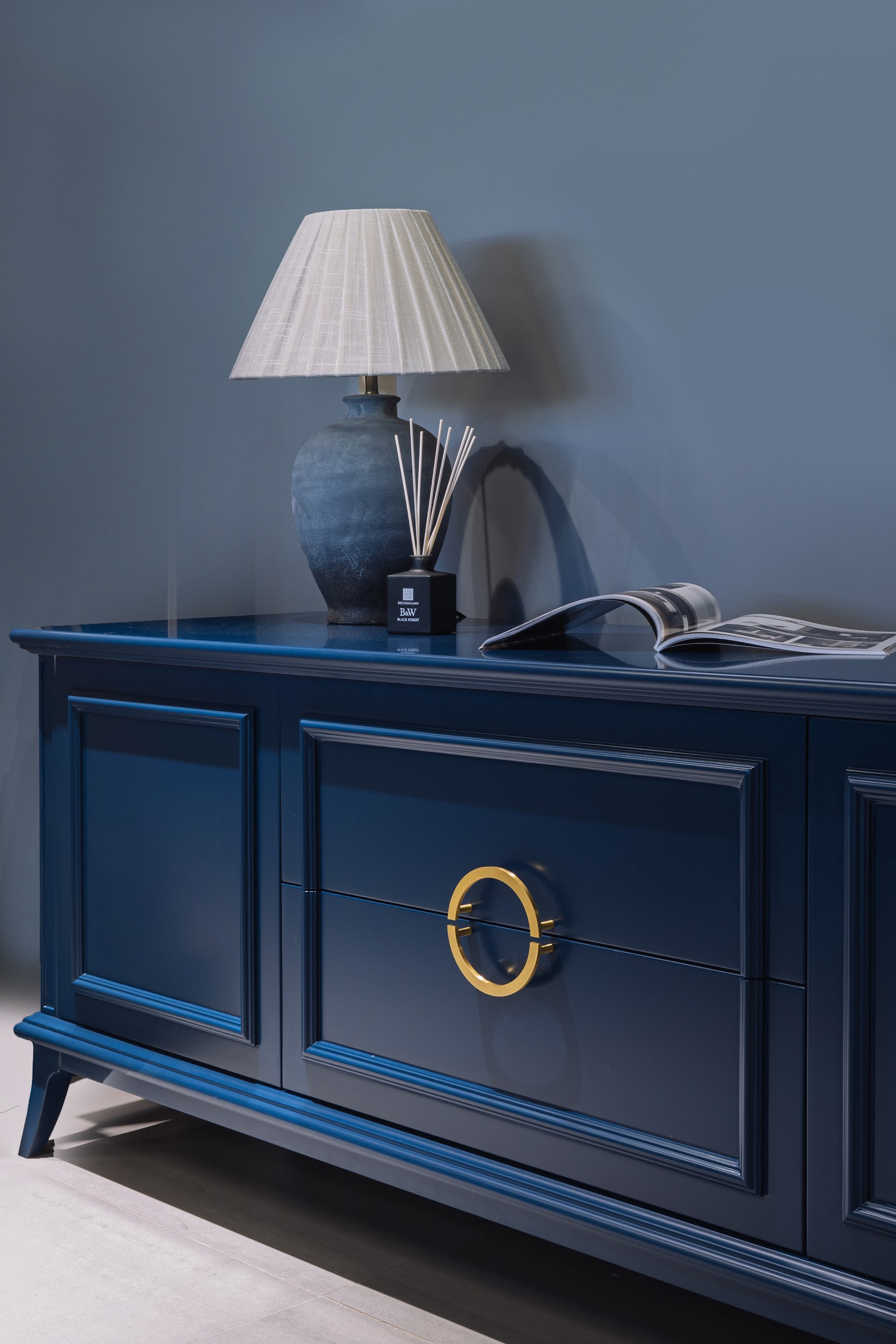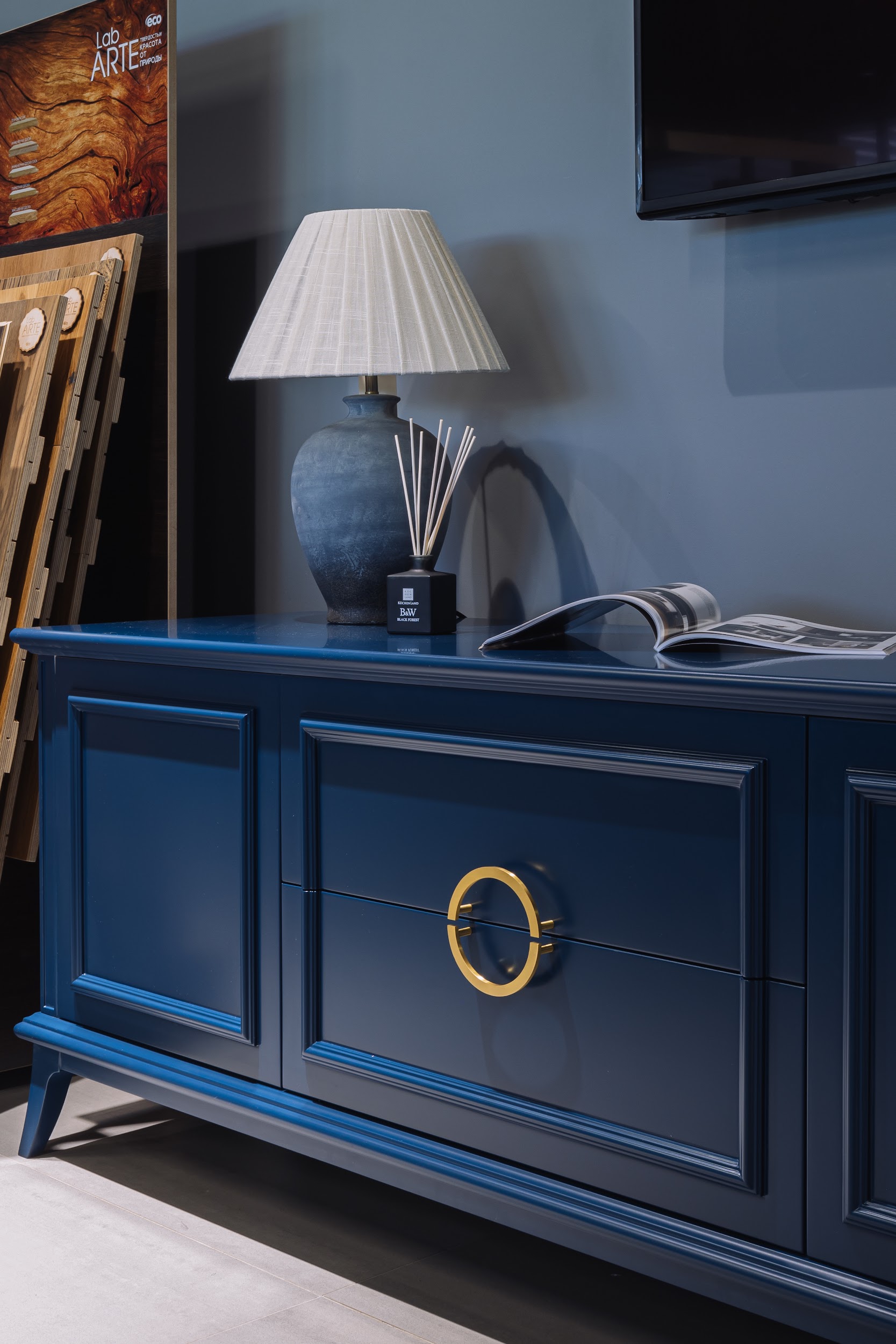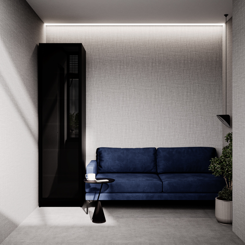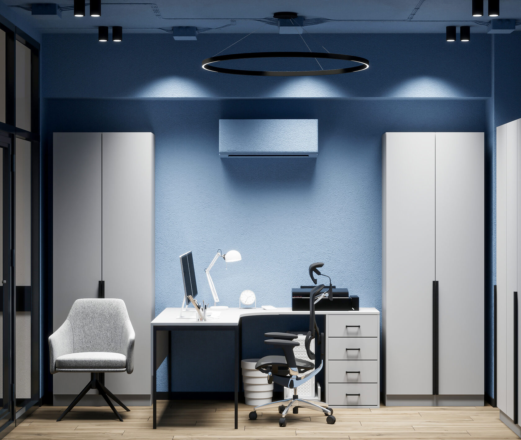 Цветовая гамма: доминирующий холодный оттенок синего создает фокусирующее пространство, пробуждая креативность и добавляя ощущение свободы. Этот цвет органично сочетается с холодным блеском металла, который используется в каркасах мебели, светильниках и декоративных элементах.