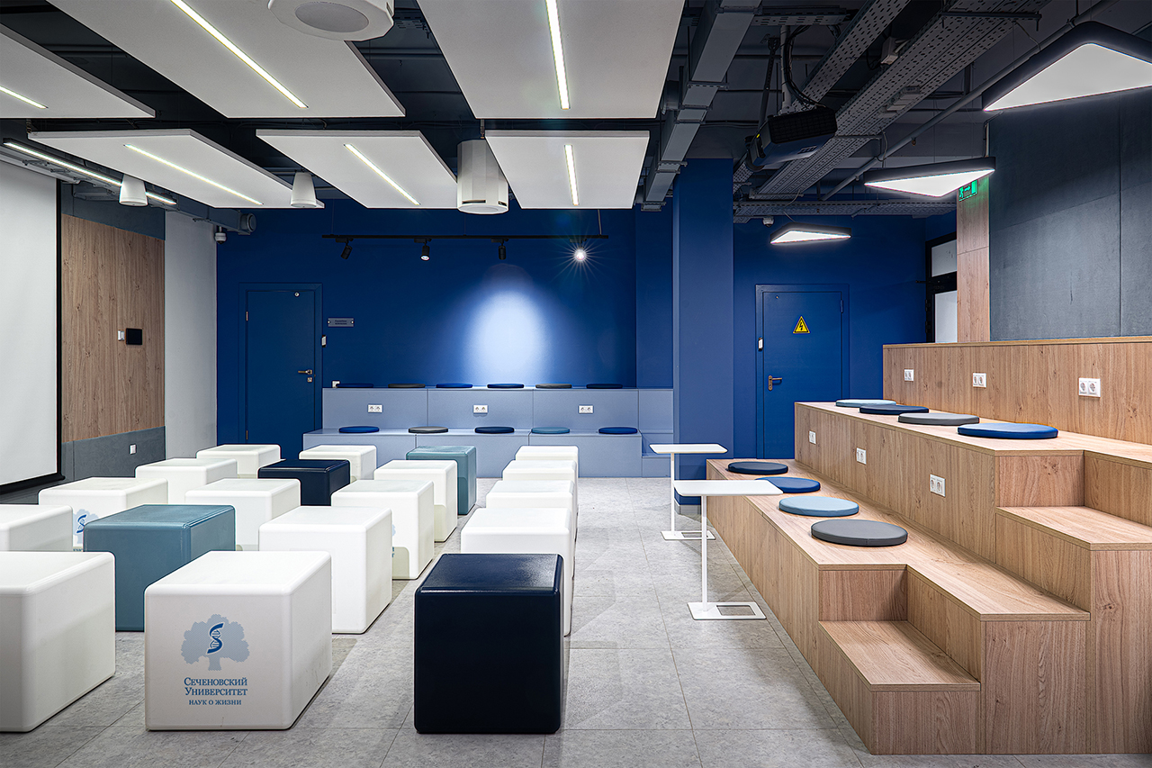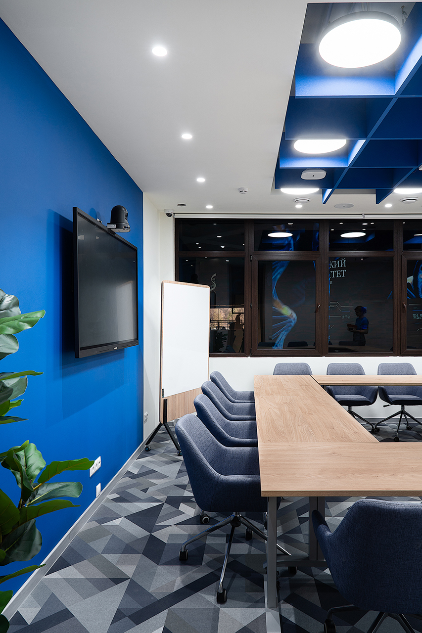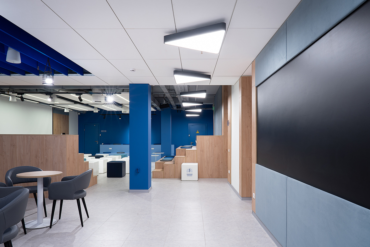 Концепция: гармония стиля и функциональности Авторы проекта вдохновлялись идеей создания пространства, которое бы не только отвечало потребностям студентов, но и вдохновляло их на творчество и самореализацию. Основной акцент был сделан на использовании синего цвета, металла, стекла и дерева, что позволило создать динамичный и стильный интерьер даже при ограниченном бюджете.