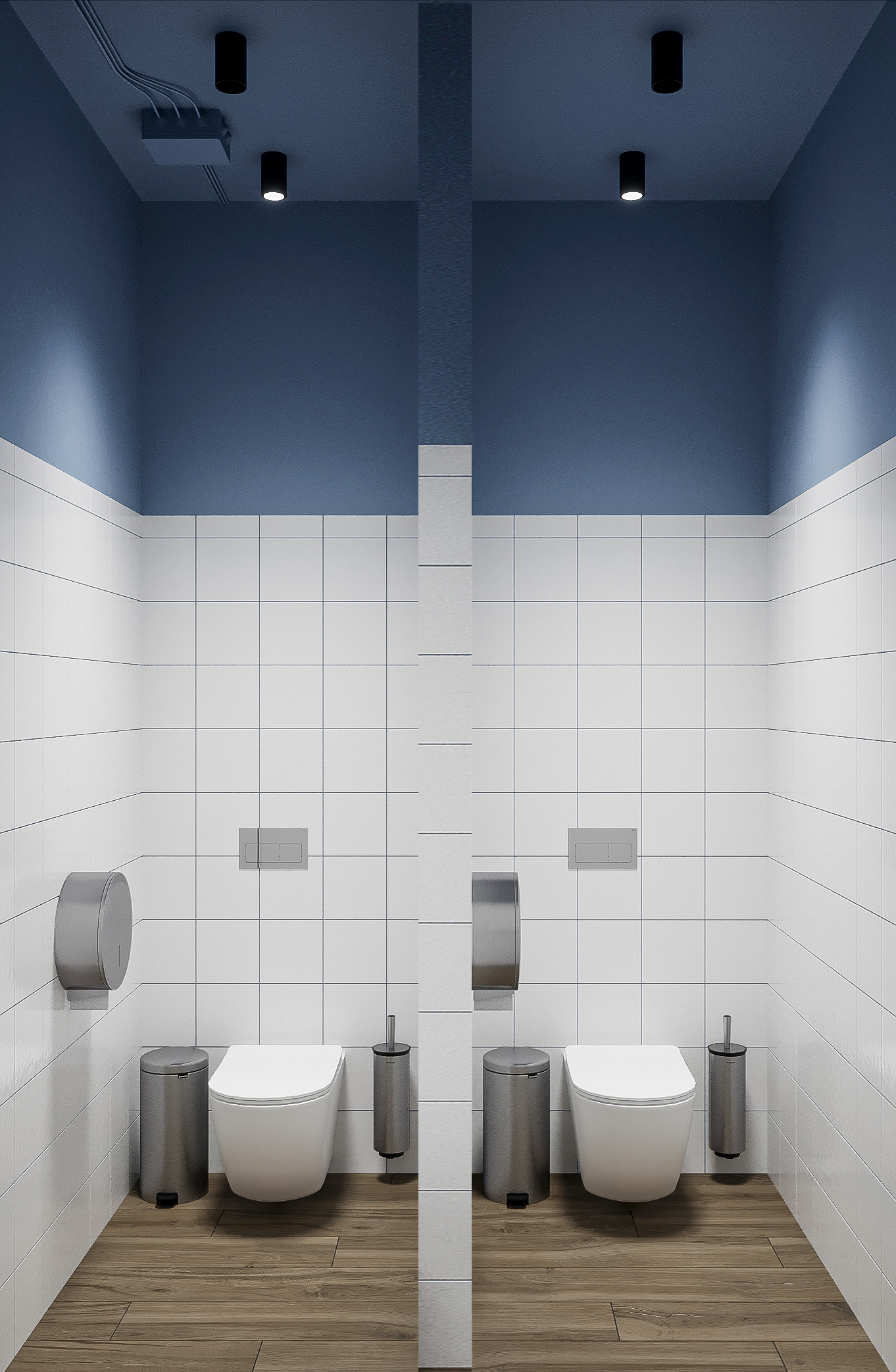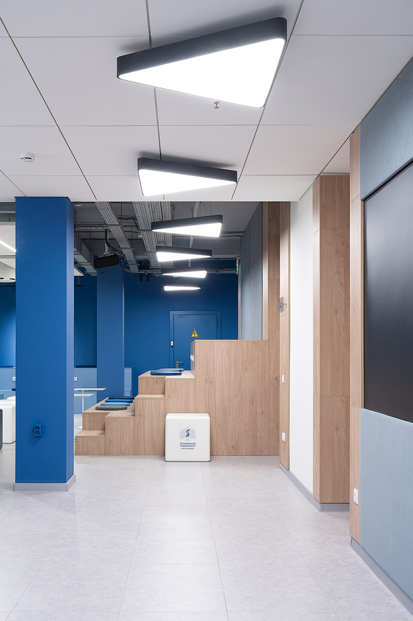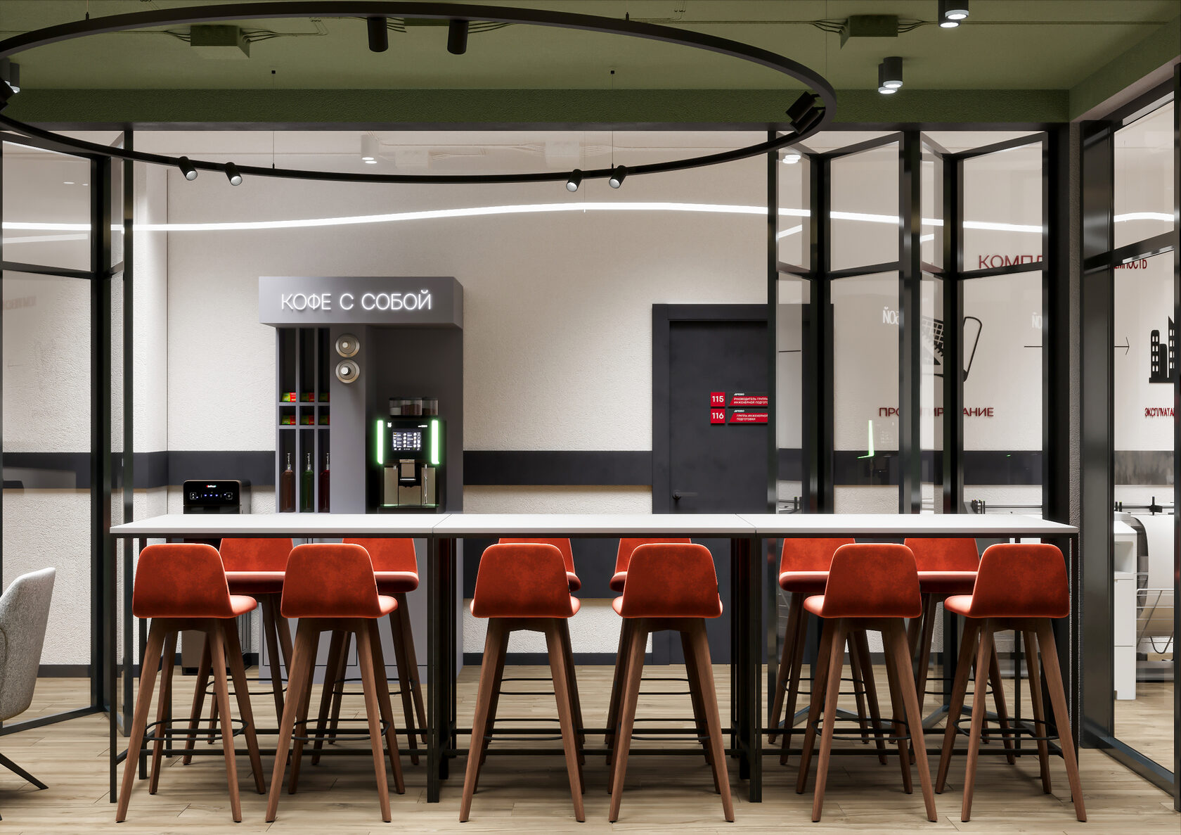 Концепция: гармония стиля и функциональности Авторы проекта вдохновлялись идеей создания пространства, которое бы не только отвечало потребностям студентов, но и вдохновляло их на творчество и самореализацию. Основной акцент был сделан на использовании синего цвета, металла, стекла и дерева, что позволило создать динамичный и стильный интерьер даже при ограниченном бюджете.