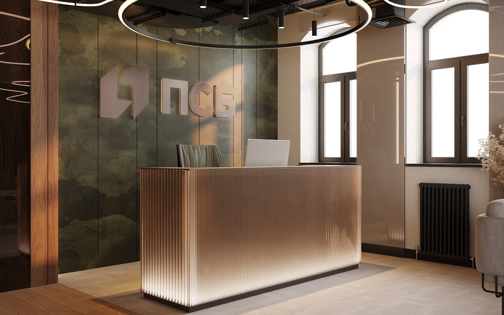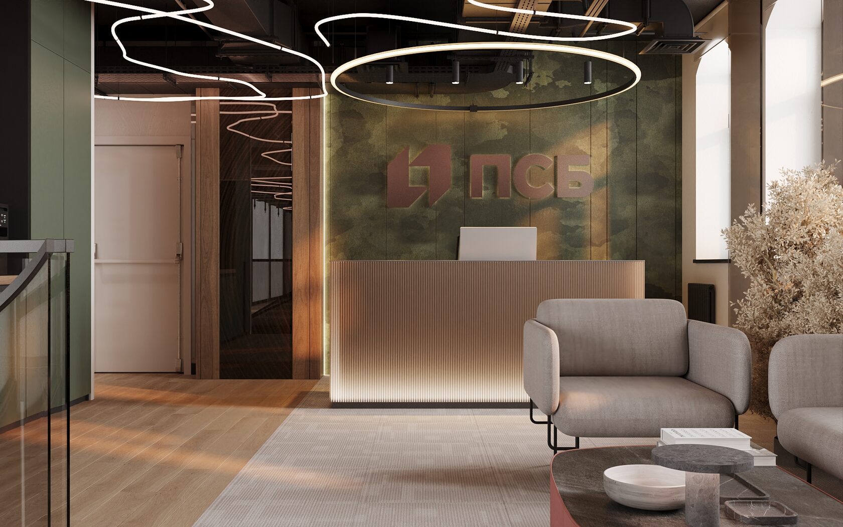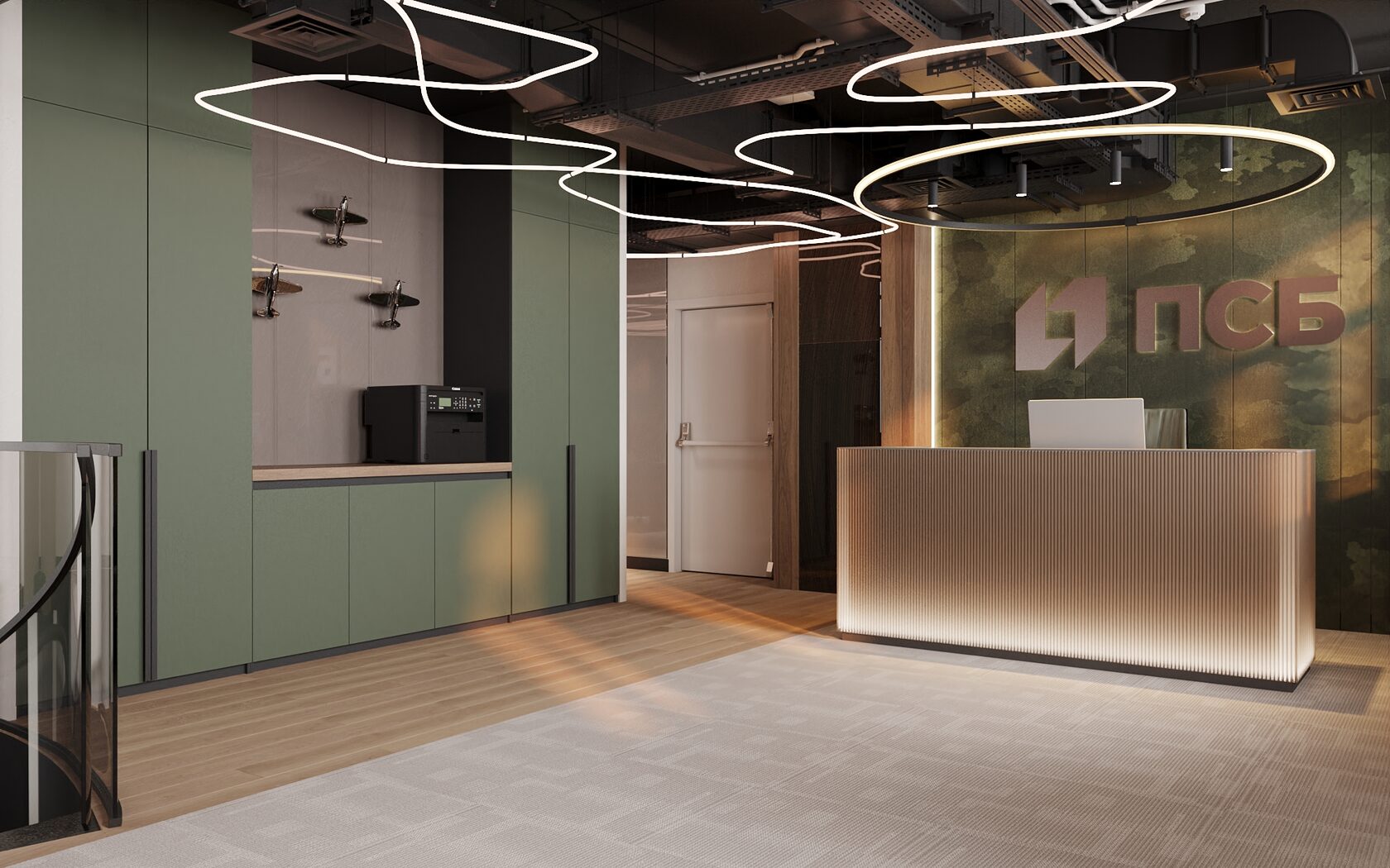 Концепция: Интерьер построен на сложной цветовой гамме, вдохновлённой милитари-эстетикой: глубокие оттенки зелёного, графитового и бронзы формируют атмосферу стабильности и доверия. Ключевым акцентом стала архитектурная система освещения из гнутого светодиодного профиля. Она не только выполняет утилитарную функцию, но и задаёт динамичный геометричный ритм, подчеркивая технологичность пространства. Проект органично сочетает корпоративные стандарты ПСБ, требования к безопасности и эстетику современного дизайна.