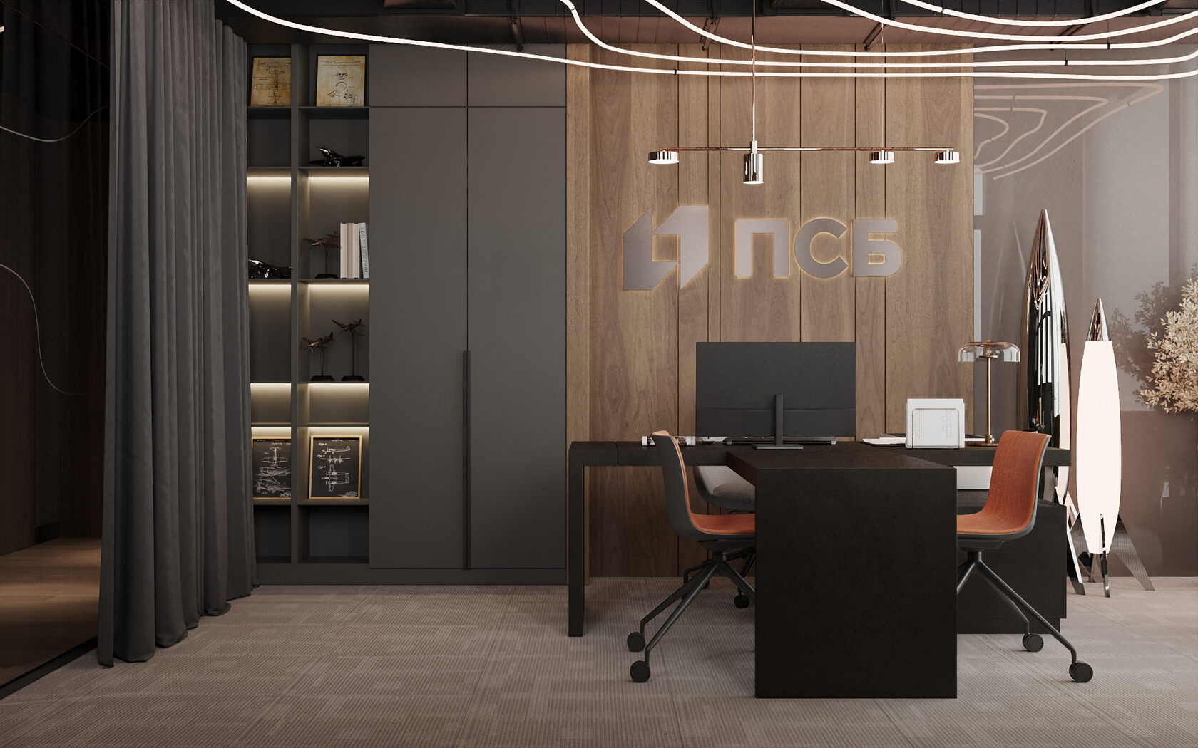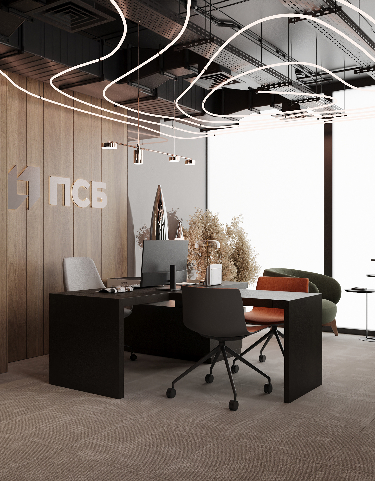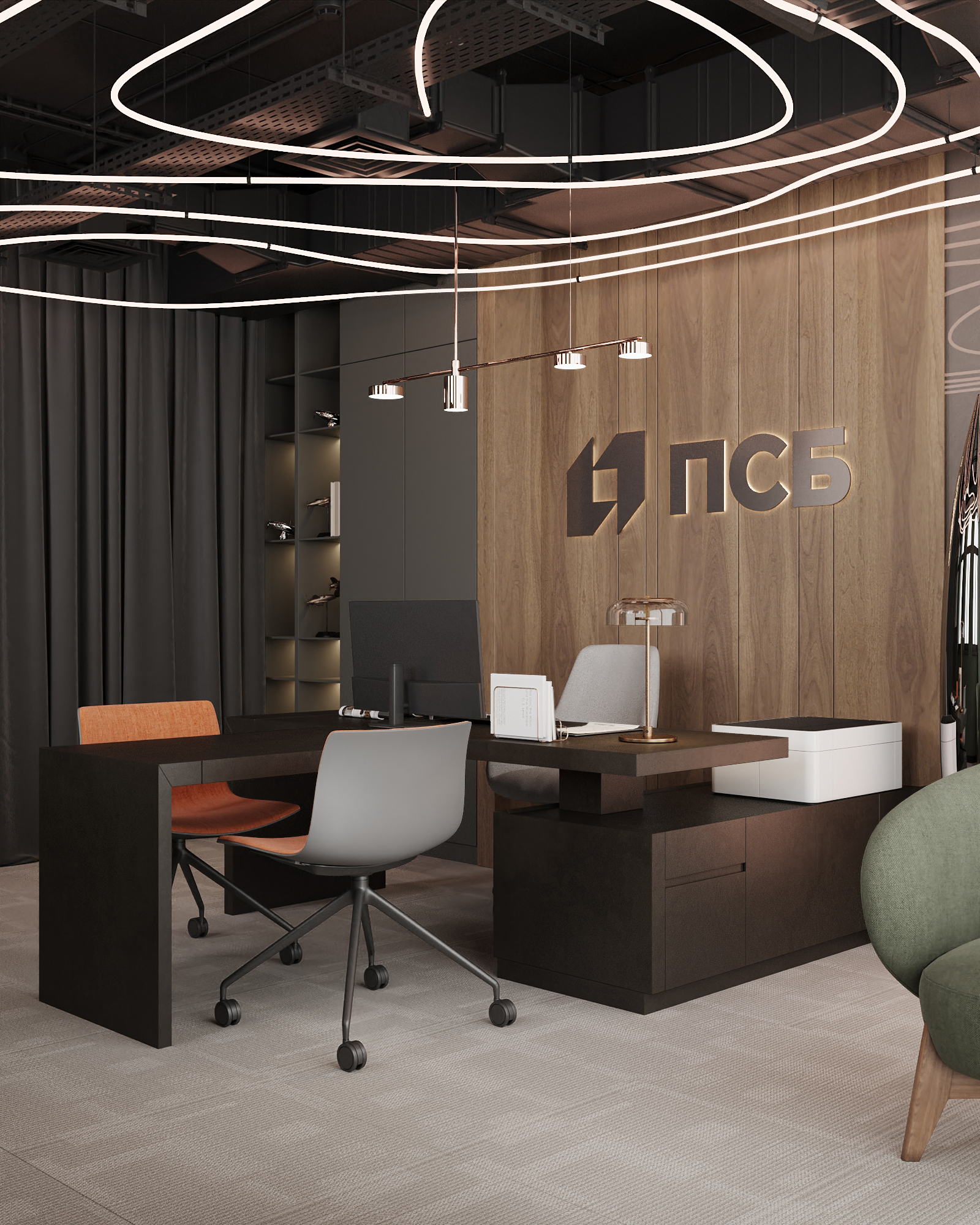 Концепция: Интерьер построен на сложной цветовой гамме, вдохновлённой милитари-эстетикой: глубокие оттенки зелёного, графитового и бронзы формируют атмосферу стабильности и доверия. Ключевым акцентом стала архитектурная система освещения из гнутого светодиодного профиля. Она не только выполняет утилитарную функцию, но и задаёт динамичный геометричный ритм, подчеркивая технологичность пространства. Проект органично сочетает корпоративные стандарты ПСБ, требования к безопасности и эстетику современного дизайна.