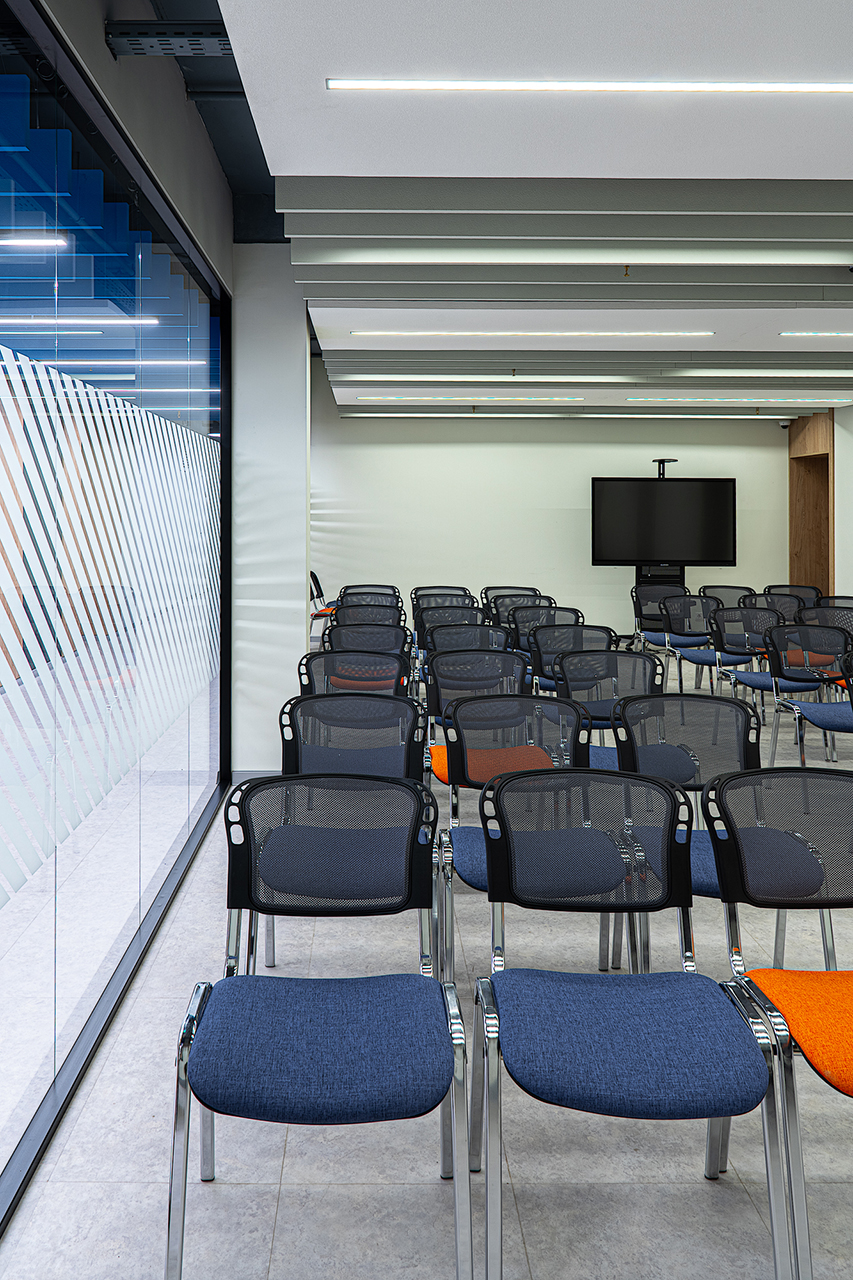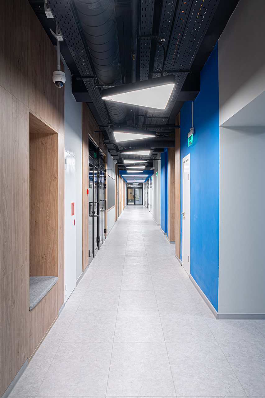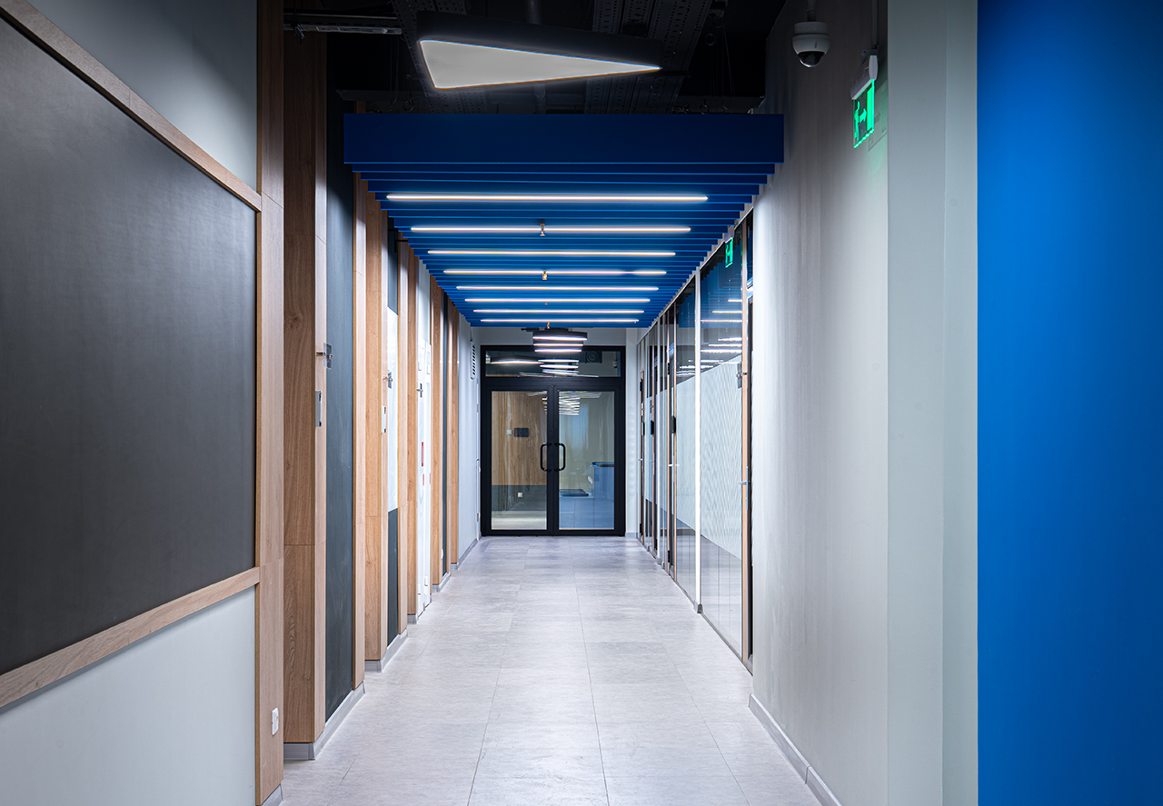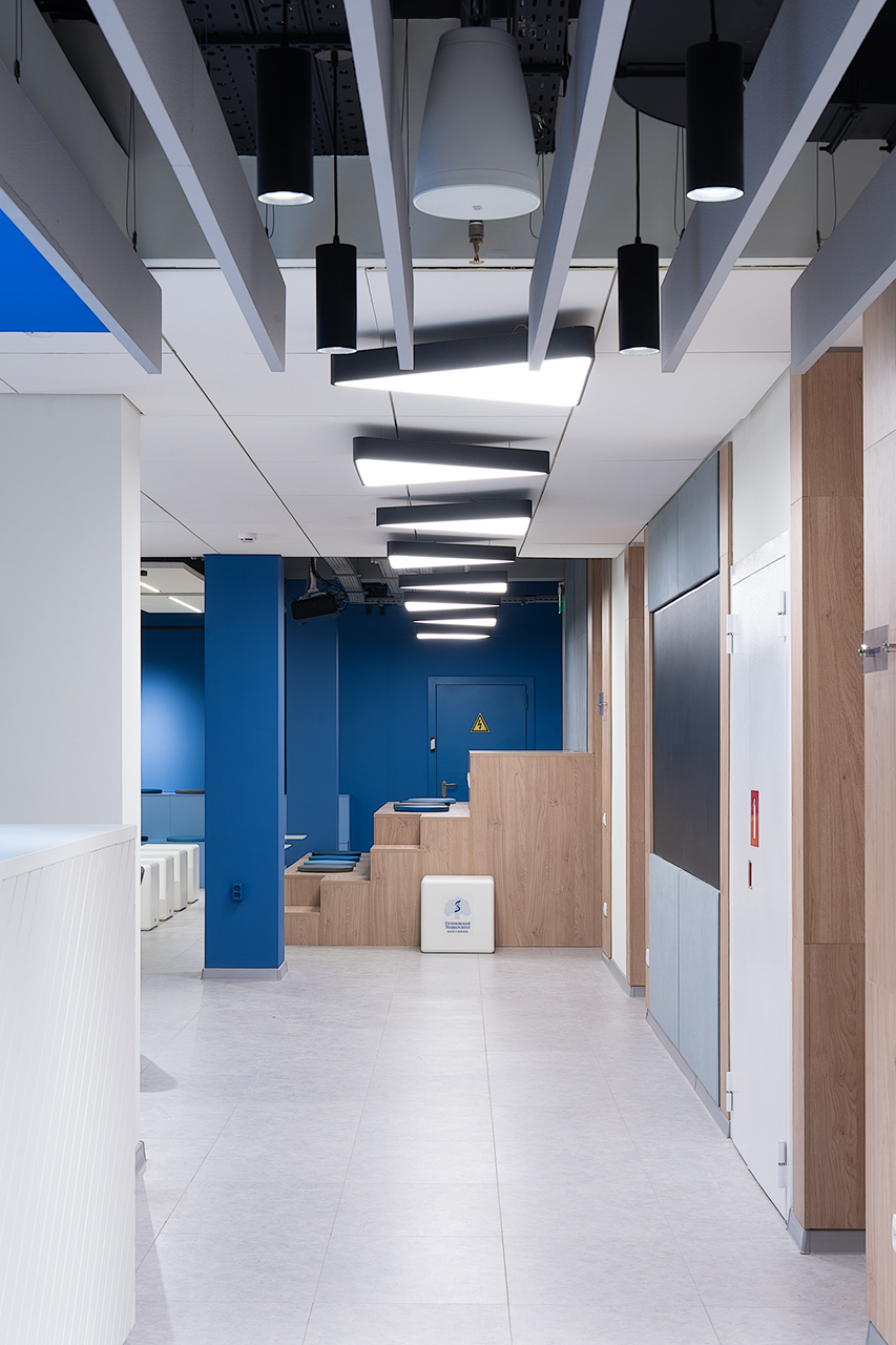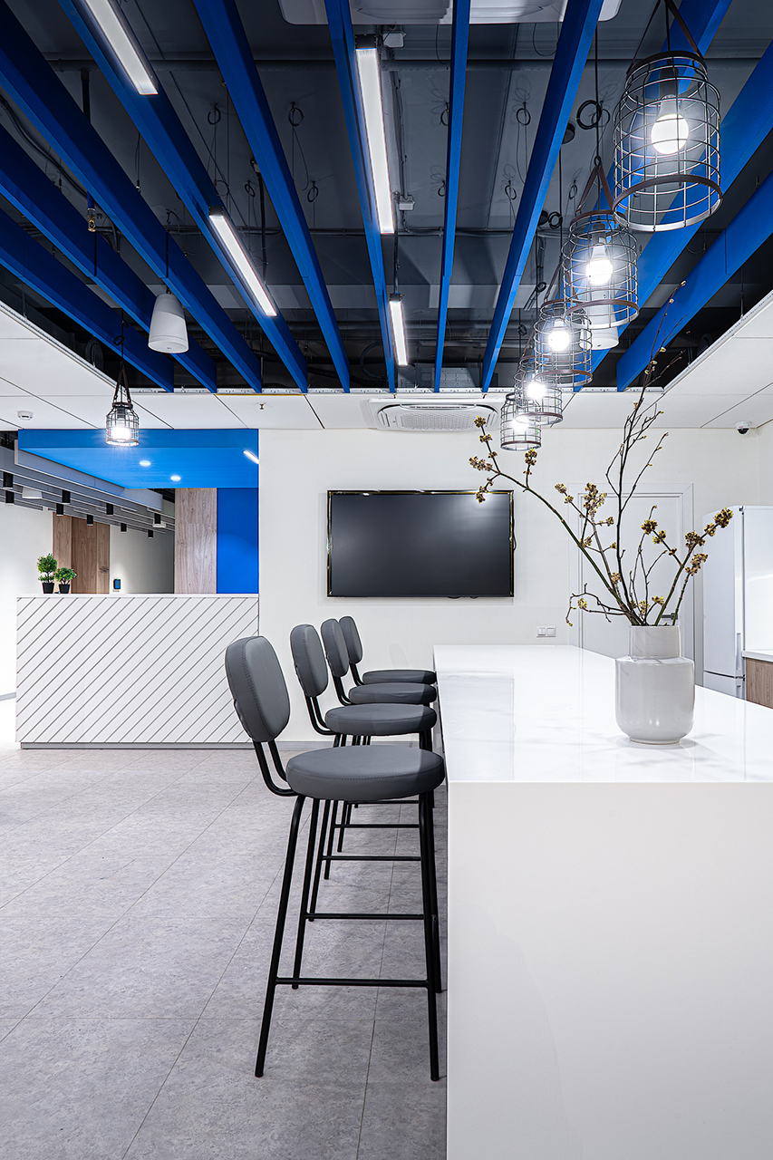 Помещение площадью более 350 м² в БЦ «Савеловский Сити» имело только базовую планировку и низкие потолки, что стало единственным ограничением. Однако дизайнеры обыграли это с помощью открытых коммуникаций, покрашенных в яркие оттенки красного и голубого — они не только замаскировали недостаток, но и стали цветовым кодом интерьера, перекликаясь с деятельностью компании.