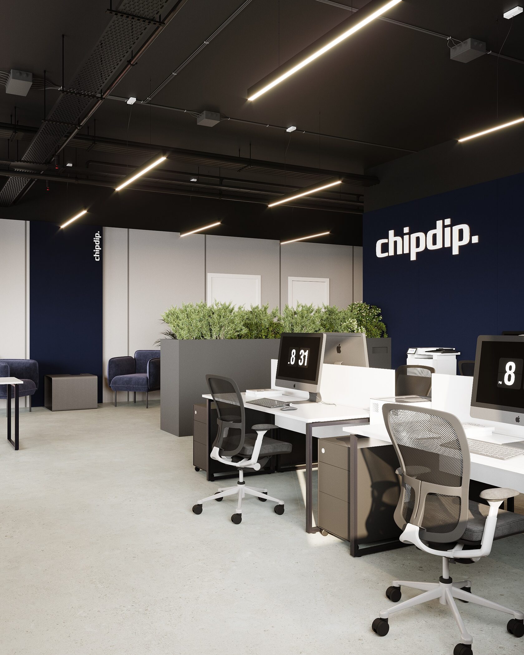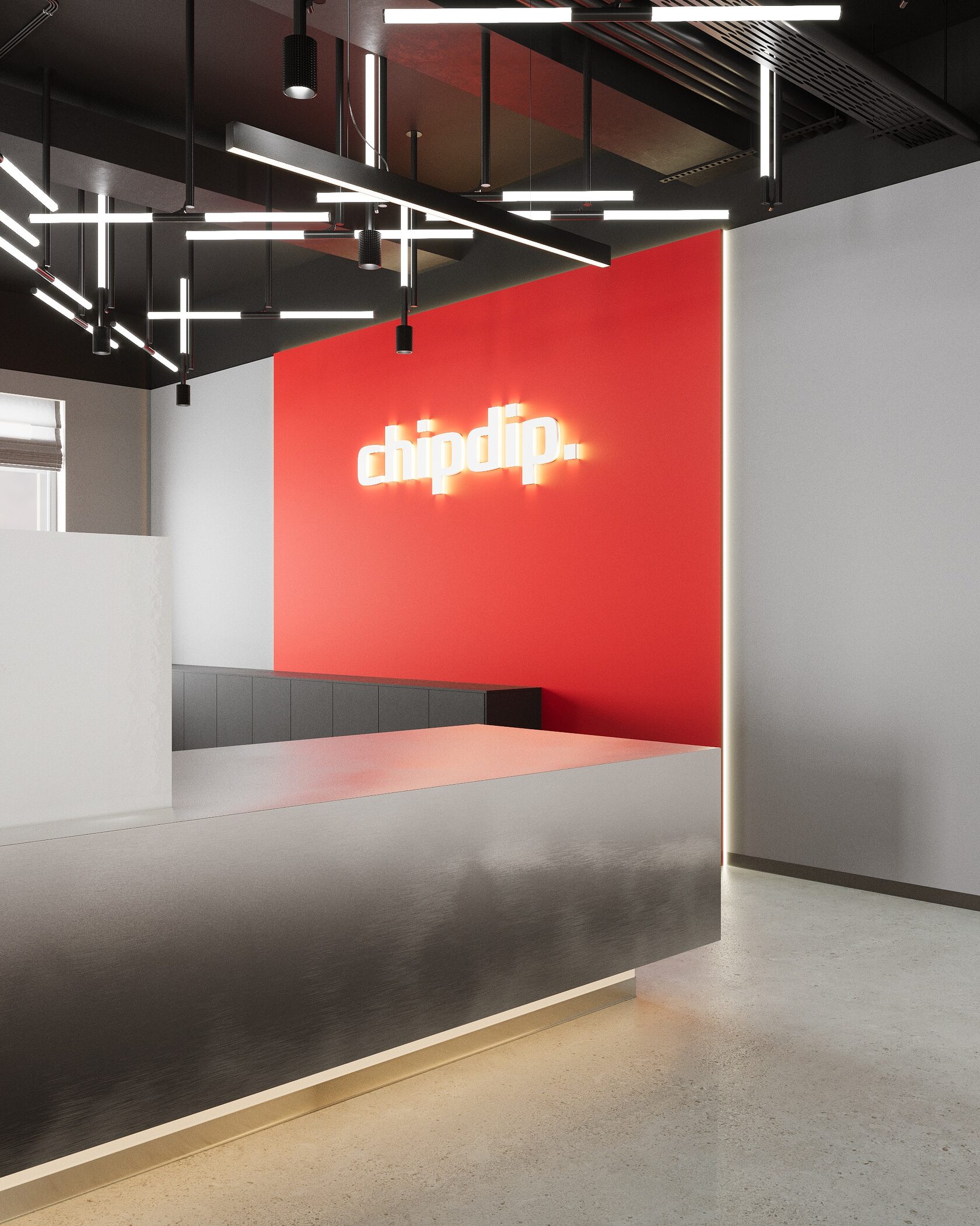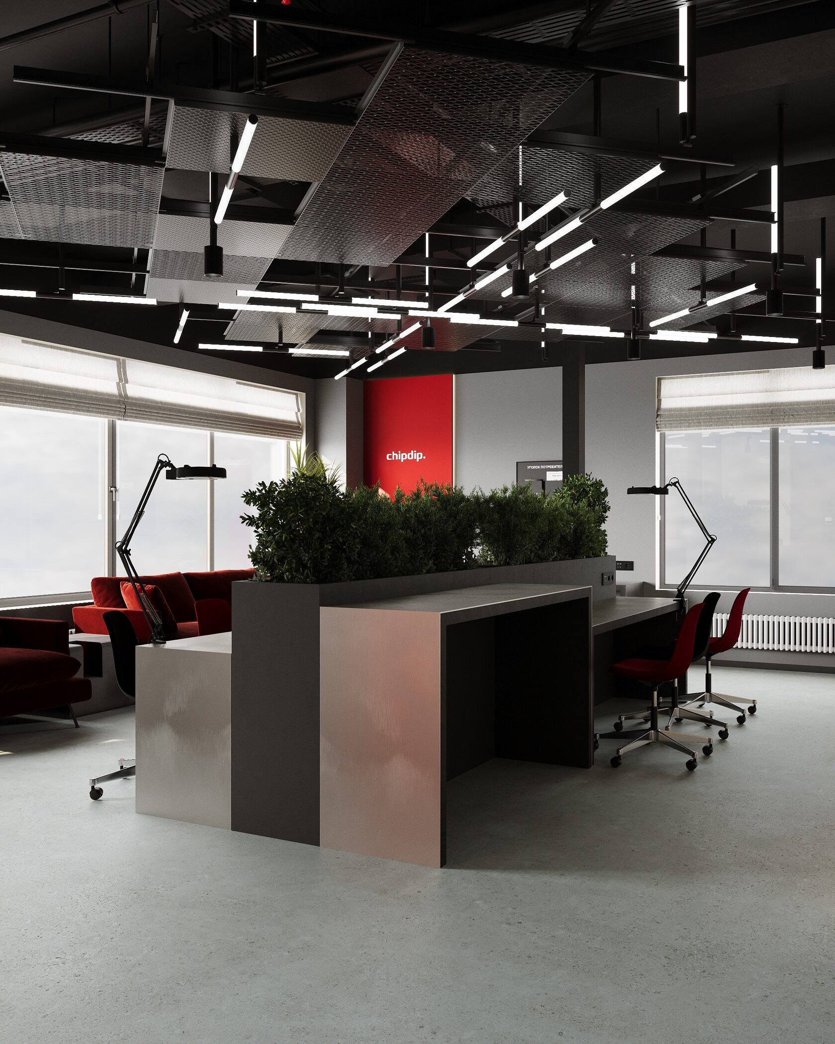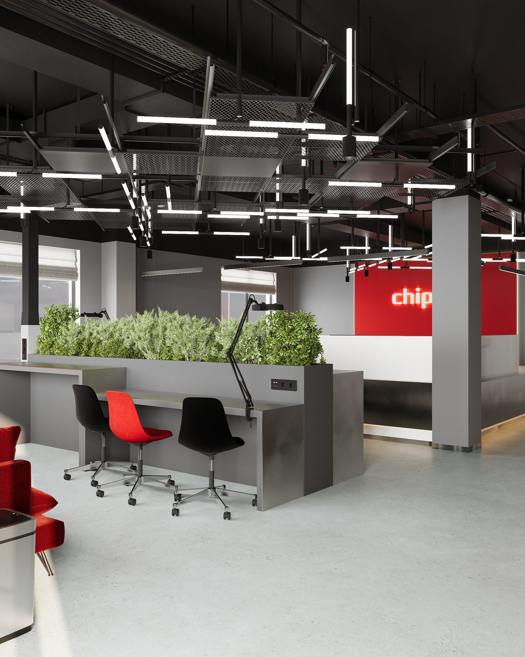 Помещение площадью более 350 м² в БЦ «Савеловский Сити» имело только базовую планировку и низкие потолки, что стало единственным ограничением. Однако дизайнеры обыграли это с помощью открытых коммуникаций, покрашенных в яркие оттенки красного и голубого — они не только замаскировали недостаток, но и стали цветовым кодом интерьера, перекликаясь с деятельностью компании.