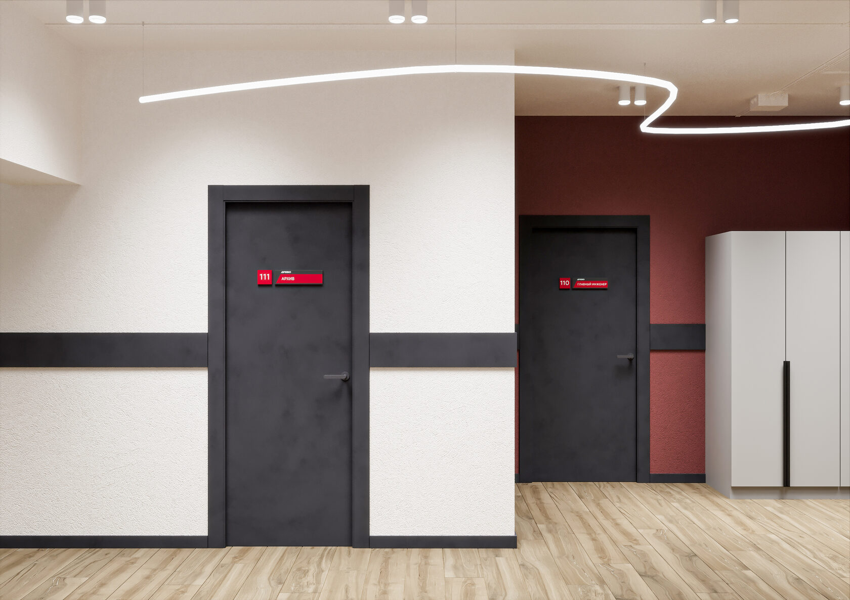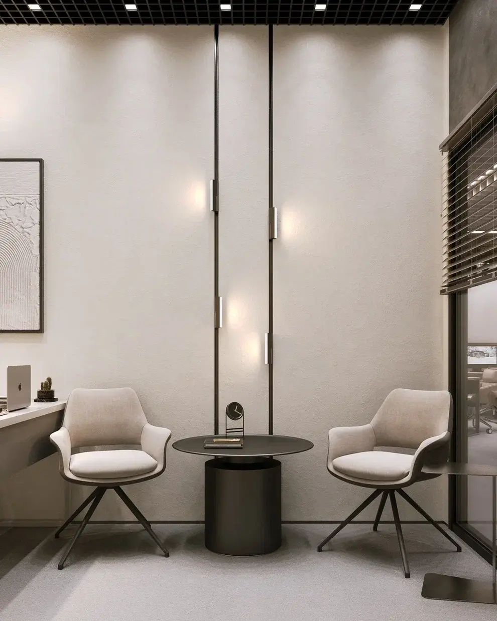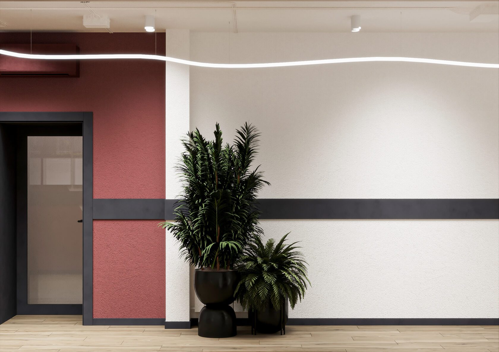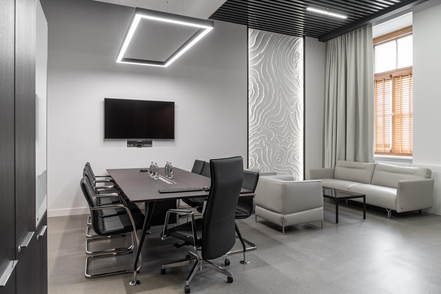 Особое внимание уделили переговорам и входной зоне: интегрированные ниши, арт-объекты и контрастные материалы — от декоративной штукатурки под бетон до мягких акустических панелей — формируют визуальный интерес и атмосферу, в которой комфортно и работать, и принимать гостей. Отдельно была проработана система освещения: она включает потолочные споты, точечные лампы, бра и даже встроенные в интерьер пожарные светильники — всё подчинено общей визуальной логике.