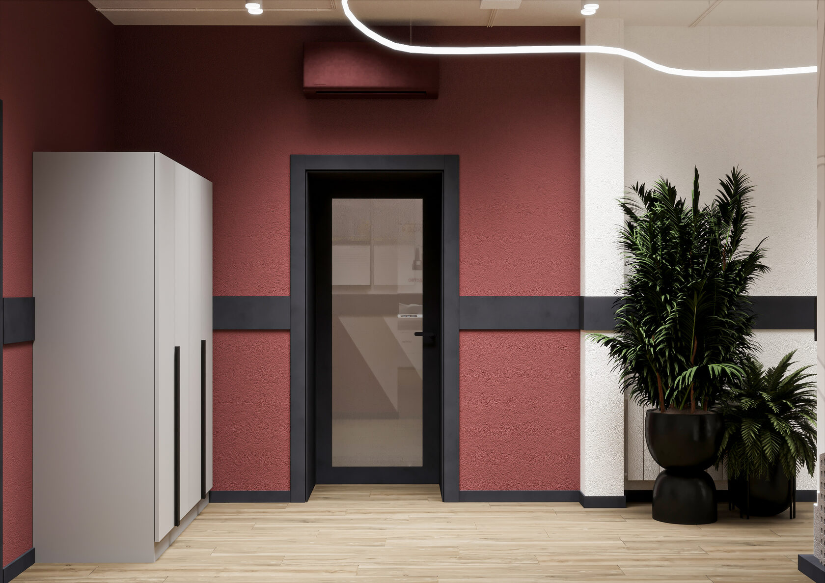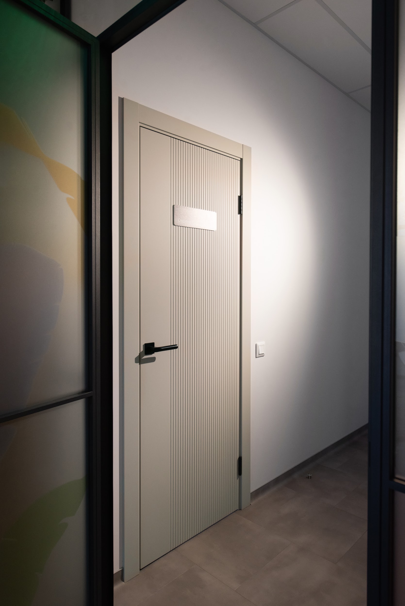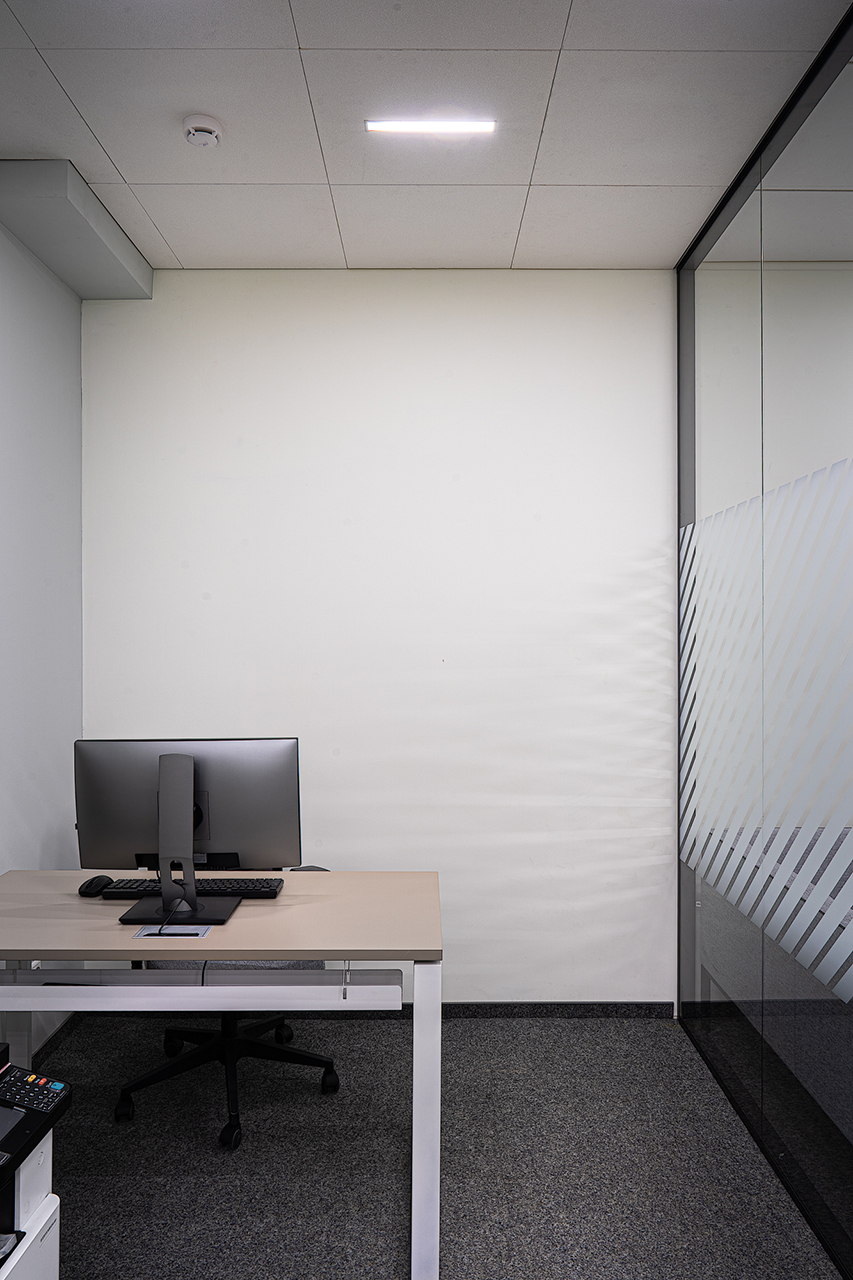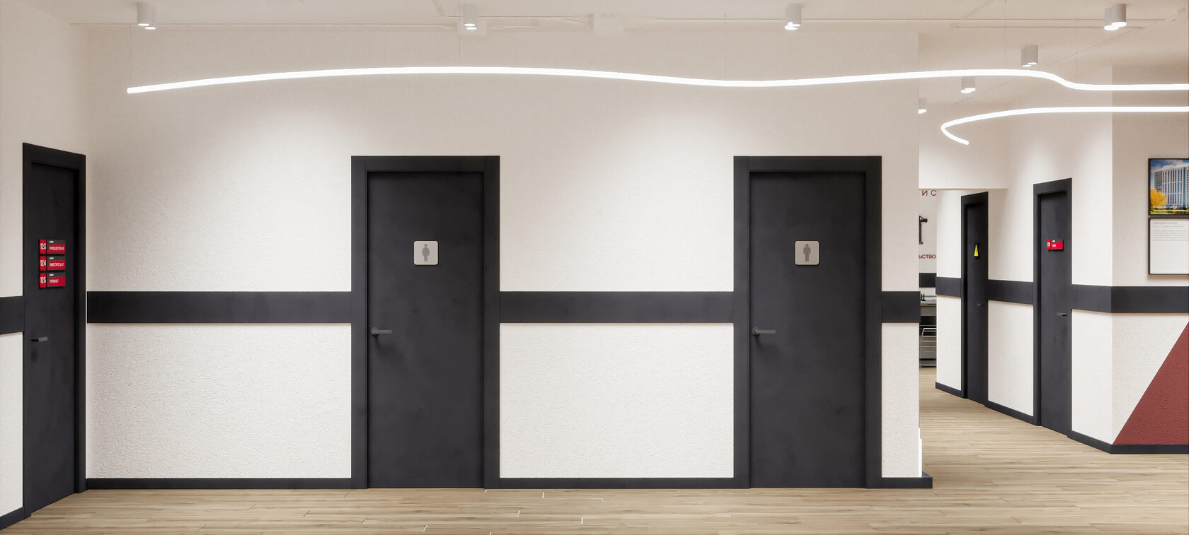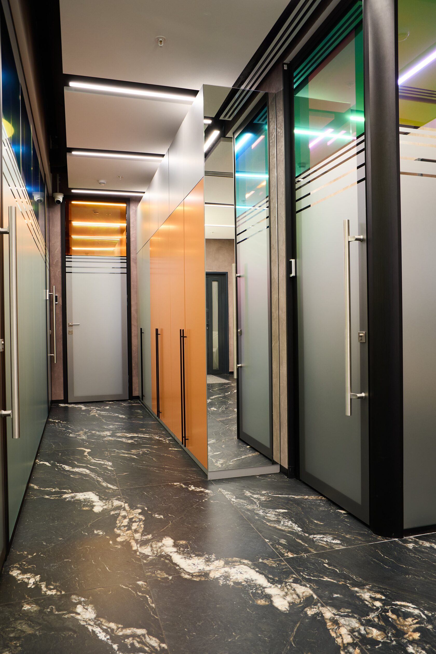 Особое внимание уделили переговорам и входной зоне: интегрированные ниши, арт-объекты и контрастные материалы — от декоративной штукатурки под бетон до мягких акустических панелей — формируют визуальный интерес и атмосферу, в которой комфортно и работать, и принимать гостей. Отдельно была проработана система освещения: она включает потолочные споты, точечные лампы, бра и даже встроенные в интерьер пожарные светильники — всё подчинено общей визуальной логике.
