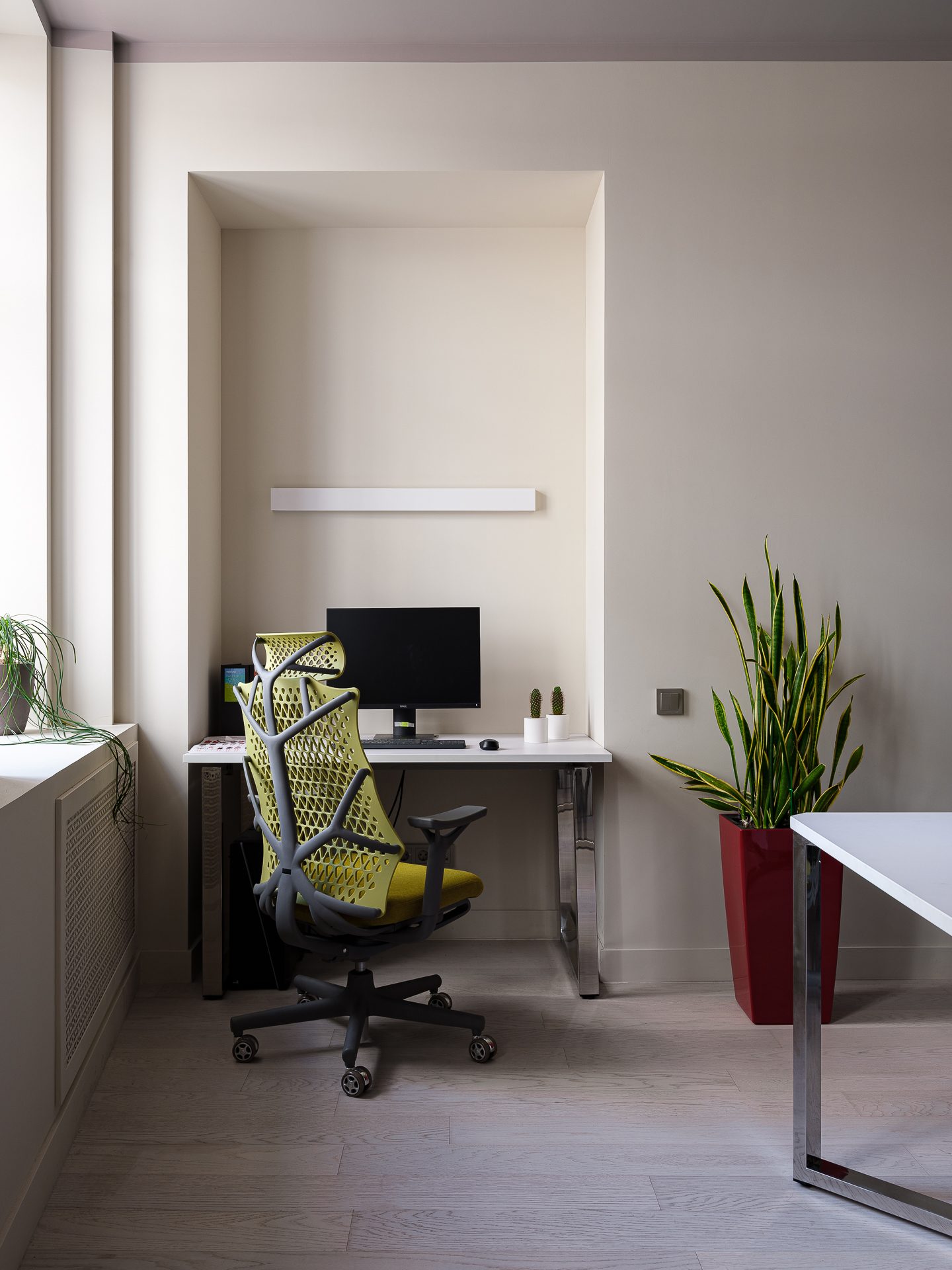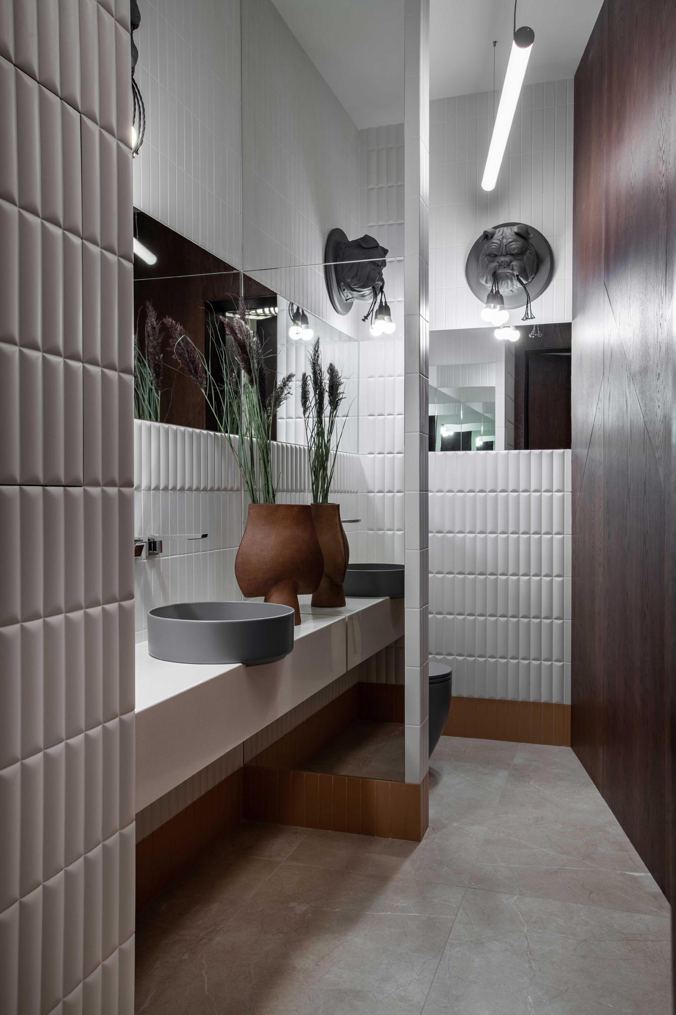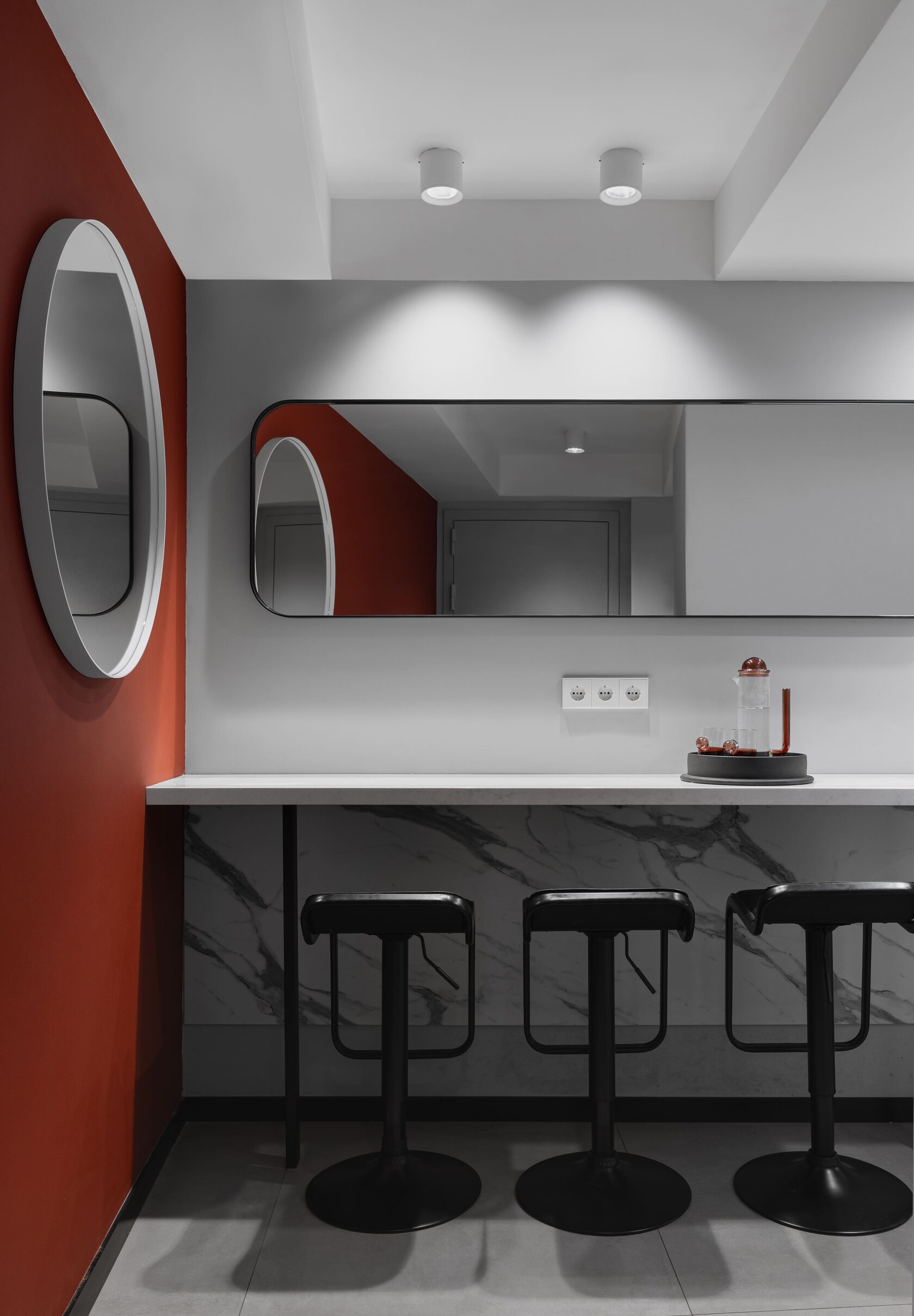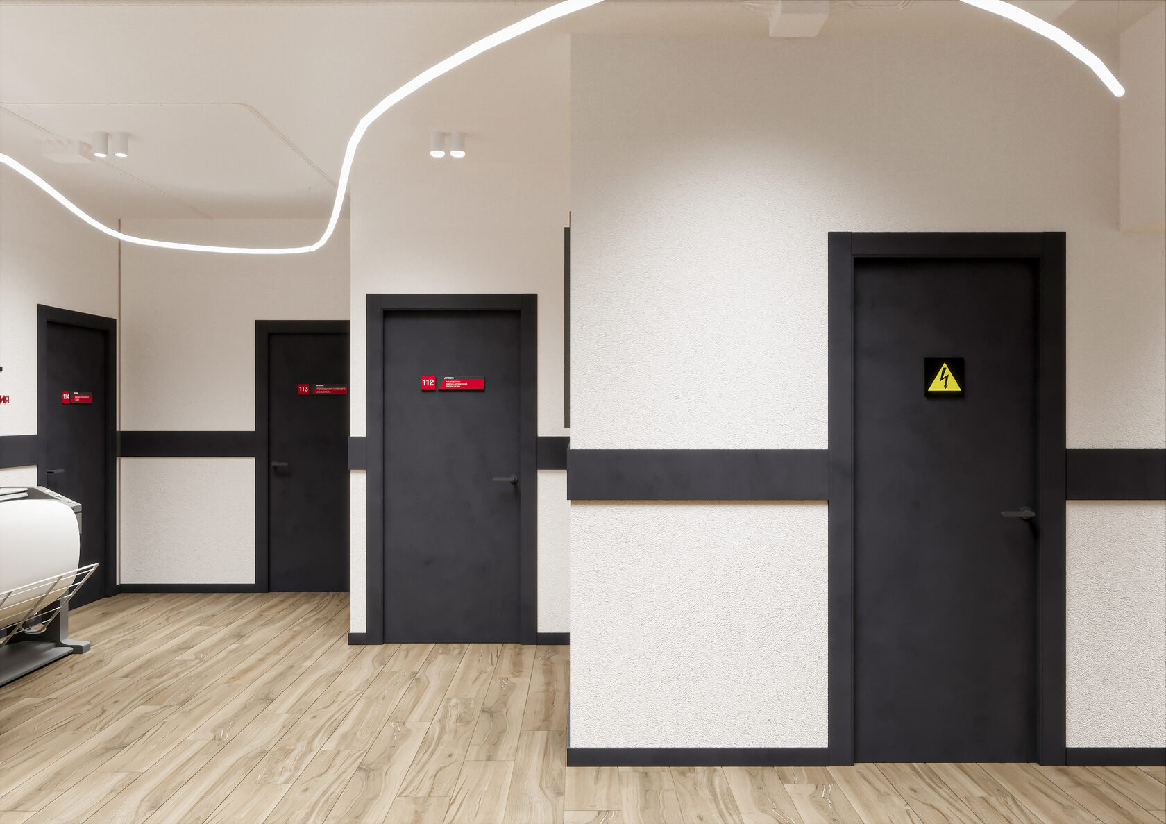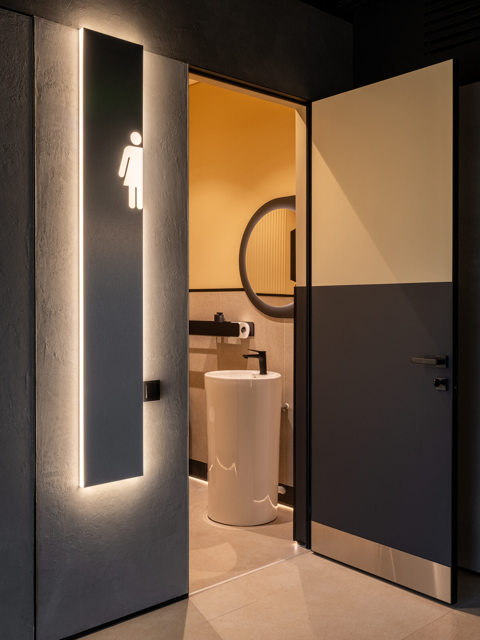 Особое внимание уделили переговорам и входной зоне: интегрированные ниши, арт-объекты и контрастные материалы — от декоративной штукатурки под бетон до мягких акустических панелей — формируют визуальный интерес и атмосферу, в которой комфортно и работать, и принимать гостей. Отдельно была проработана система освещения: она включает потолочные споты, точечные лампы, бра и даже встроенные в интерьер пожарные светильники — всё подчинено общей визуальной логике.