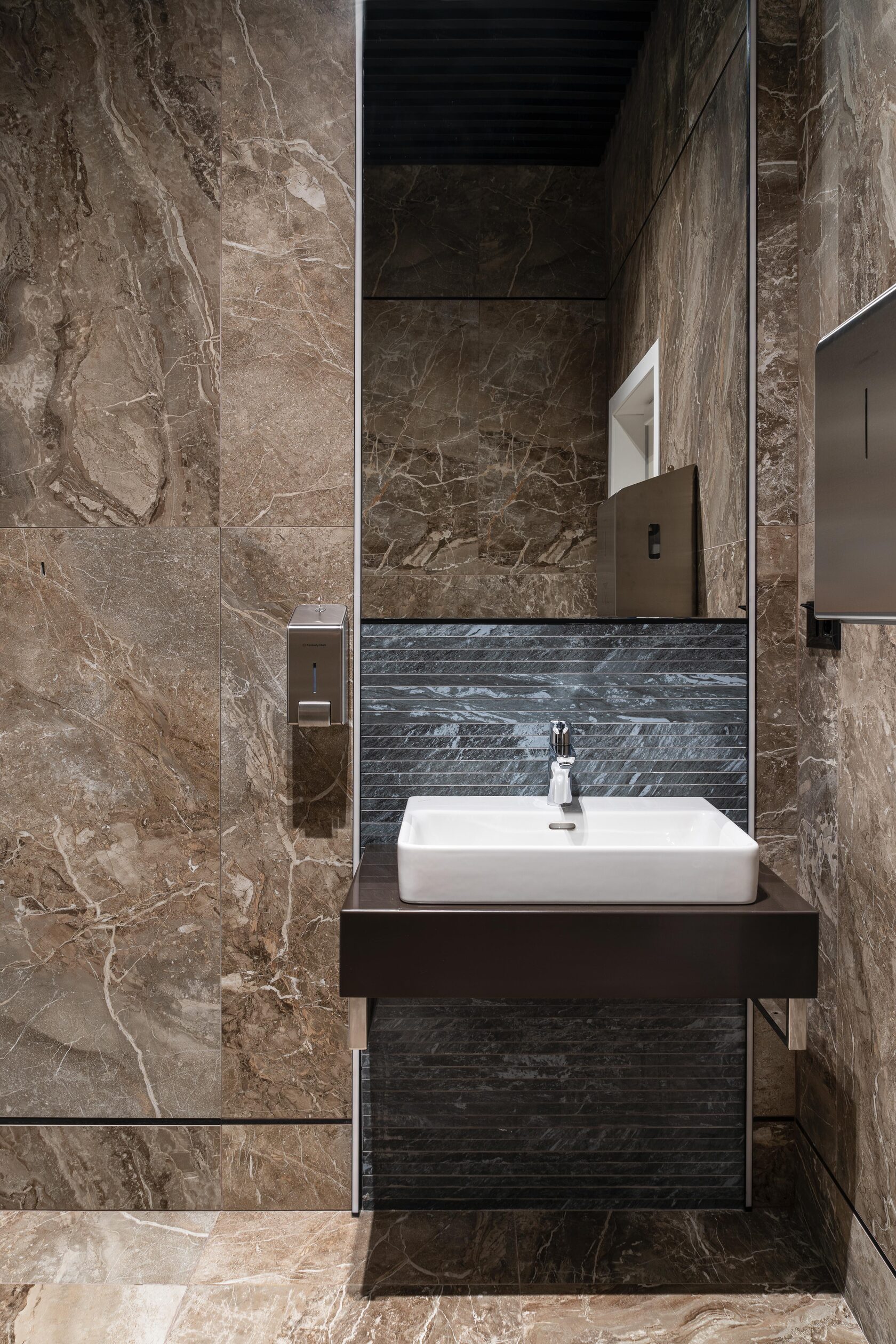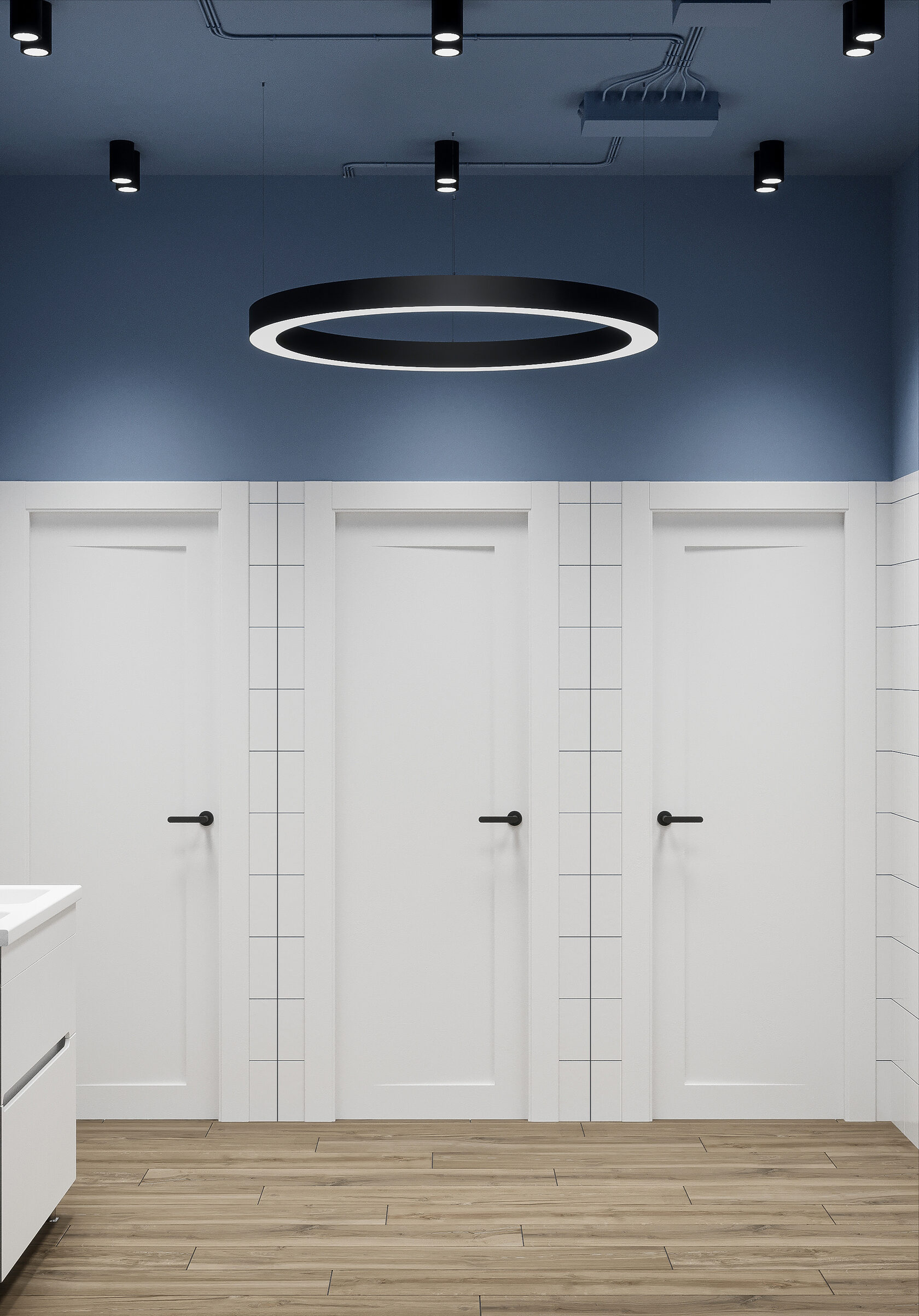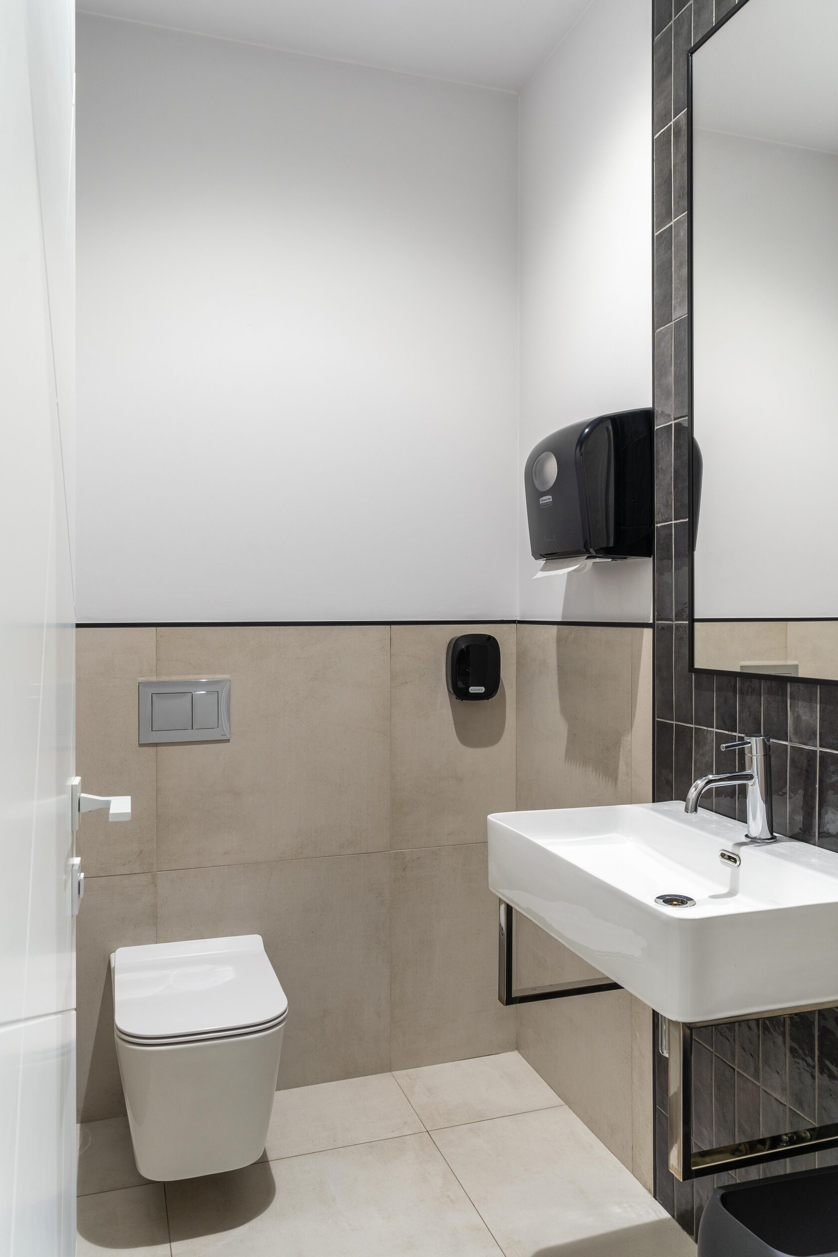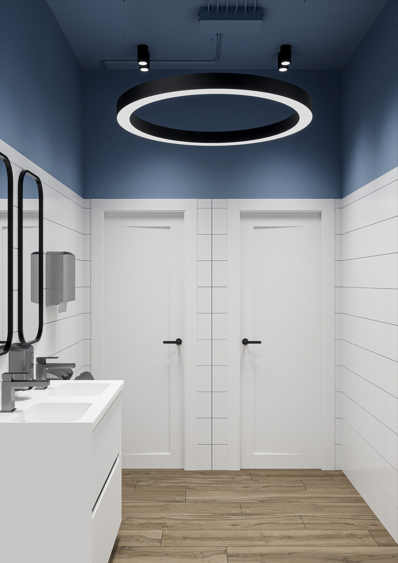 Особое внимание уделили переговорам и входной зоне: интегрированные ниши, арт-объекты и контрастные материалы — от декоративной штукатурки под бетон до мягких акустических панелей — формируют визуальный интерес и атмосферу, в которой комфортно и работать, и принимать гостей. Отдельно была проработана система освещения: она включает потолочные споты, точечные лампы, бра и даже встроенные в интерьер пожарные светильники — всё подчинено общей визуальной логике.