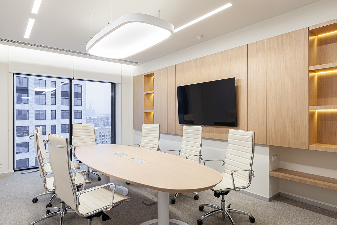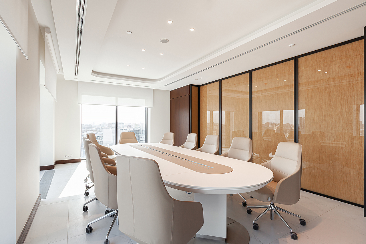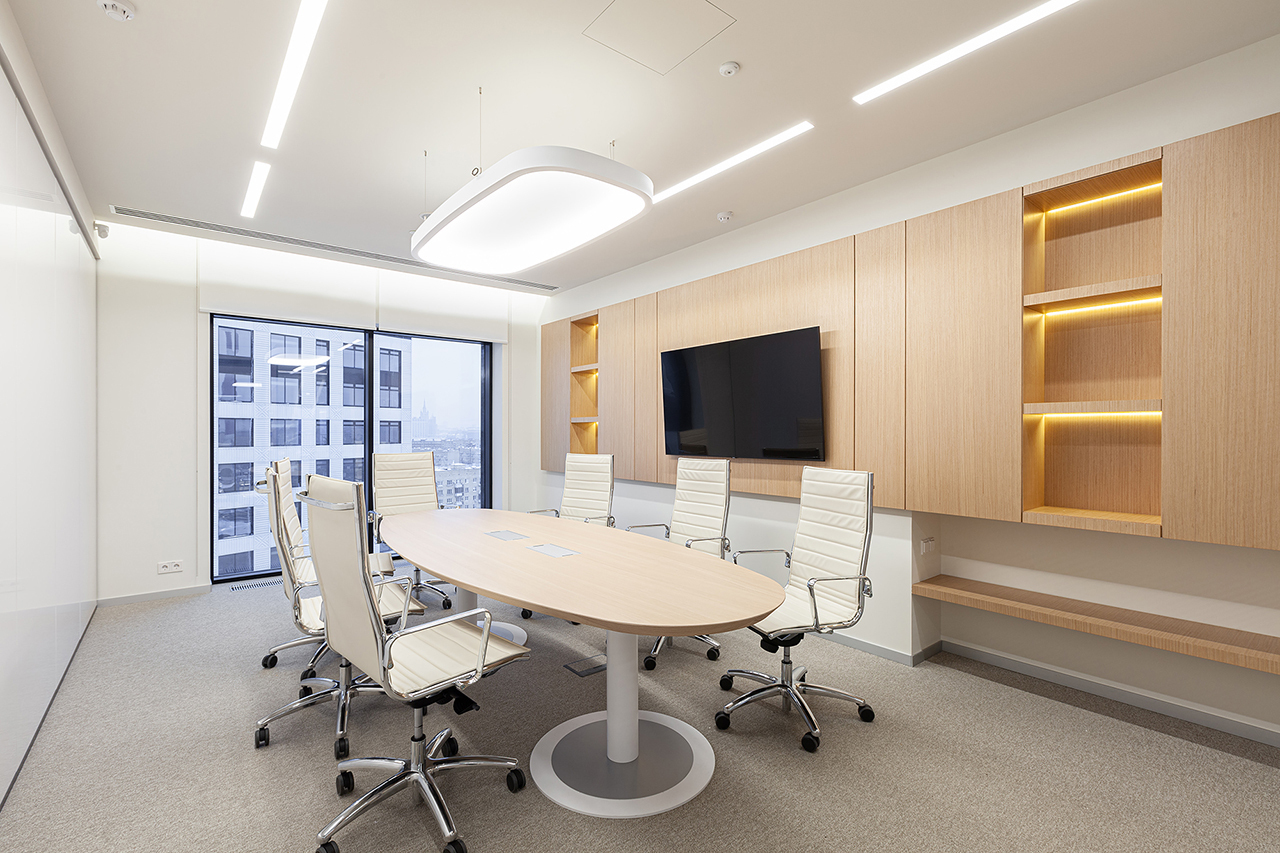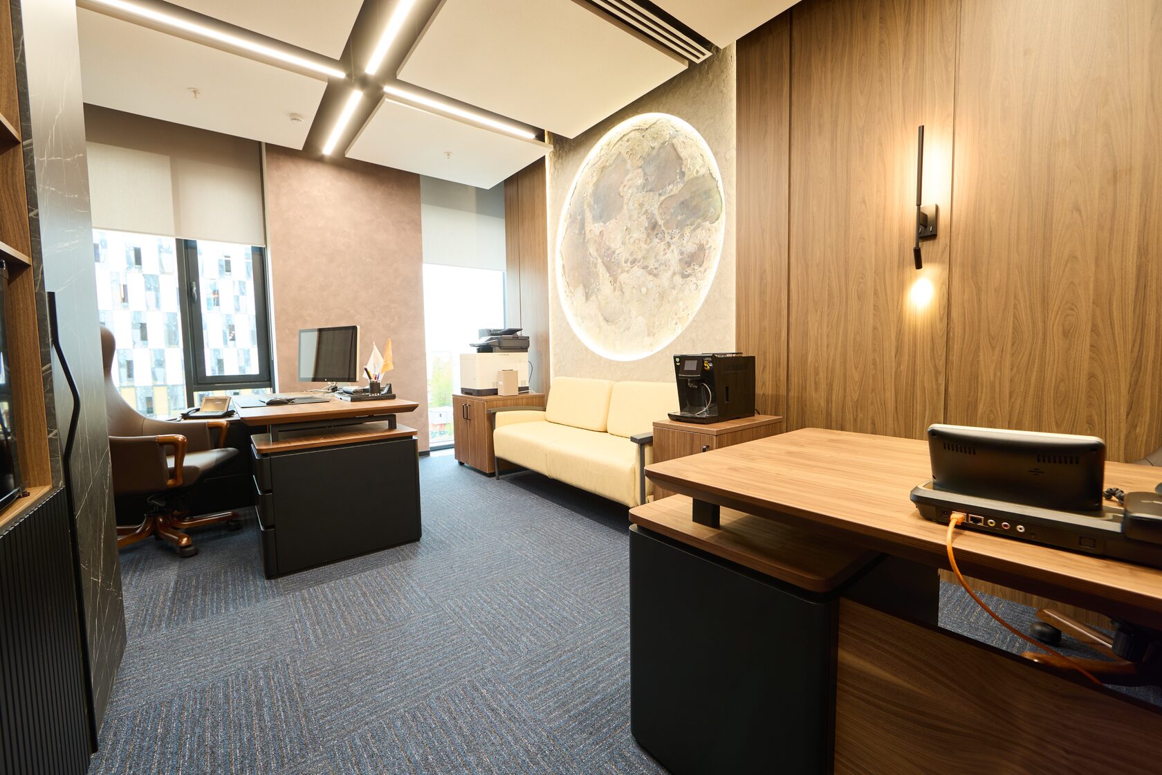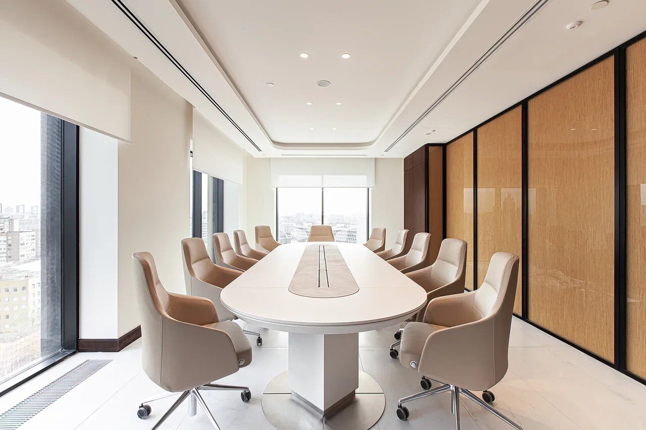 Концепция: Основа эстетической концепции – создание светлого, воздушного и уютного рабочего пространства. Эта идея реализуется через использование светлых оттенков отделочных материалов, применения панелей с мягкими углами, облицованных натуральным шпоном, и тщательного подбора элементов декора, включая предметы искусства. В интерьере тонко прослеживается тема богатства природных ресурсов России, таких как водные артерии, морские берега и транспорт, что привносит уникальный характер и глубину в каждый кабинет.