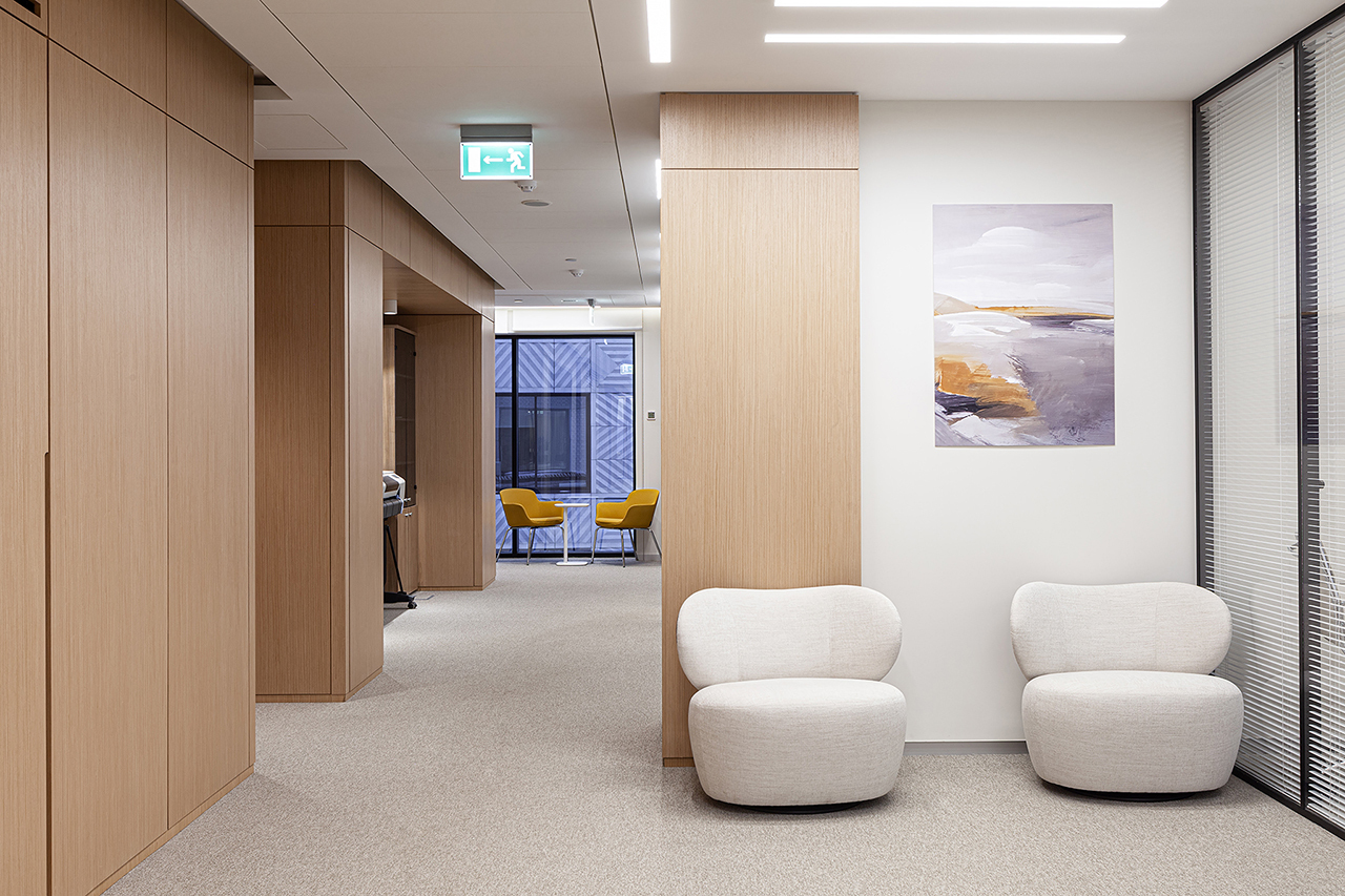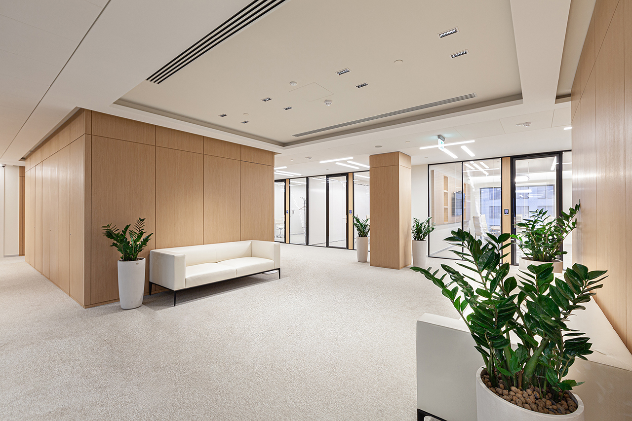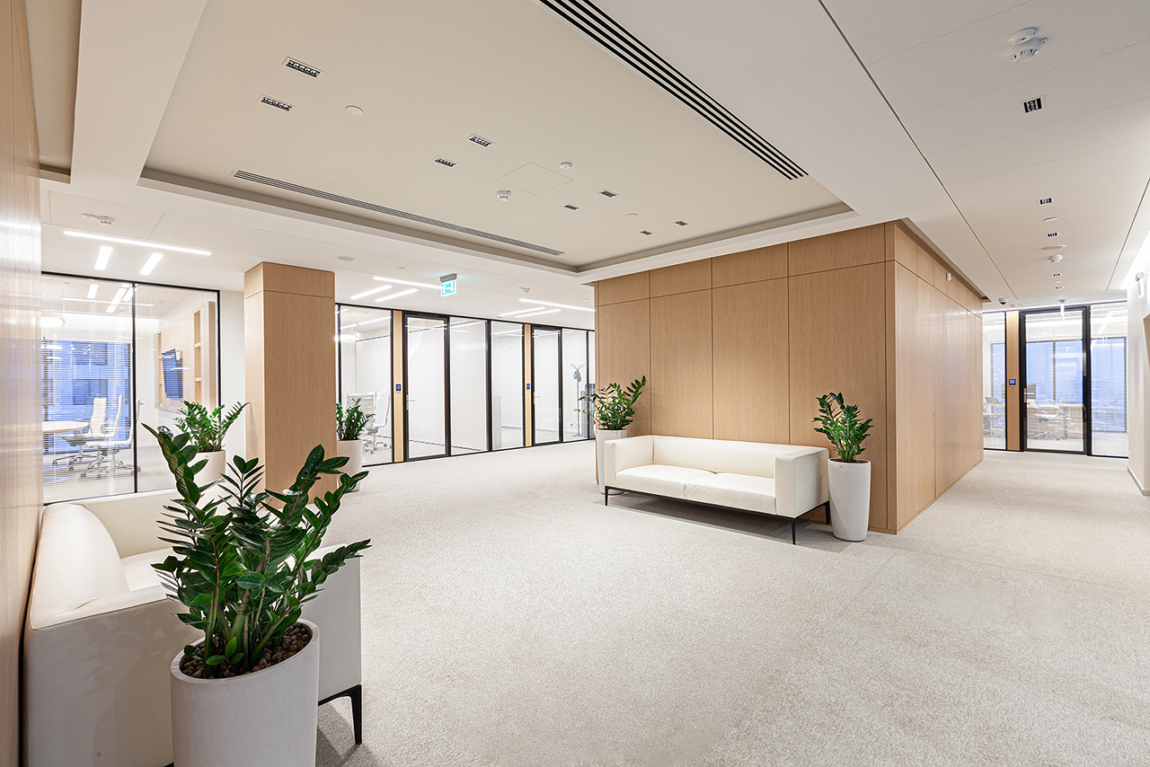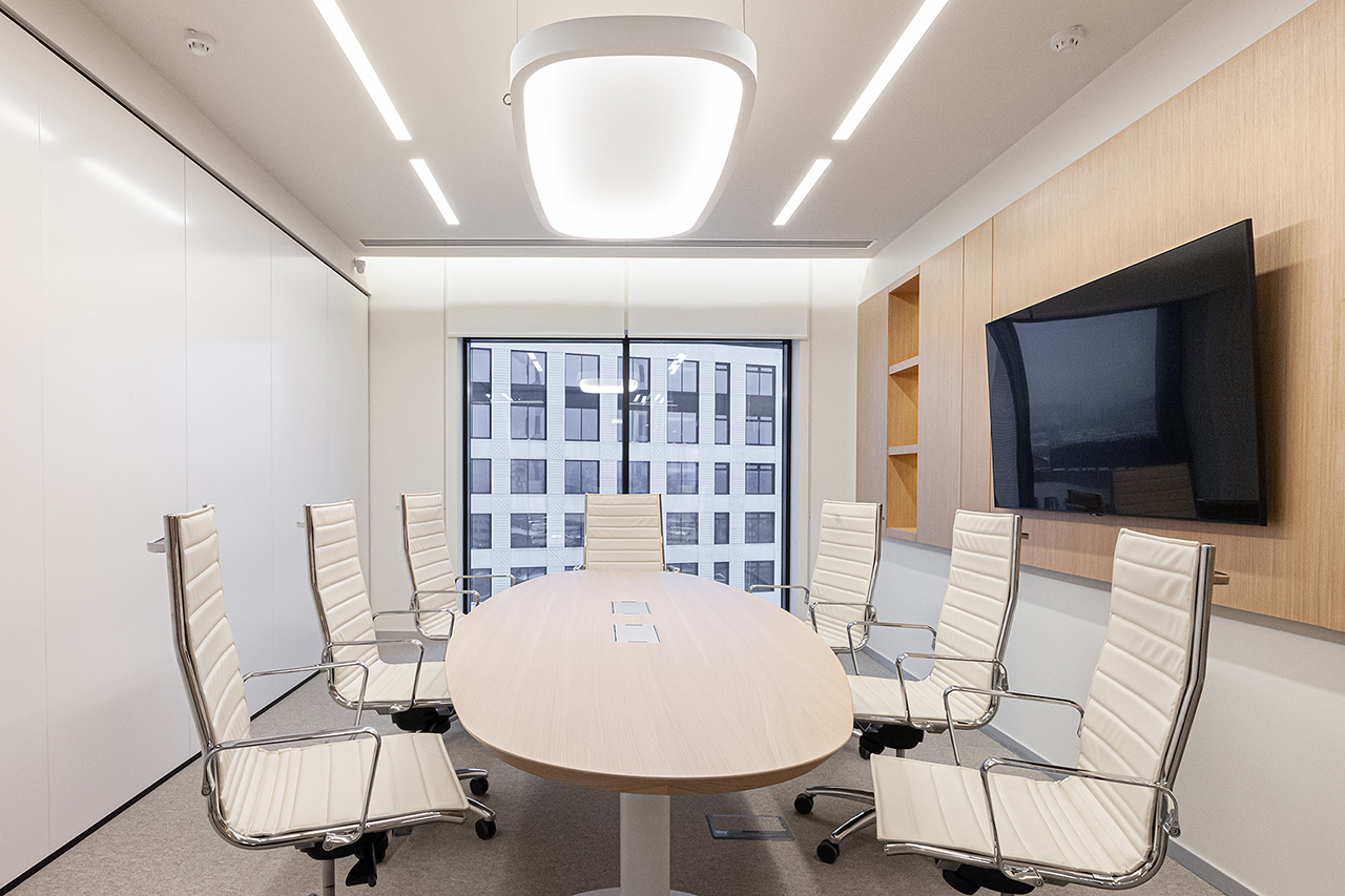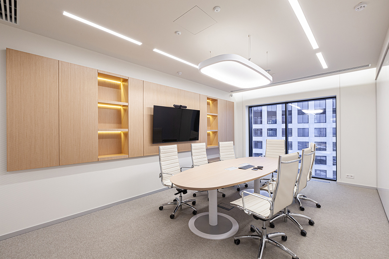 Концепция: Основа эстетической концепции – создание светлого, воздушного и уютного рабочего пространства. Эта идея реализуется через использование светлых оттенков отделочных материалов, применения панелей с мягкими углами, облицованных натуральным шпоном, и тщательного подбора элементов декора, включая предметы искусства. В интерьере тонко прослеживается тема богатства природных ресурсов России, таких как водные артерии, морские берега и транспорт, что привносит уникальный характер и глубину в каждый кабинет.
