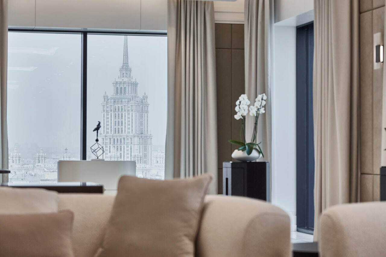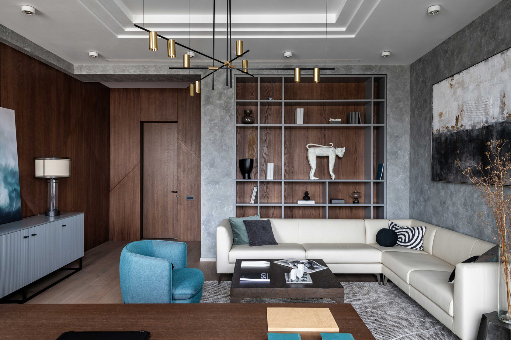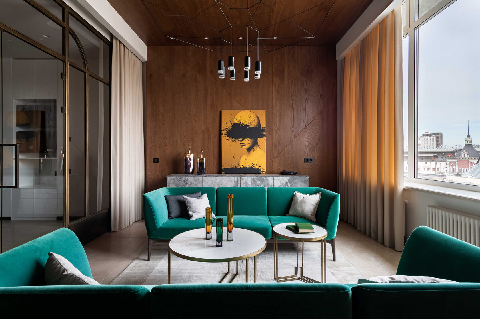 Высокие потолки, открытая планировка, эффектные виды из окон и общее ощущение воздуха стали основой для нового интерьера. Команда студии подошла к проекту коллективно: каждый сотрудник вносил предложения, а арт-директор Степан Бугаев курировал итоговую композицию.