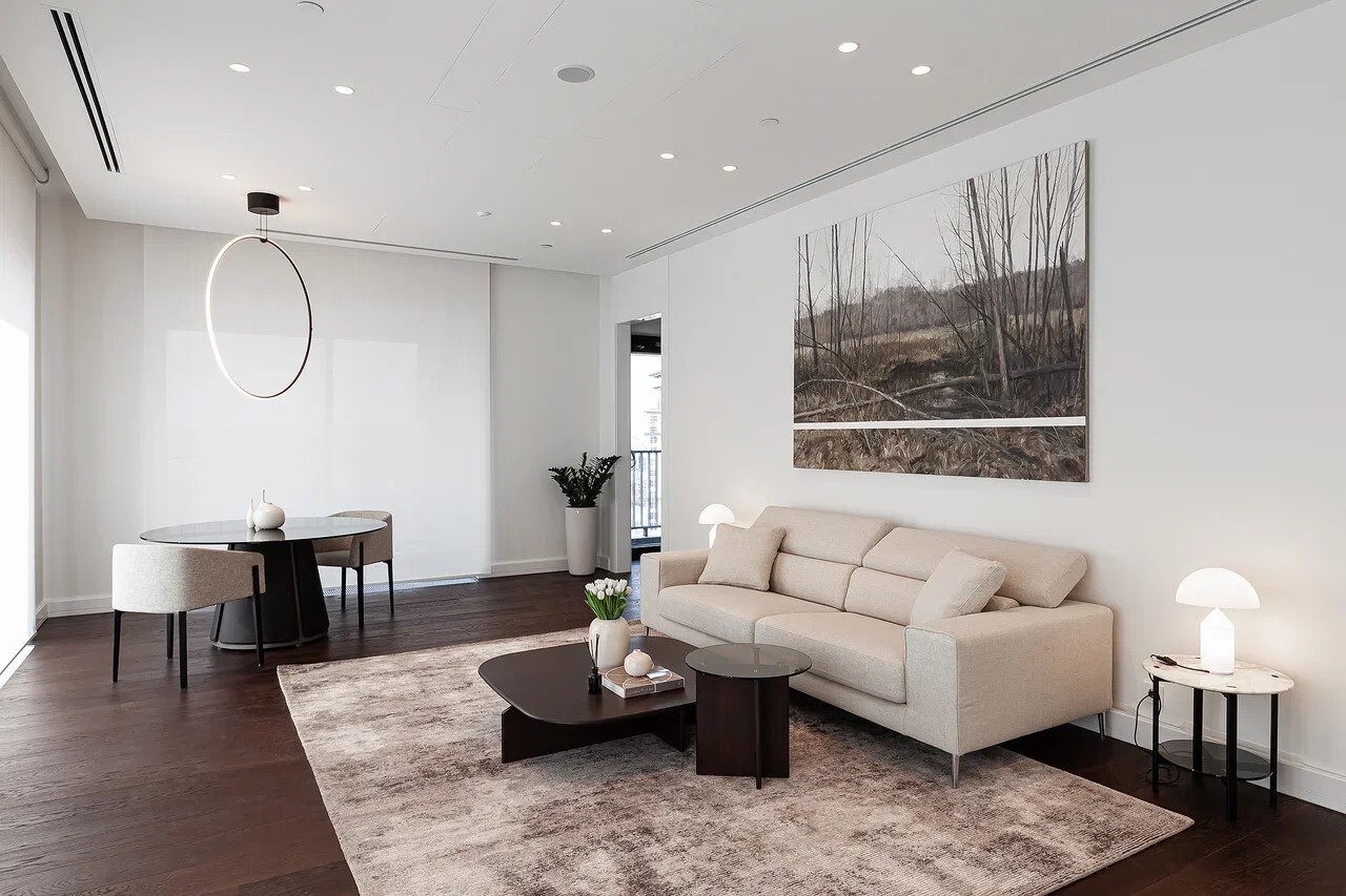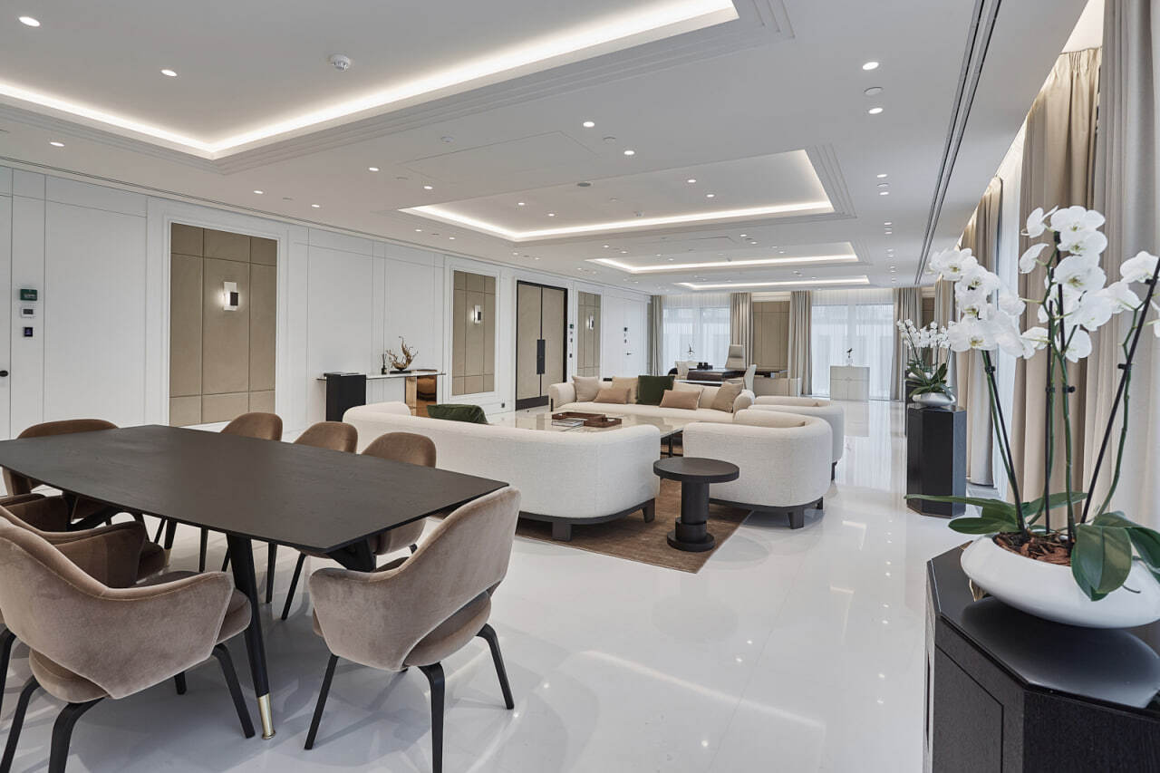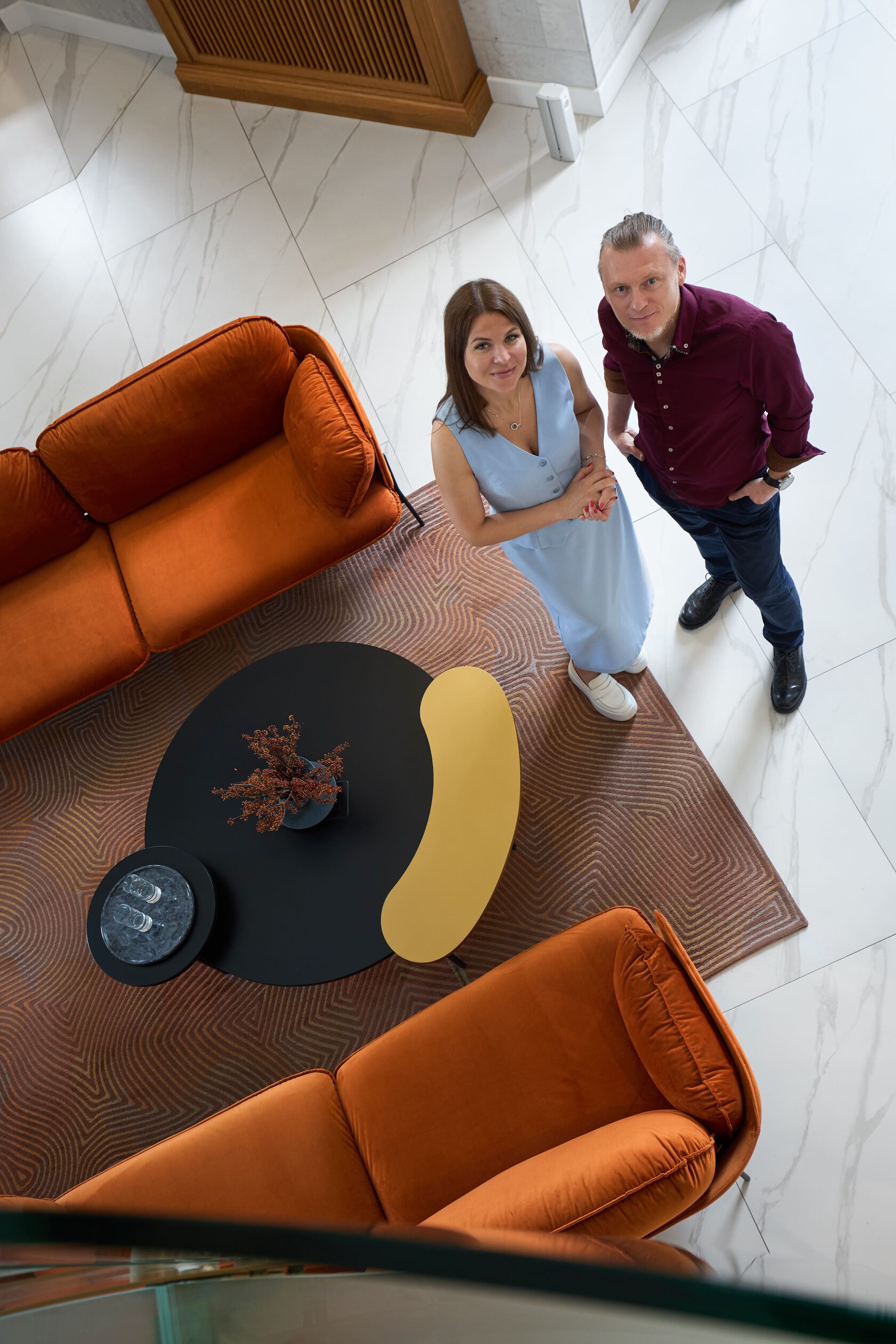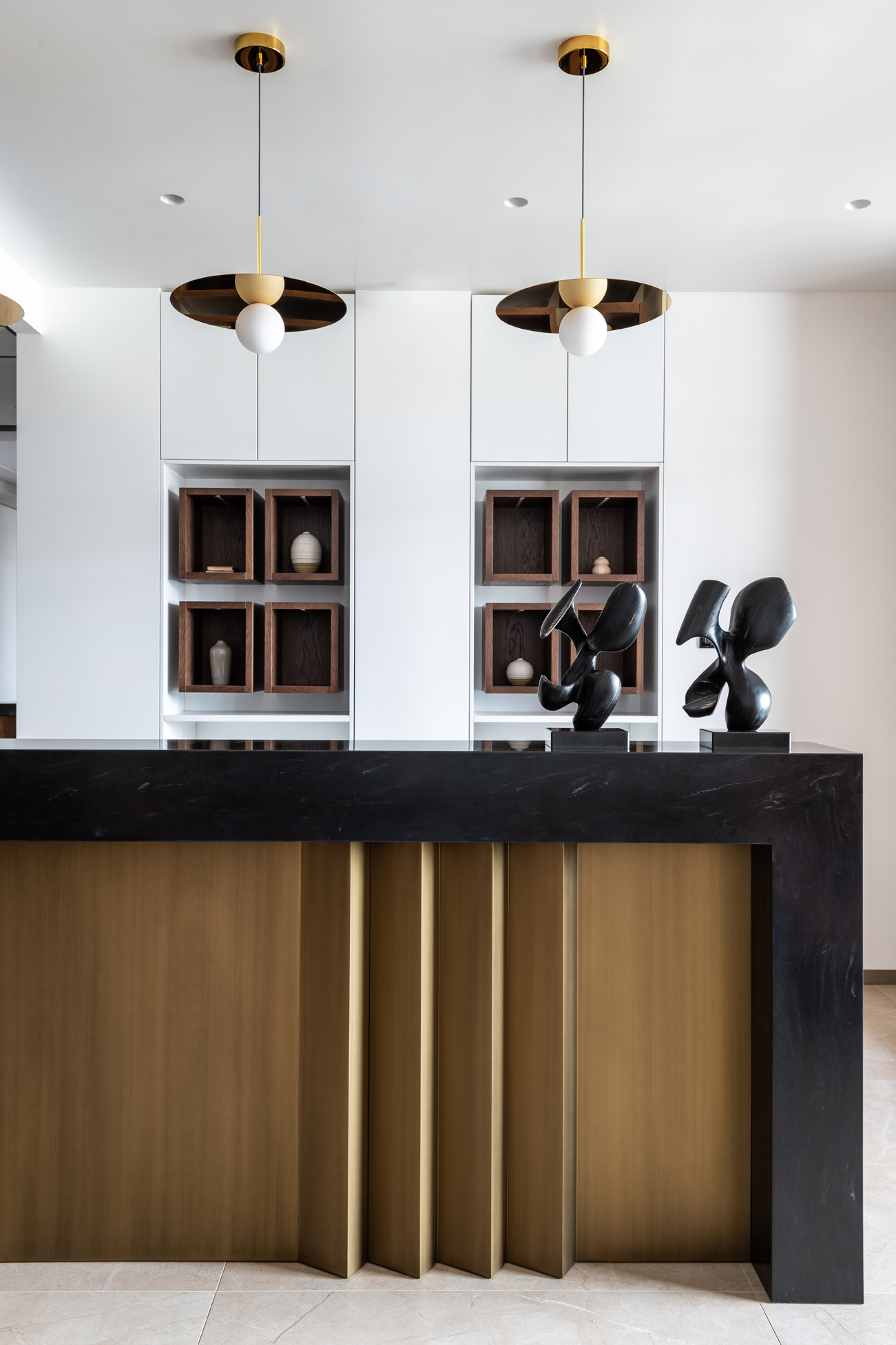 Высокие потолки, открытая планировка, эффектные виды из окон и общее ощущение воздуха стали основой для нового интерьера. Команда студии подошла к проекту коллективно: каждый сотрудник вносил предложения, а арт-директор Степан Бугаев курировал итоговую композицию.