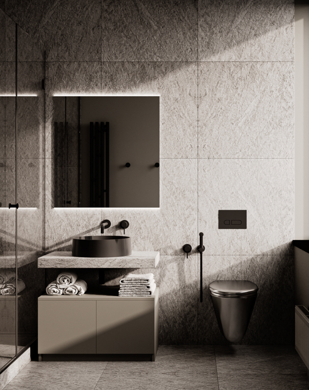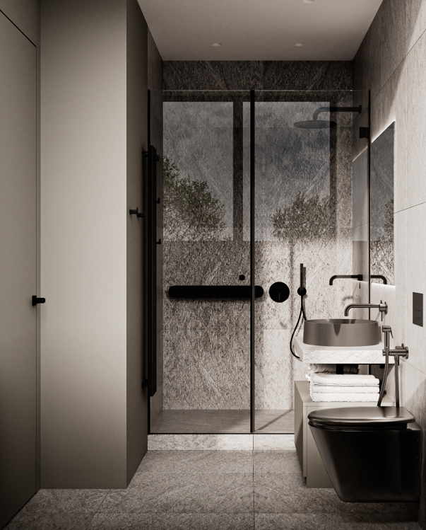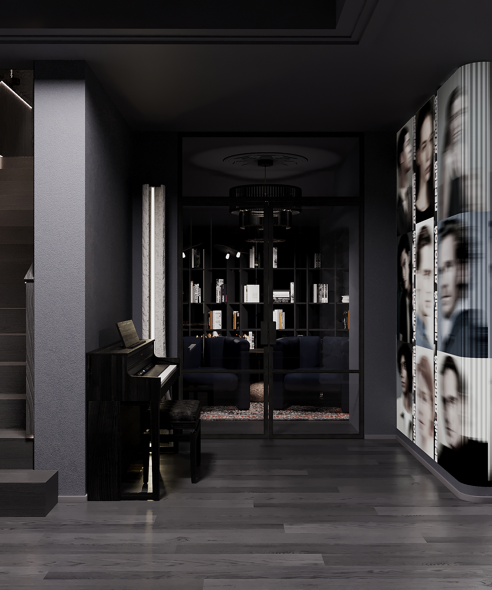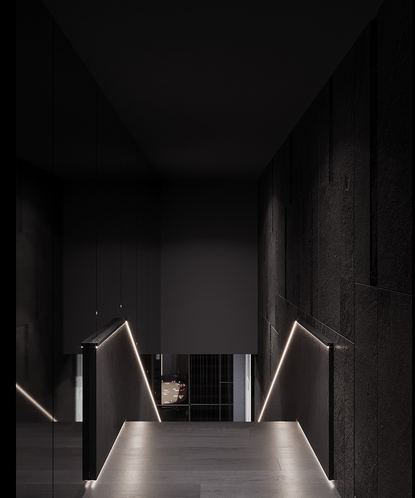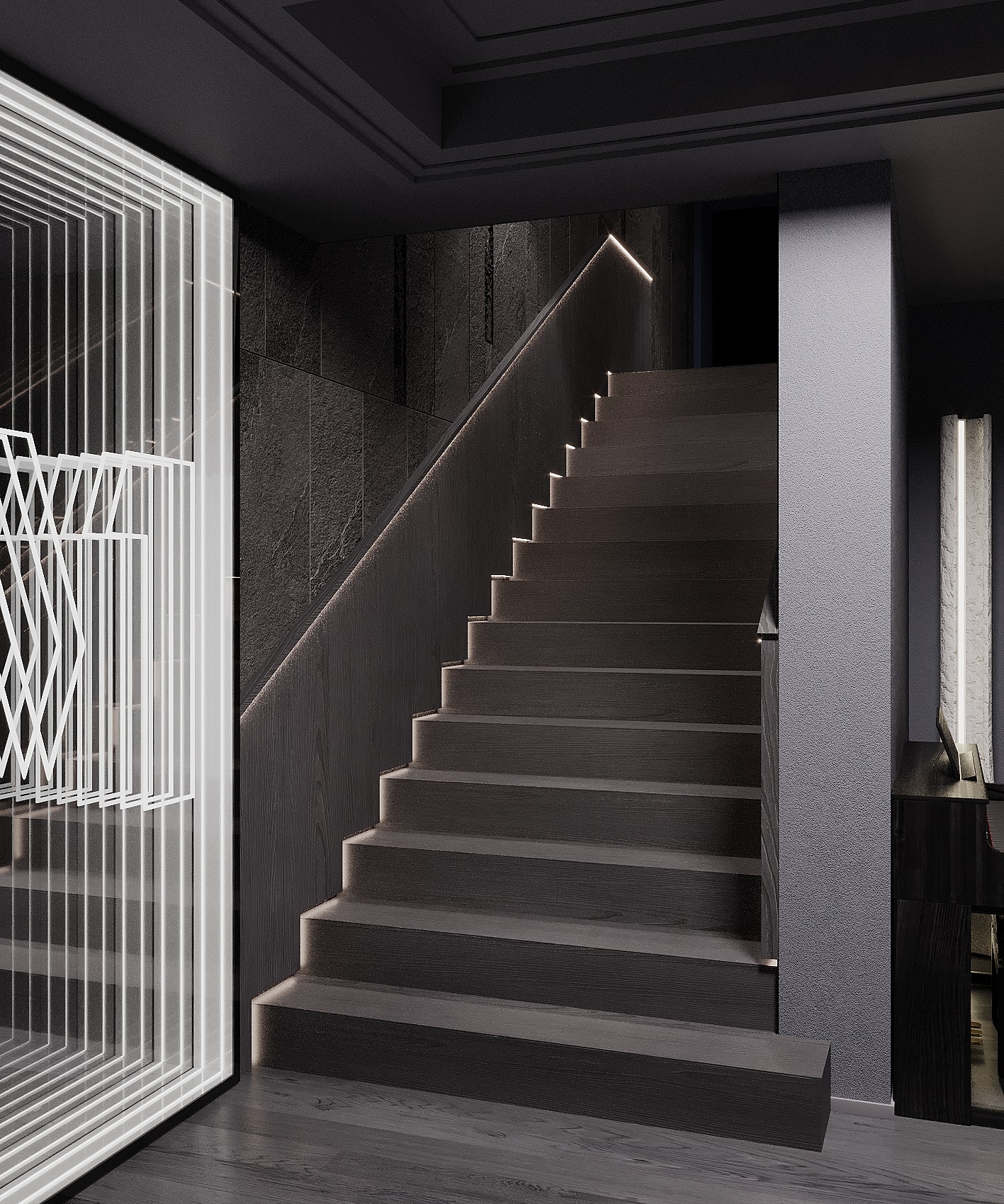 Концепция: Основу концепции составляет лаконичный и рациональный подход к планировке, продиктованный вытянутой формой здания. Дизайн интерьера воплощает монохромную эстетику, где теплые оттенки серого доминируют, дополненные бежевыми акцентами и контрастными черными деталями. Использование натуральных текстур — дерева, камня и бетона — создает тактильно насыщенное, но при этом сбалансированное пространство. Динамичная лестница с элементами подиума и ограждением из стекла визуально объединяет уровни, а легкие стеклянные перегородки с круглыми элементами обеспечивают визуальную связь и ощущение простора, сохраняя при этом приватность зон. Теплое освещение усиливает ощущение уюта и безопасности.