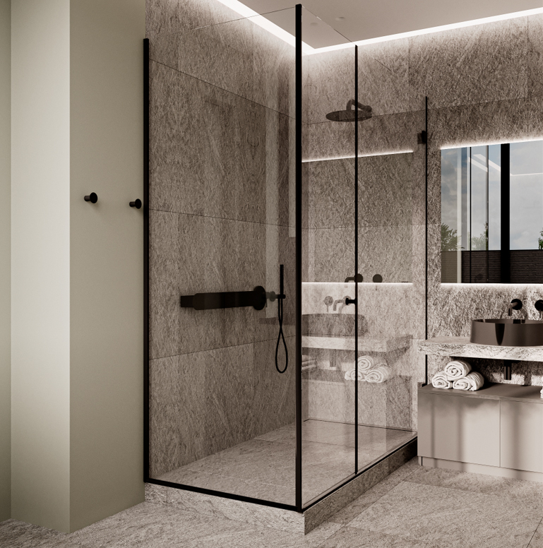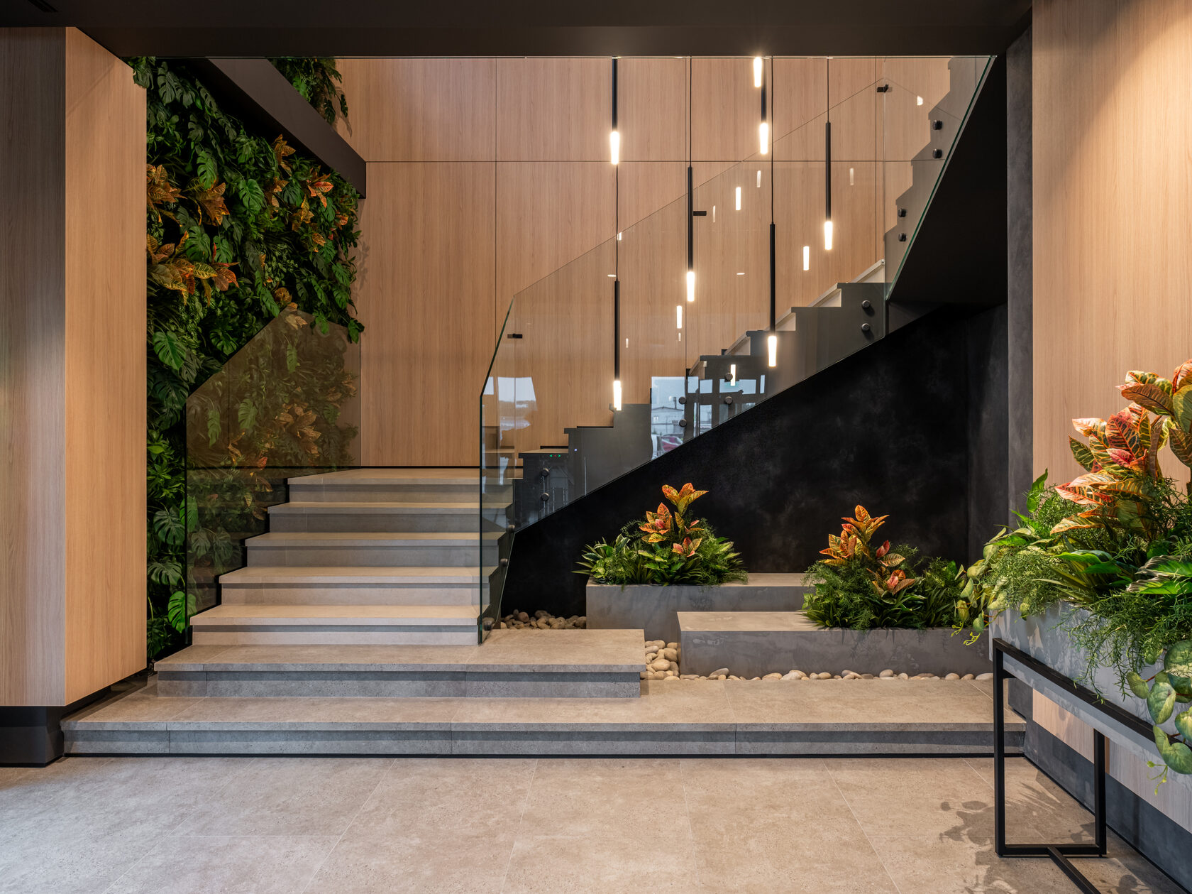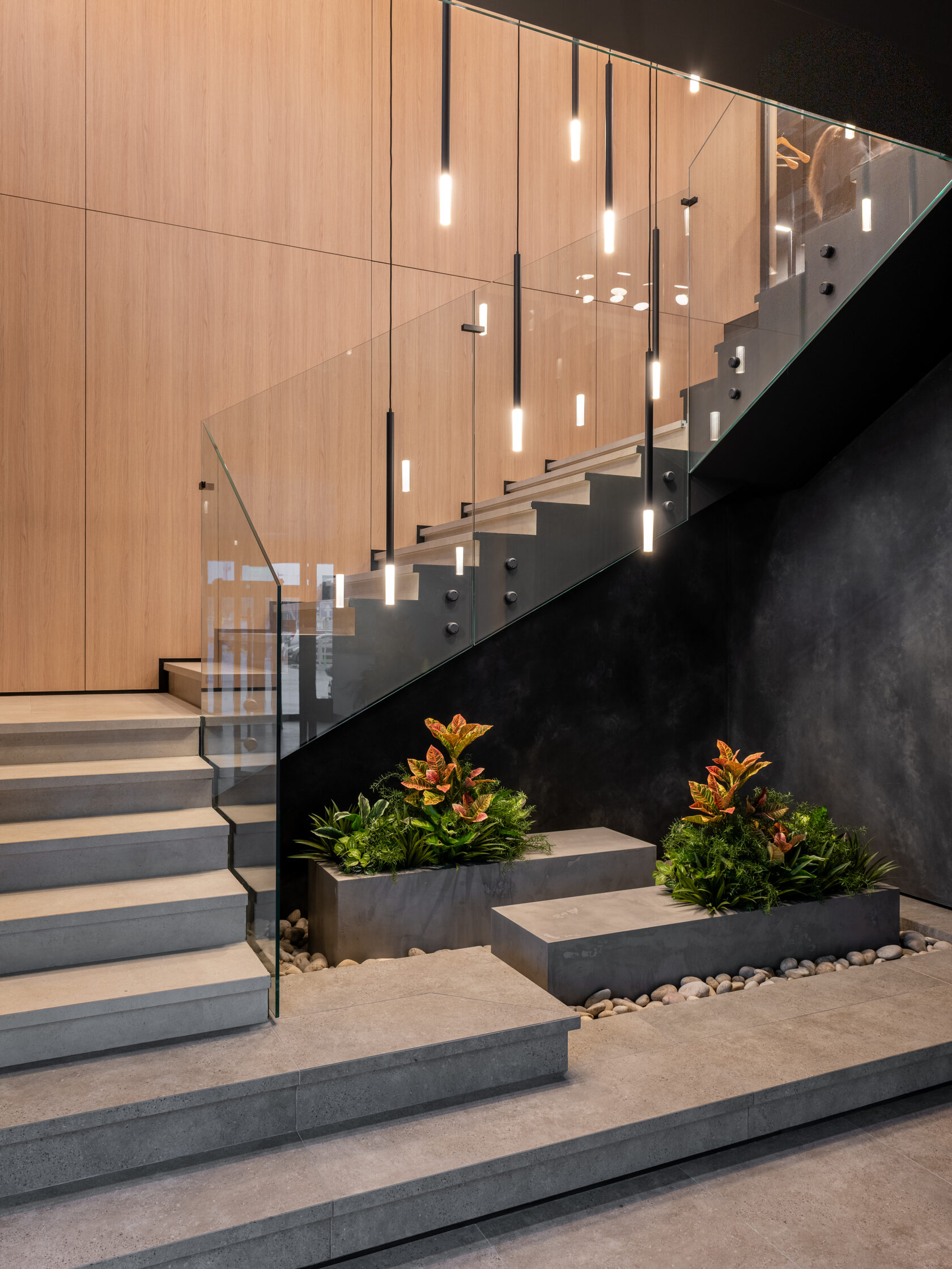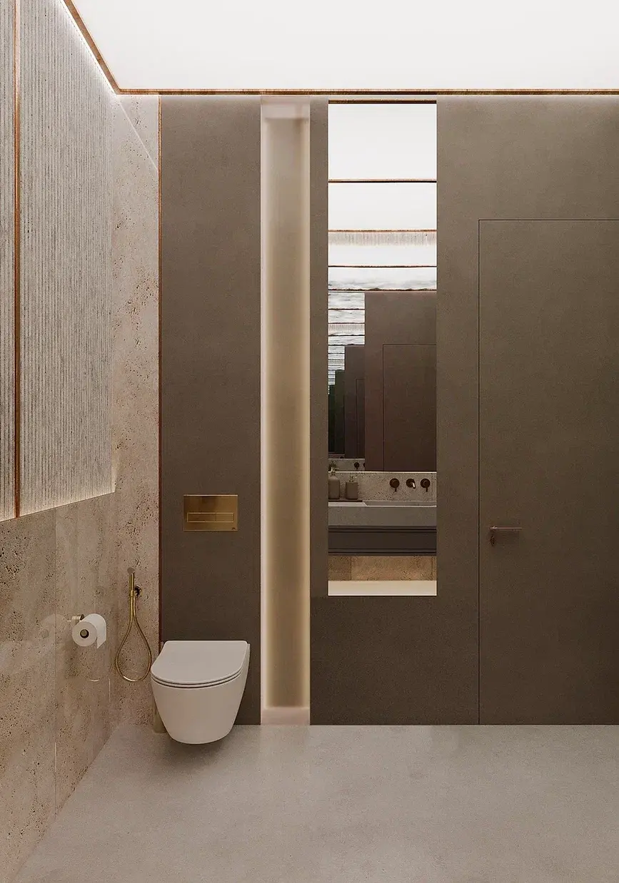 Концепция: Основу концепции составляет лаконичный и рациональный подход к планировке, продиктованный вытянутой формой здания. Дизайн интерьера воплощает монохромную эстетику, где теплые оттенки серого доминируют, дополненные бежевыми акцентами и контрастными черными деталями. Использование натуральных текстур — дерева, камня и бетона — создает тактильно насыщенное, но при этом сбалансированное пространство. Динамичная лестница с элементами подиума и ограждением из стекла визуально объединяет уровни, а легкие стеклянные перегородки с круглыми элементами обеспечивают визуальную связь и ощущение простора, сохраняя при этом приватность зон. Теплое освещение усиливает ощущение уюта и безопасности.