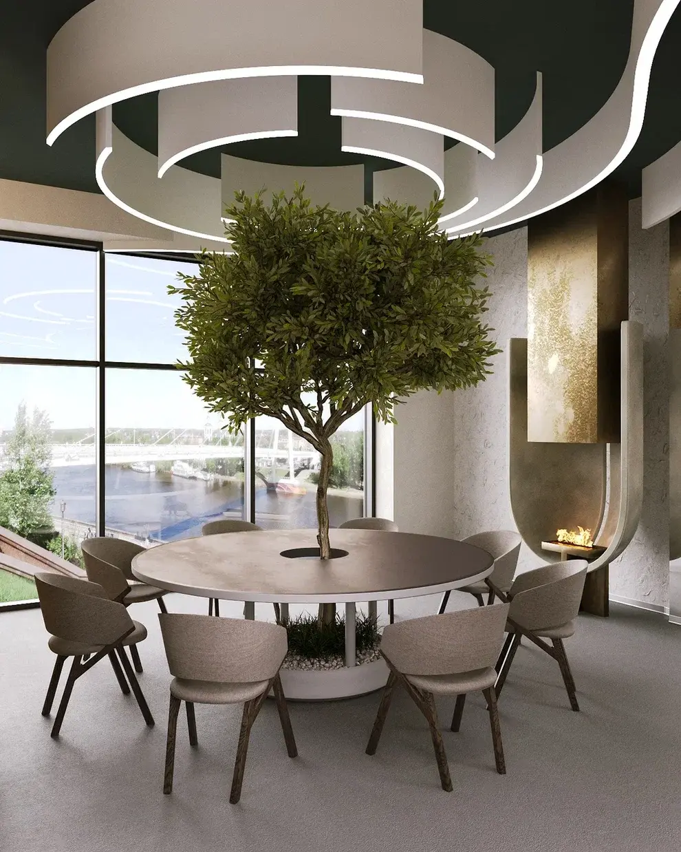 Этот уникальный проект представляет собой современный офис продаж для застройщика индивидуального жилищного строительства, расположенный в историческом центре Тюмени с захватывающим видом на Мост Влюбленных. Интерьер разработан с целью создания атмосферы максимального комфорта и уюта, подготавливающей клиента к мечте о собственном загородном доме. Пространство отличает исключительная многофункциональность: зона ресепшн легко трансформируется в ивент-площадку для проведения мероприятий до 25 гостей. Центральное место занимает импровизированная гостиная с камином и массивным круглым столом, столешница которого эффектно интегрирована с живым деревом. Для удобства сотрудников предусмотрены многозадачный open space, комнаты отдыха и различные переговорные, а для юных посетителей – продуманная детская игровая зона.