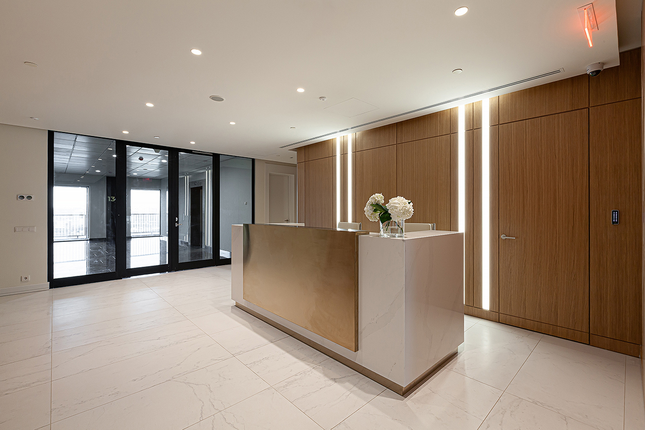 Этот проект представляет собой эксклюзивный офисный интерьер, расположенный на одном из верхних этажей современного бизнес-центра «Атлантик», в шаговой доступности от Киевского вокзала и метро. Разработанный для высококлассной аренды, без заранее определенного арендатора, он ориентирован на топ-менеджмент или частные компании, предлагая универсальный дизайн и максимально продуманную функциональность. Ключевой акцент сделан на захватывающий панорамный вид на город, который стал основополагающим фактором в организации пространства и зонировании.