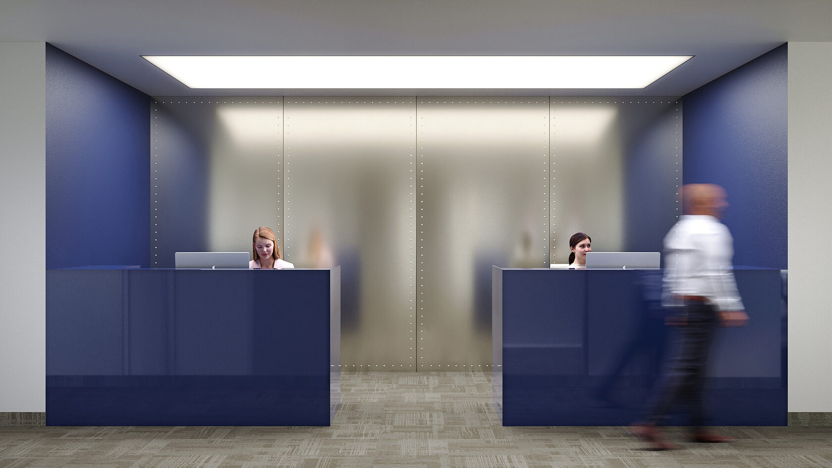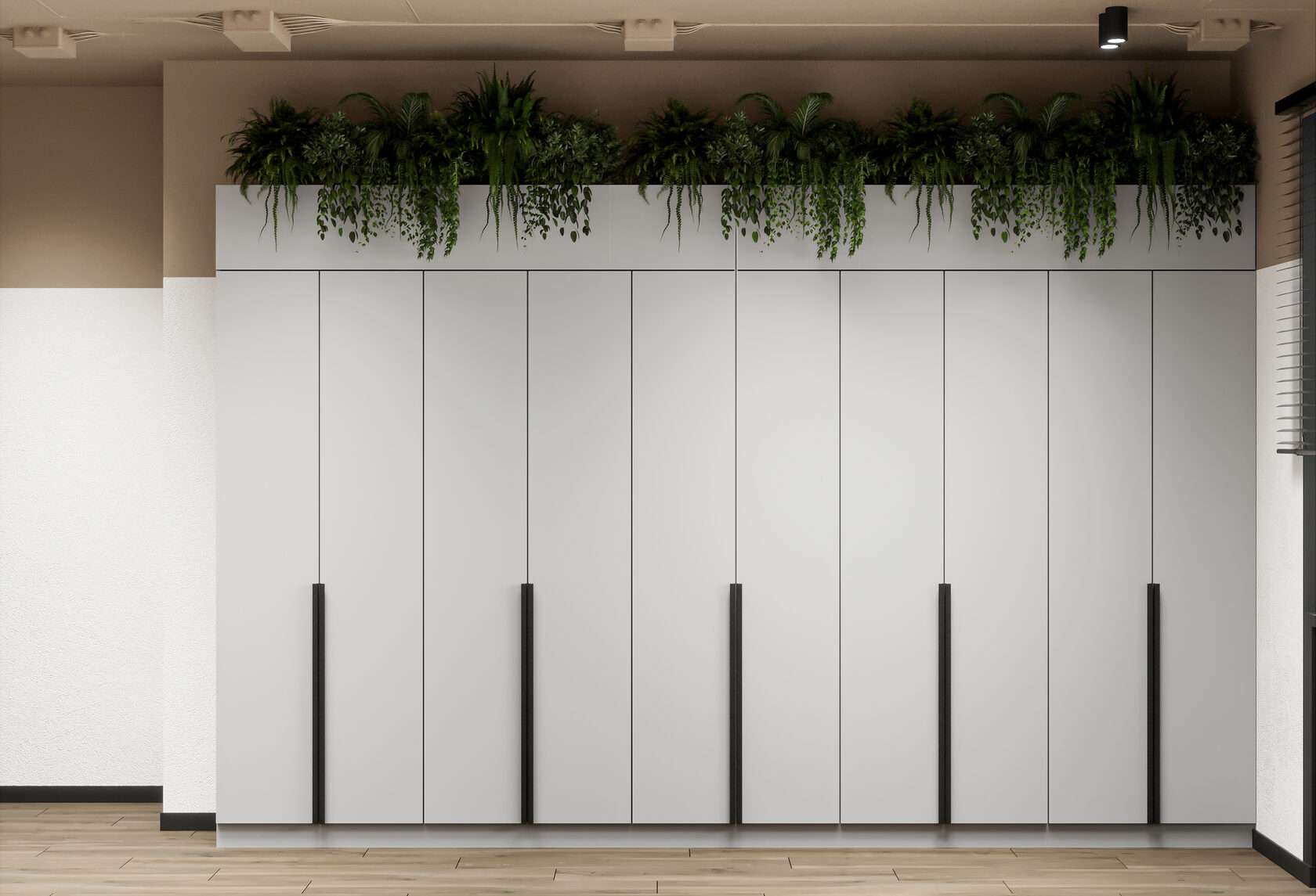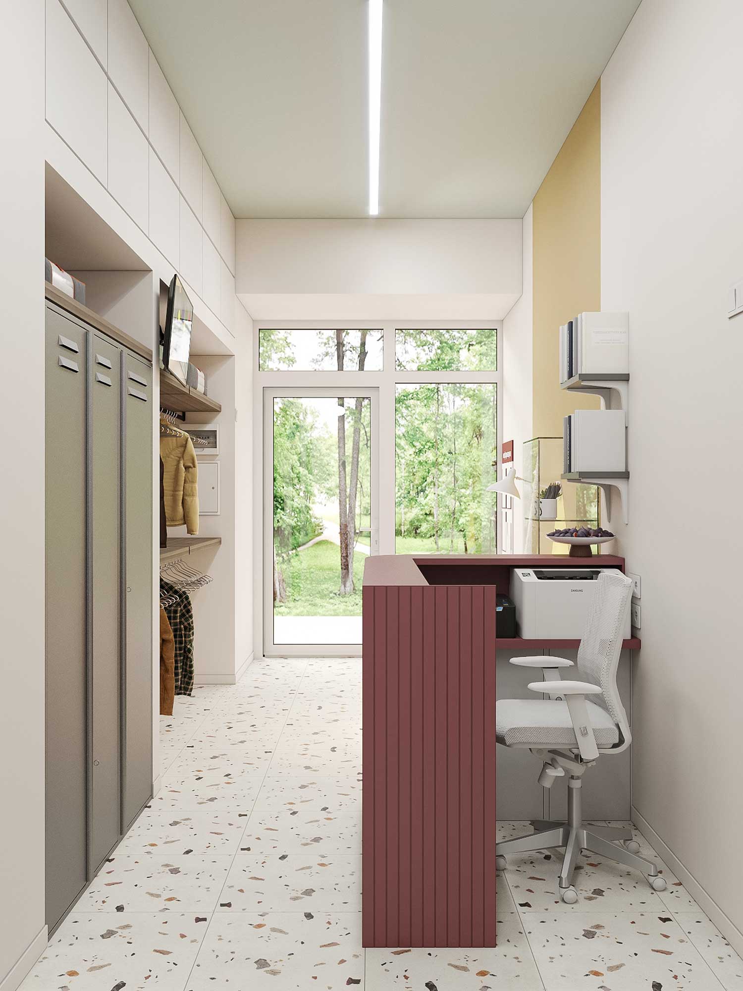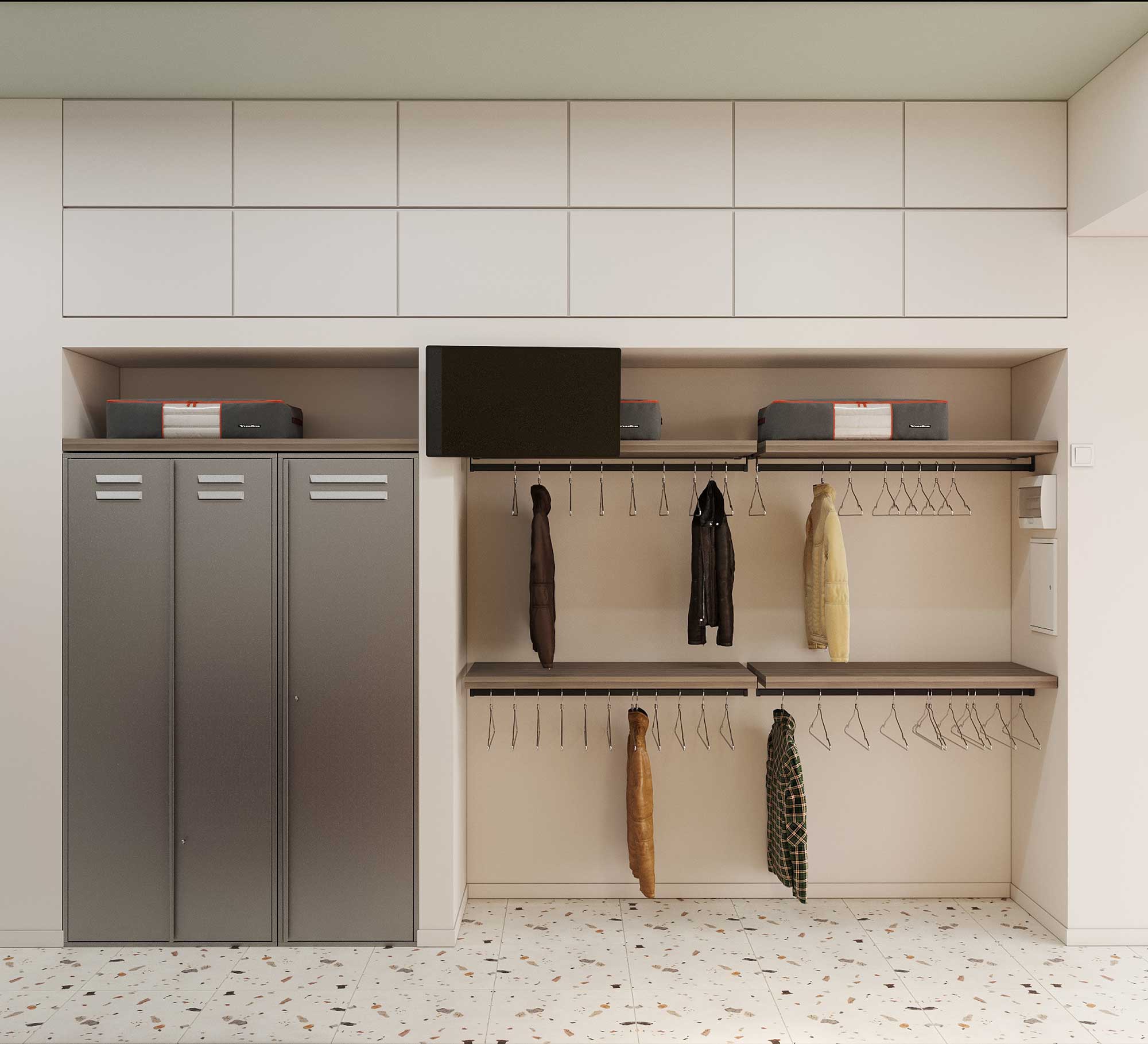 Входная группа — гардеробная с закрытыми шкафами и зона ресепшн, плавно переходящая в коворкинг