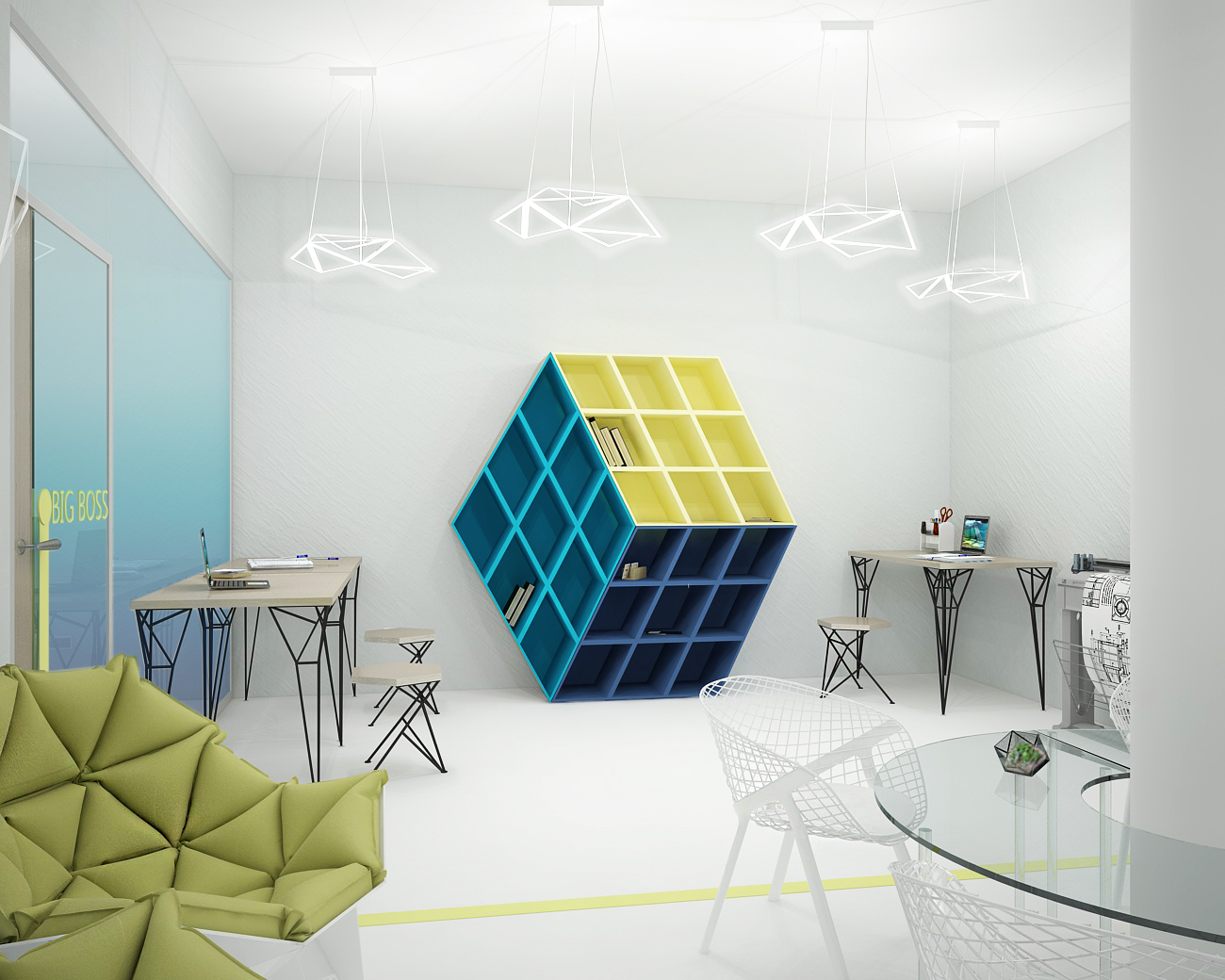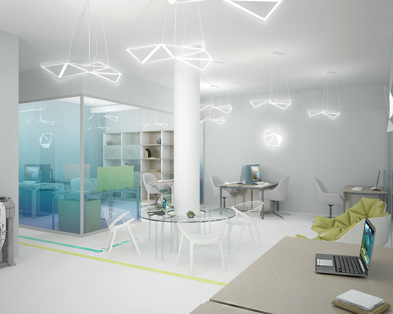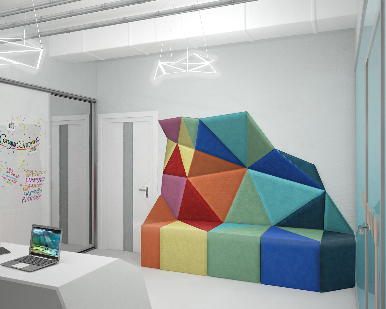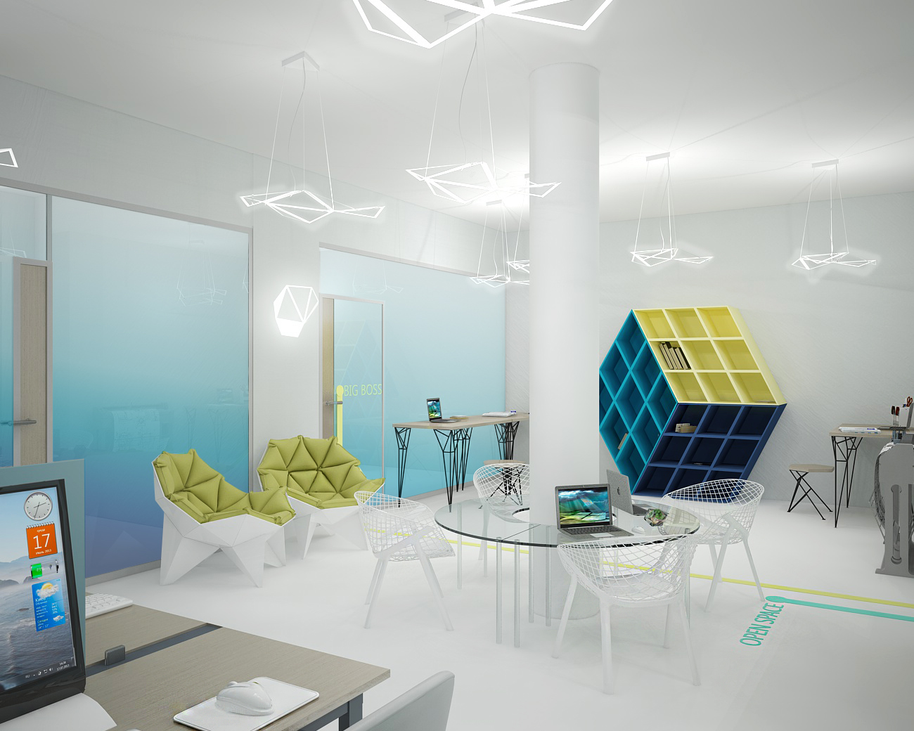 Концепция Интерьер строится на сочетании сдержанного серого и графитового фона с насыщенными цветовыми акцентами и выразительной геометрией. Центром офиса стал опен-спейс с панорамными окнами — его дополнили нестандартными рабочими столами, спроектированными специально для «Лебер». Необычные формы мебели позволили каждому сотруднику получить персональное пространство в рамках общей зоны.