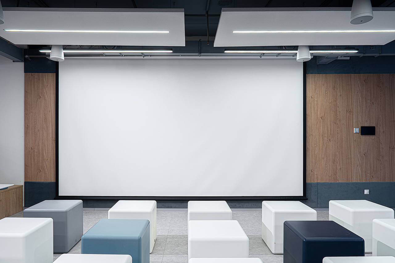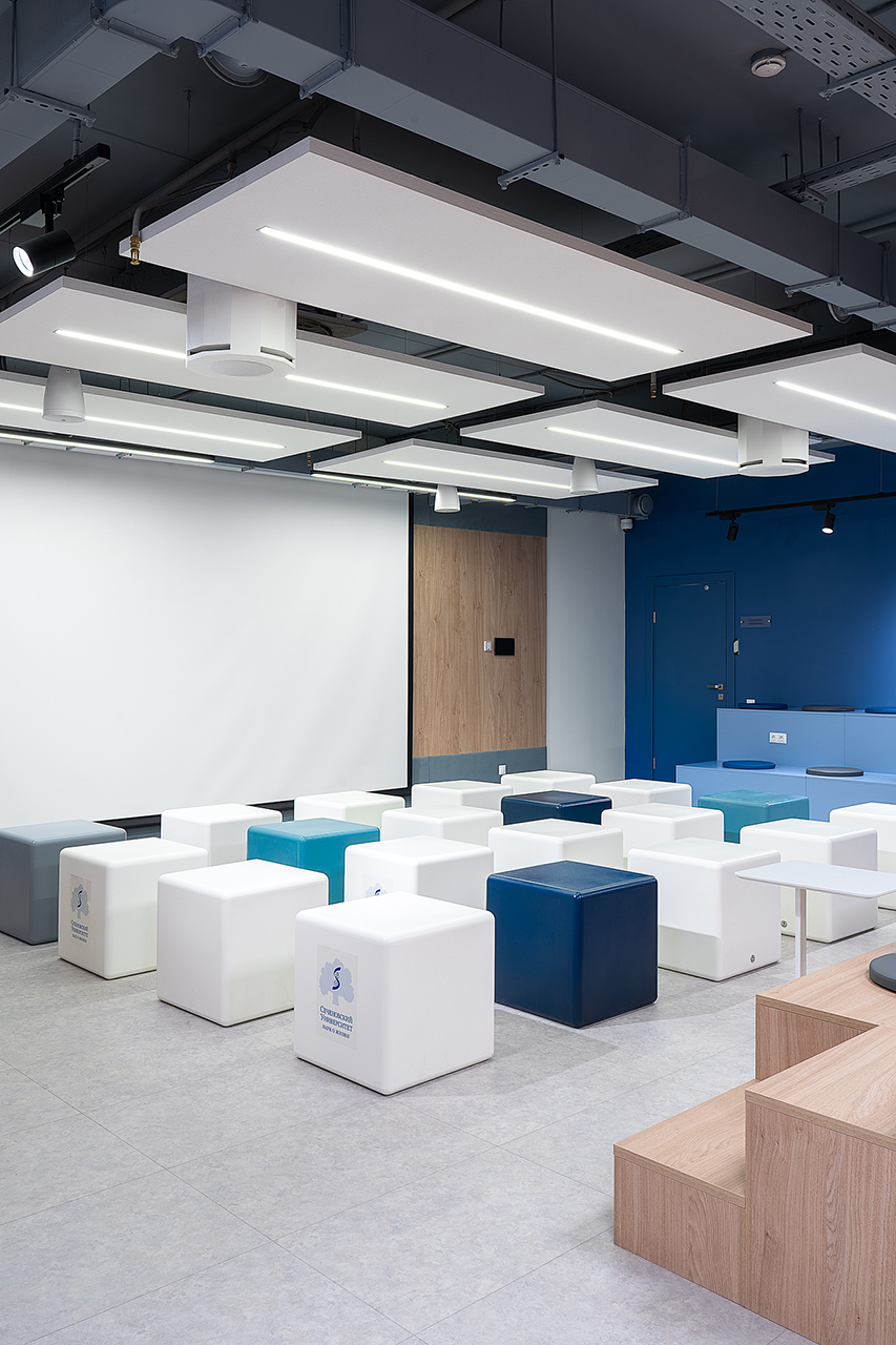Главной общественной зоной стал лекторий с фанерным амфитеатром и книжными полками — пространство для встреч, обсуждений и презентаций. Его облик был выбран в рамках внутреннего конкурса: победила концепция дизайнера Екатерины Олейниковой, основанная на идее «уютной среды для общения».