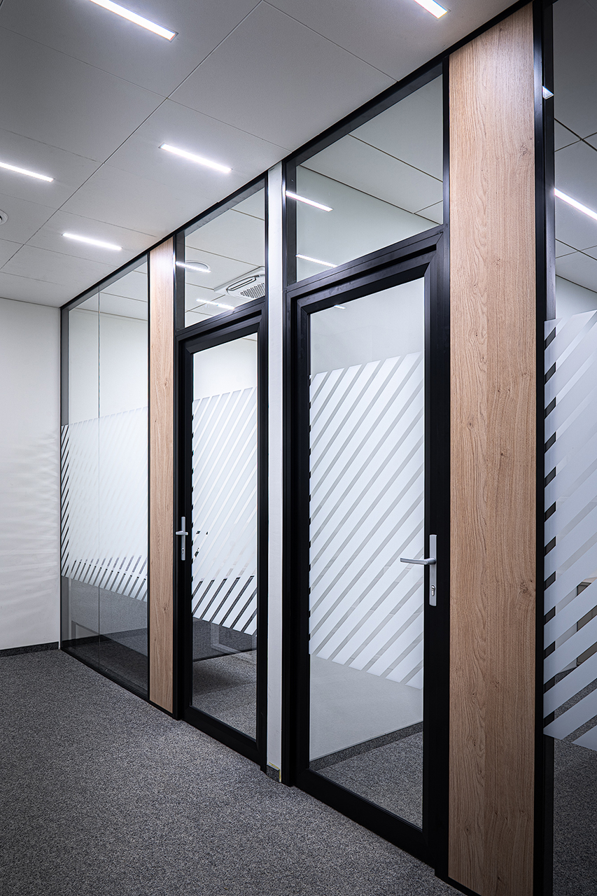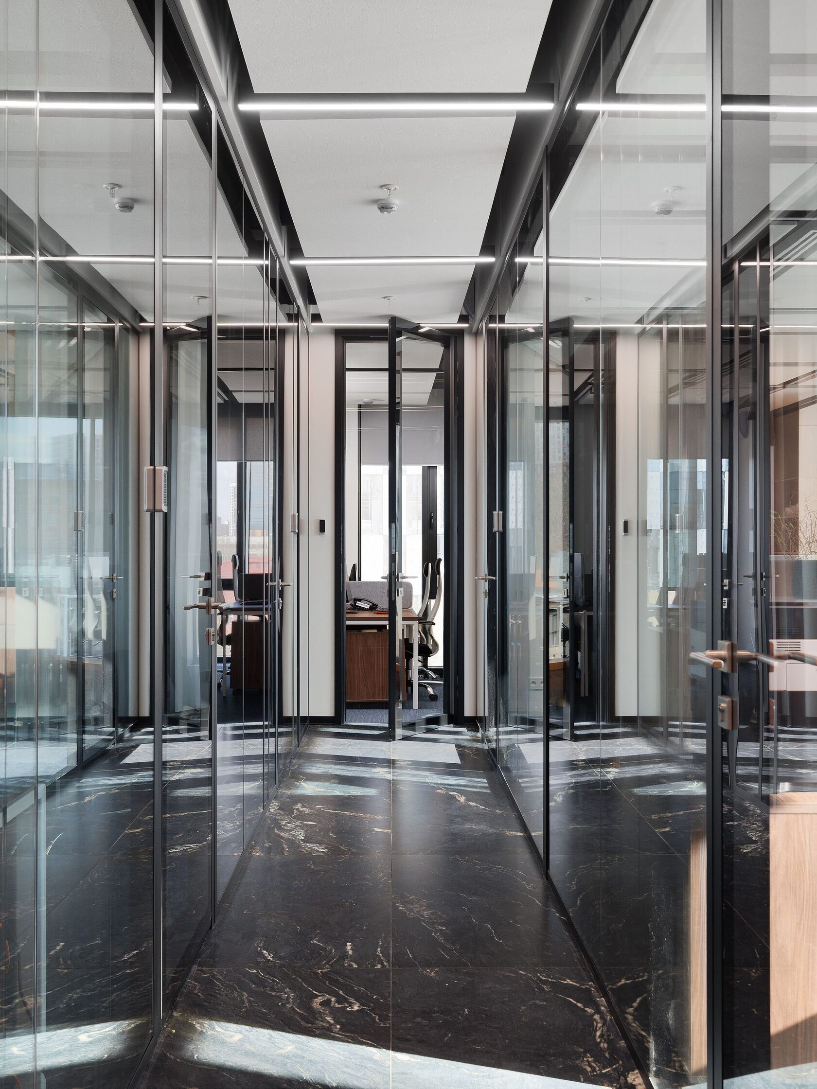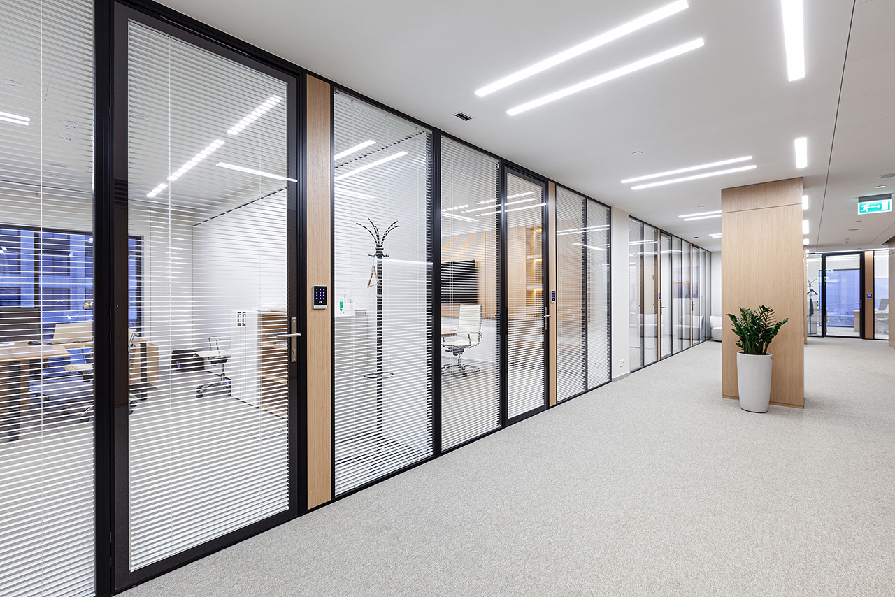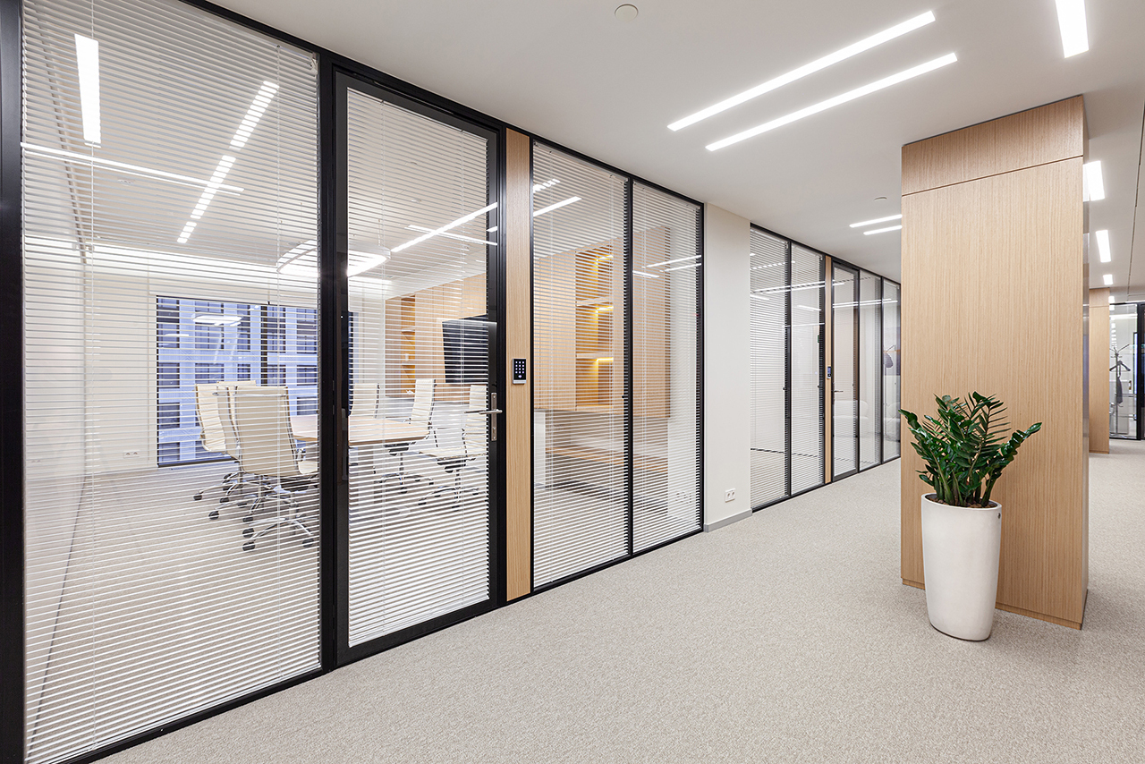 Прозрачность: стеклянные перегородки и большие окна наполняют пространство светом, визуально расширяя его границы и разрушая ощущение замкнутости.