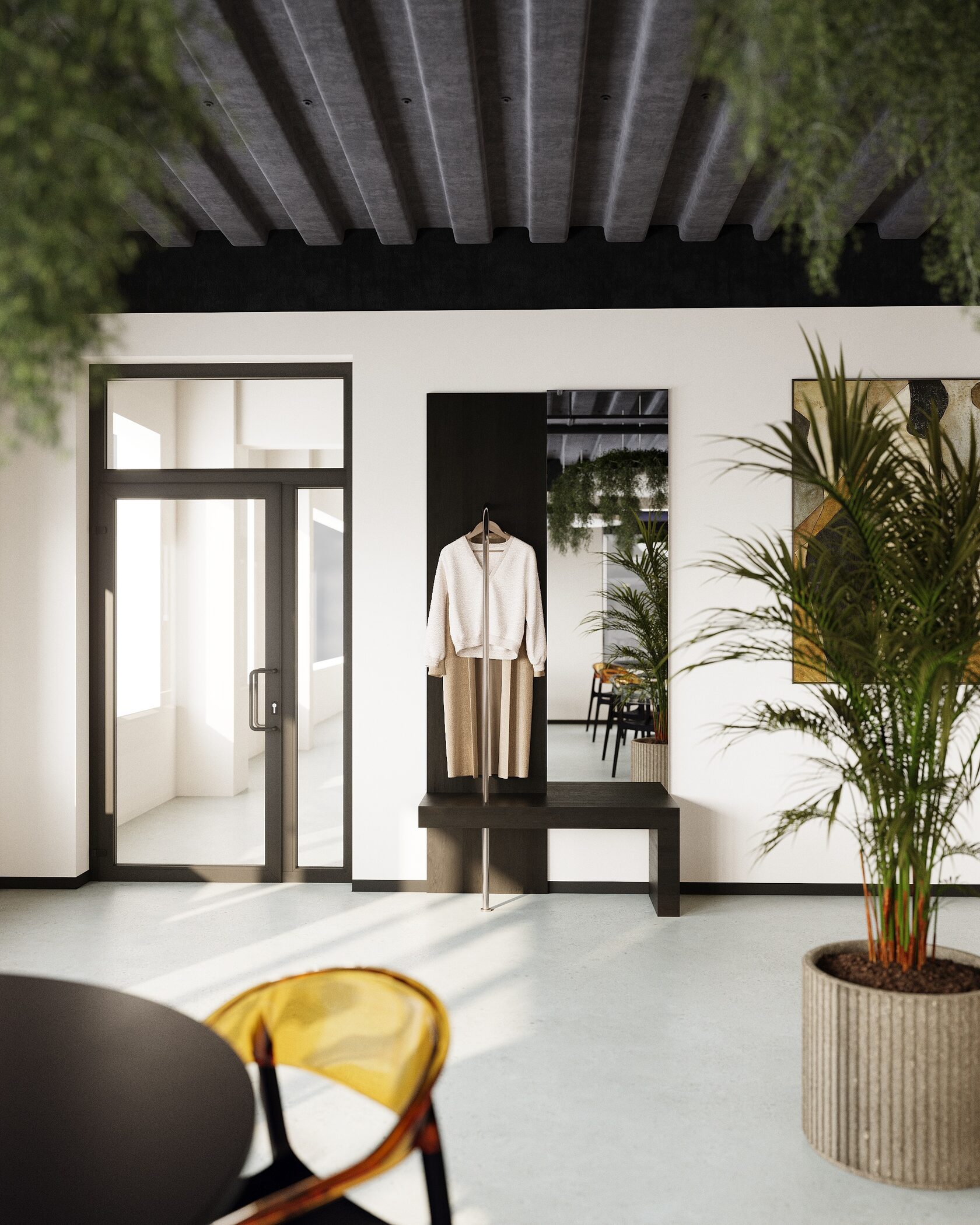 Концепция и стиль Интерьер выполнен в современном лофте с элементами минимализма. Грубая фактура старинного кирпича органично соседствует с гладкими стеклянными перегородками, черным металлом и минималистичной мебелью. Такой контраст создаёт визуальный ритм и подчёркивает как промышленное наследие, так и стремление к инновациям. Основная идея — равновесие между прошлым и будущим. Архитектура здания «говорит», а интерьер помогает ей звучать современно: