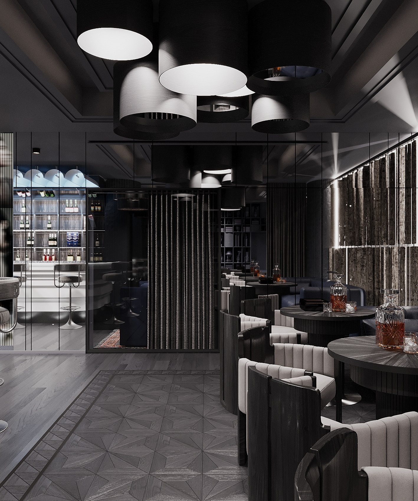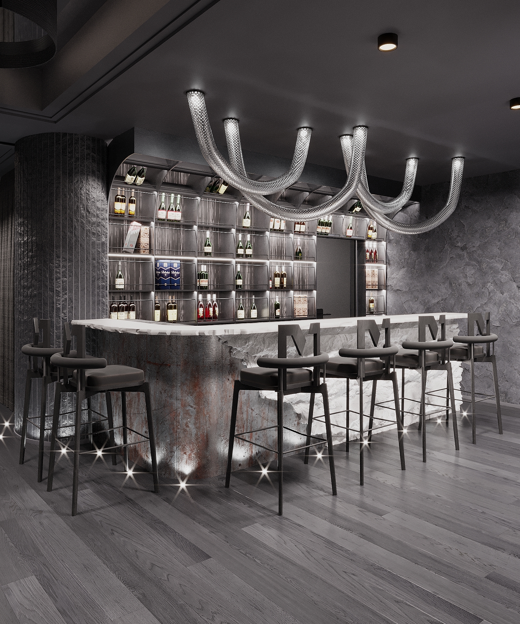 Концепция: Основная идея — формирование целостного пространства, передающего смыслы праотцов регионального бизнеса. Для этого были разработаны эксклюзивные элементы: светильники, световые инсталляции, барная стойка из камня и металла, а также металлические стеллажи и полки сложной формы. Эти предметы не случайны, а служат созданию концептуальной истории и уникальной атмосферы.