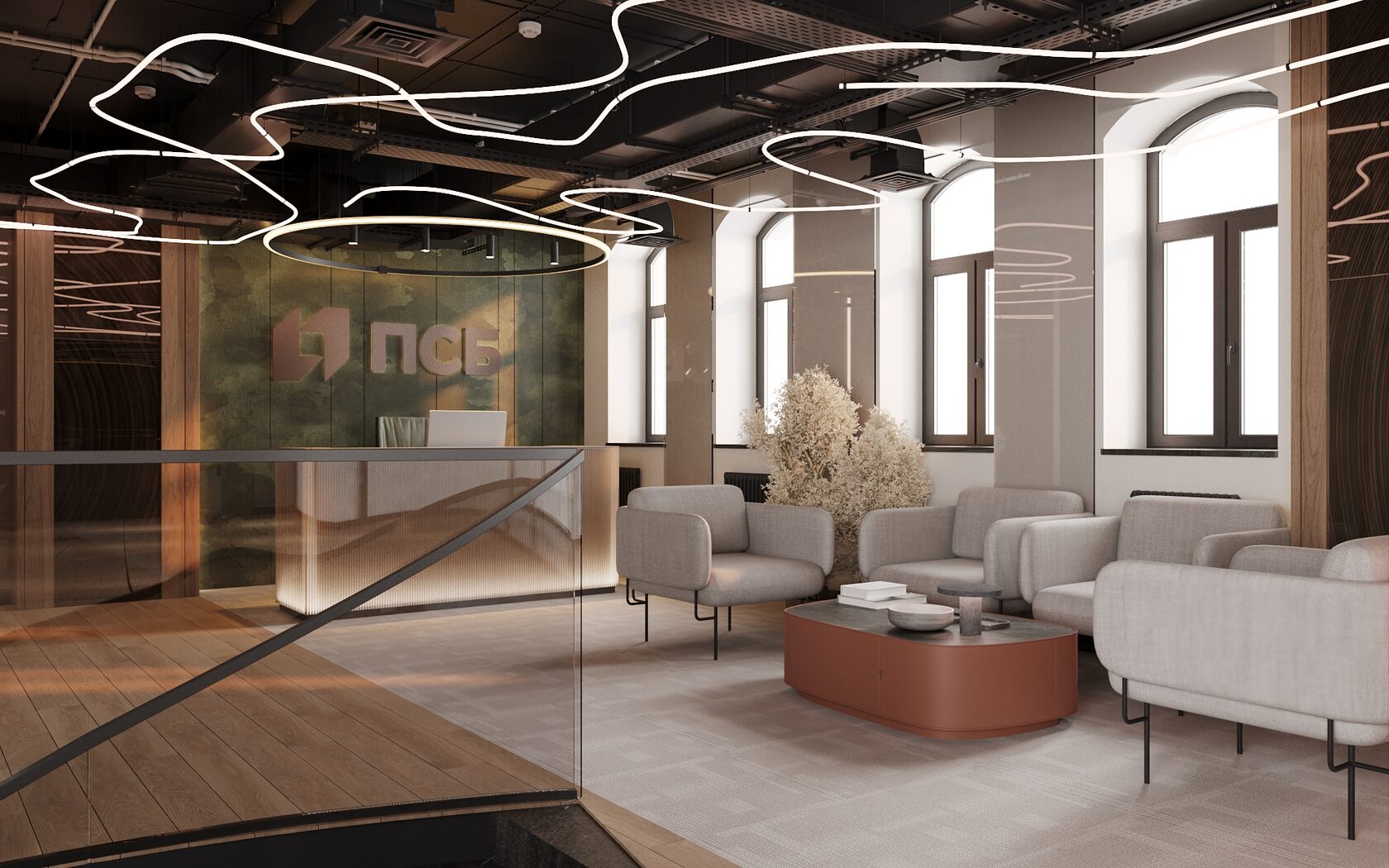 Архитектурное бюро SketchLab разработало проект офисного пространства Промсвязьбанка (ПСБ) в историческом центре Москвы. Главная задача заключалась в создании современного и репрезентативного офиса для работы с клиентами из оборонно-промышленного комплекса.