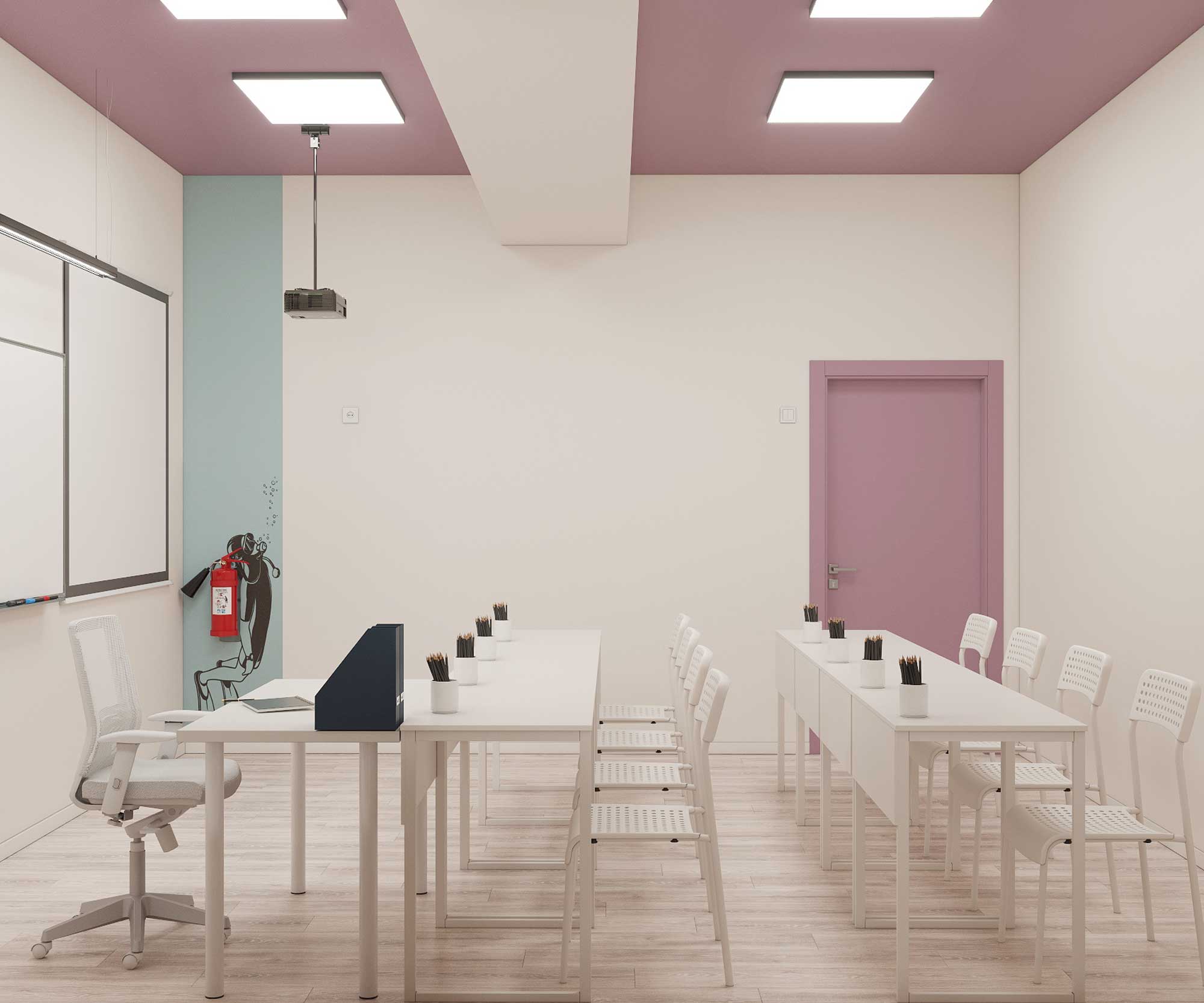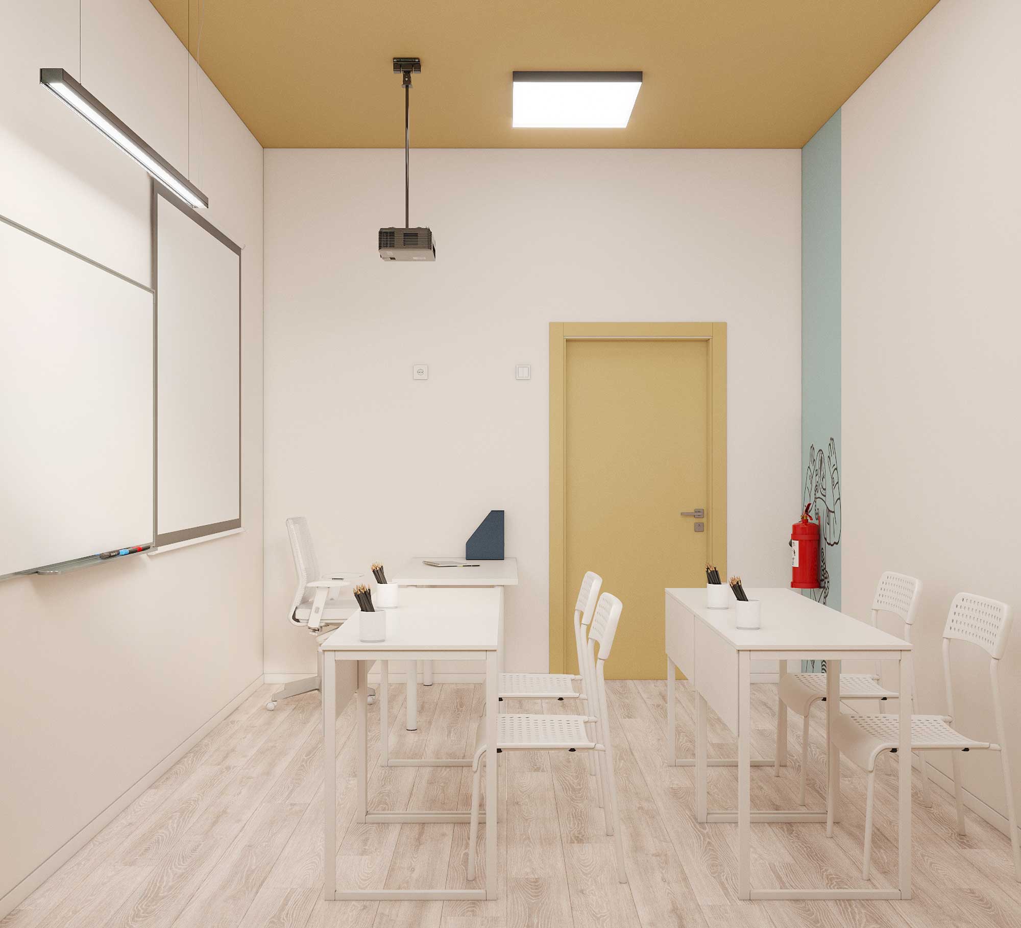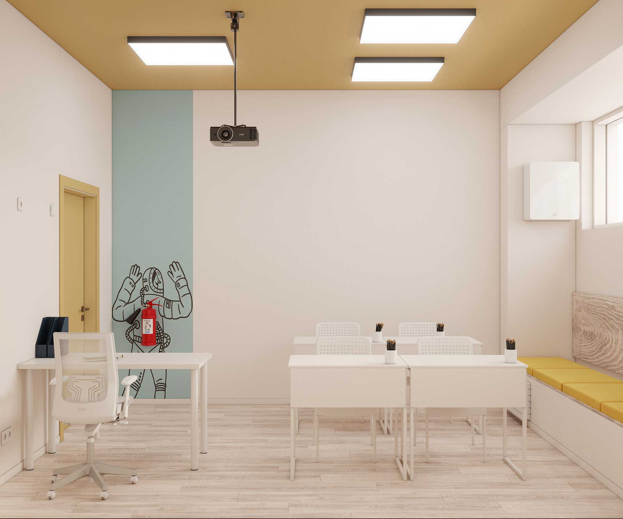 Проект представляет собой комплексное интерьерное решение для частного детского образовательного центра. Пространство спроектировано для школьников разных возрастов: от младших классов до учеников среднего и старшего звена, готовящихся к экзаменам и углубленному изучению предметов. В планировке также предусмотрены функциональные зоны, такие как кабинет директора и учительская, обеспечивающие комфорт и эффективность работы персонала.