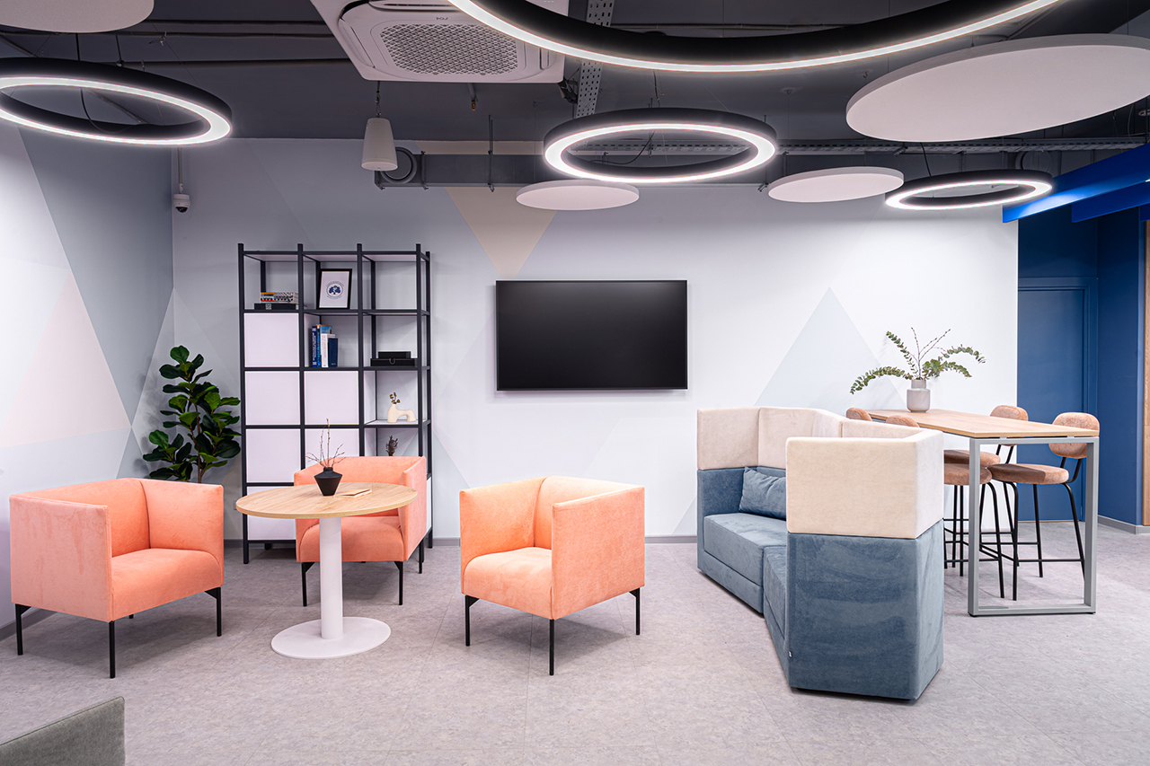 Зоны отдыха: мягкие кресла и диваны создают комфортные условия для неформального общения, вдохновения и перезагрузки.