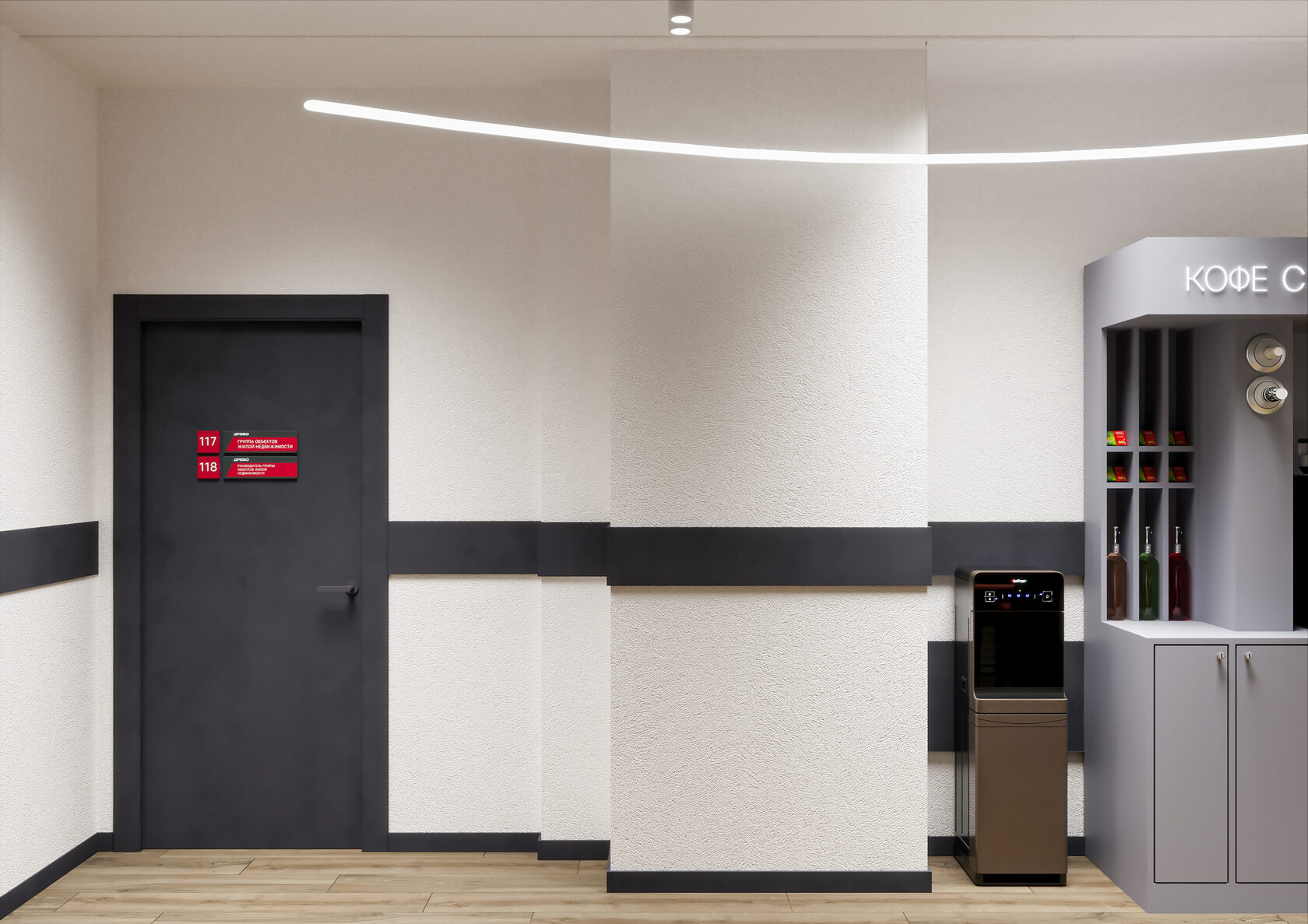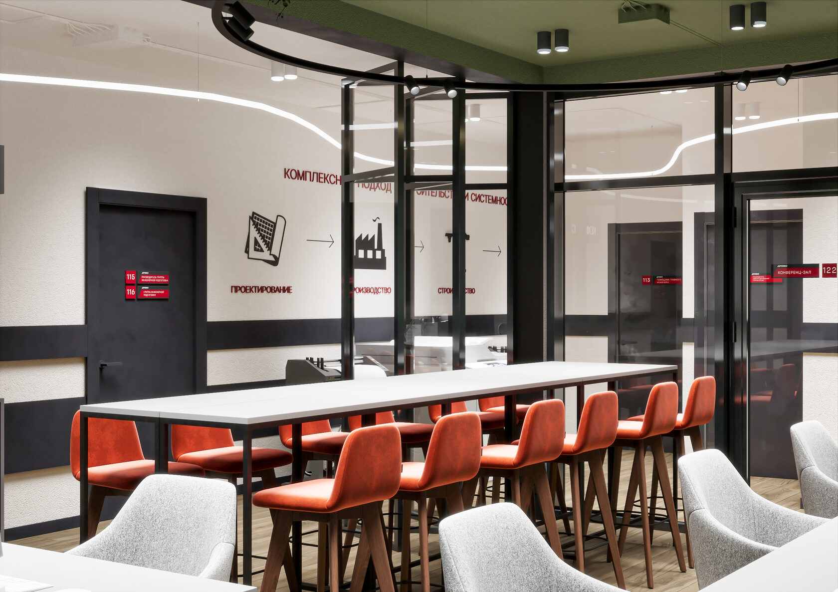 Концепция: Сочетание корпоративных стандартов, требований безопасности и современного дизайна. Цветовая палитра и архитектурные решения навеяны милитари-эстетикой без излишней строгости, создавая профессиональную и комфортную среду для диалога.
